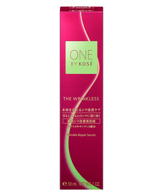 科絲(KOSÉ)No.1*1 皺紋改善項目不斷進化!改變未來的抗皺護理。_x000D_ 新一代*2 抗皺精華誕生。_x000D_ [準藥物] - 皺紋的個體差異會隨著年齡的增長而增加和加速。_x000D_高絲第一抗皺單品煥然一新,功效更強,並具有美白效果。X000D_這款改善皺紋的精華液是根據多年來對易生皺紋肌膚的研究而開發的,它將改變現在和未來。_x000D_緊緻美麗肌膚,讓肌膚緊緻有彈性。25 年來,KOSÉ 一直致力於皺紋問題的研究,終於達到了新的階段。_x000D_自高絲開始研究皺紋產生的機理以來,已經走過了 25 個年頭。_x000D_我們觀察並測量了同一人數年來的皺紋變化,並利用最新的 KOSÉ 科學進行分析,最終研製出全新的抗皺精華液。含有改善皺紋和美白活性成分 <Wrinkle White N>。_x000D_ 通過接近肌膚的上下兩層:從深層支撐肌膚的真皮層和賦予肌膚表面緊緻感的表皮層,改善皺紋。_x000D_ 該產品能深入持久地作用於眼周、嘴角、額頭和眉間等需要護理的部位,有效解決各種皺紋問題。此外,它還能抑制黑色素生成,預防斑點和雀斑。_x000D__x000D_ ● 含有高絲獨創的有效成分。_x000D_ 保溼,令肌膚緊緻。_x000D__x000D_ ● 軟化和保持彈力的配方。該配方能像蒸汽熨斗蒸過一樣,軟化並向需要護理的部位散發水分,帶來強大而持久的緊緻效果。只需使用一次,即可保持肌膚緊緻。含有改善光澤的成分。_x000D_提亮並淡化容易顯得凹陷和暗沉的皺紋。 _x000D__x000D_ - 易於每天早晚使用。_x000D_塗抹順滑,與肌膚形成一層光滑的薄膜。_x000D_早上化妝前使用非常簡單,因為它很容易融合,而且不油膩。_x000D__x000D_ ● 舒適的綠色花香。_x000D_● 無色。橙色是蝦青素的天然顏色。_x000D_ ● 經過過敏測試。 並非所有人都會過敏。_x000D__x000D_*1 按累計銷售量計算 _x000D_*2 品牌內 _x000D__x000D_[成分] _x000D_[抗皺美白活性成分] Wrinkle White N _x000D_[保溼成分] W-Astaxanthin S_x000D_(高濃度*3) _x000D_...蝦青素、印楝葉提取物、殼姜葉提取物、濃縮甘油)_x000D_*3 與傳統產品相比_x000D_[保溼成分] 低分子膠原蛋白、發酵透明質酸、低分子彈性蛋白、乙酰羥脯氨酸、馬鬱蘭提取物、濃縮甘油_x000D_[光澤改善成分] 大米大米胚芽油和角鯊烷_x000D_[加速滲透成分*4]*4 對角質層的滲透_x000D__x000D_* Wrinkle White N 是煙酰胺,蝦青素是蝦青素 H,低分子膠原蛋白是水解膠原蛋白粉,發酵透明質酸是酵母培養上清液,低分子彈力素是 Brielastin,乙酰羥脯氨酸是 N-乙酰-L-羥脯氨酸,馬鬱蘭提取物是 Mayolana 提取物,滲透增強成分是油酸乙酯和 2-辛基十二醇。 _x000D__x000D_ [商品名稱:ONE BY KOSÉ The Linkless S]_x000D__x000D_ ▽大號可在此購買_x000D_◆The Linkless S <30g>:8,140日元(含稅)使用方法 取適量於指尖,均勻塗抹於需要護理的部位。