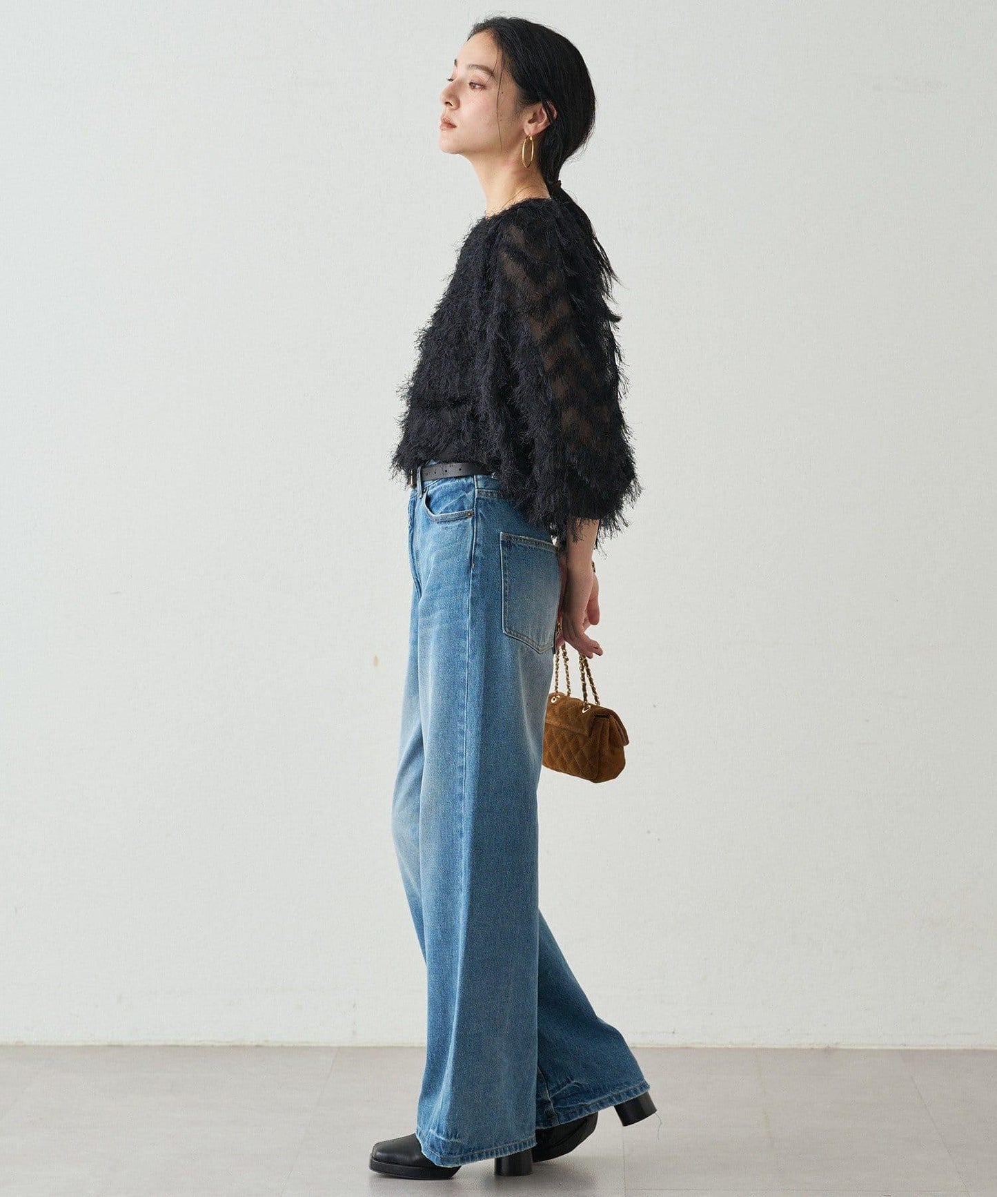 高腰牛仔褲,拉長腿部線條效果極佳