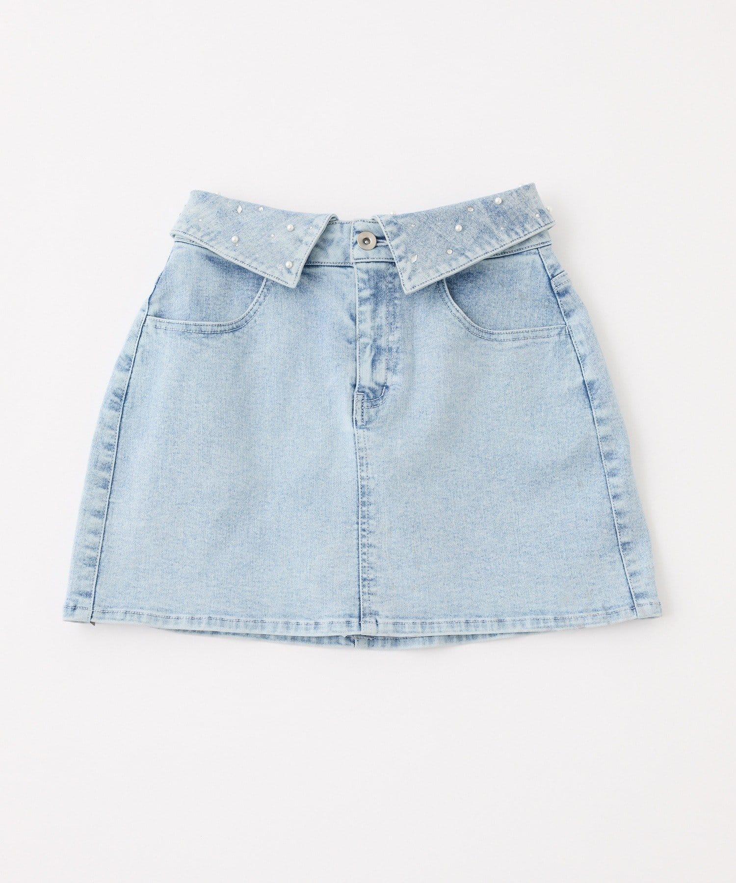 時尚的牛仔迷你裙,腰部摺疊設計引人注目。