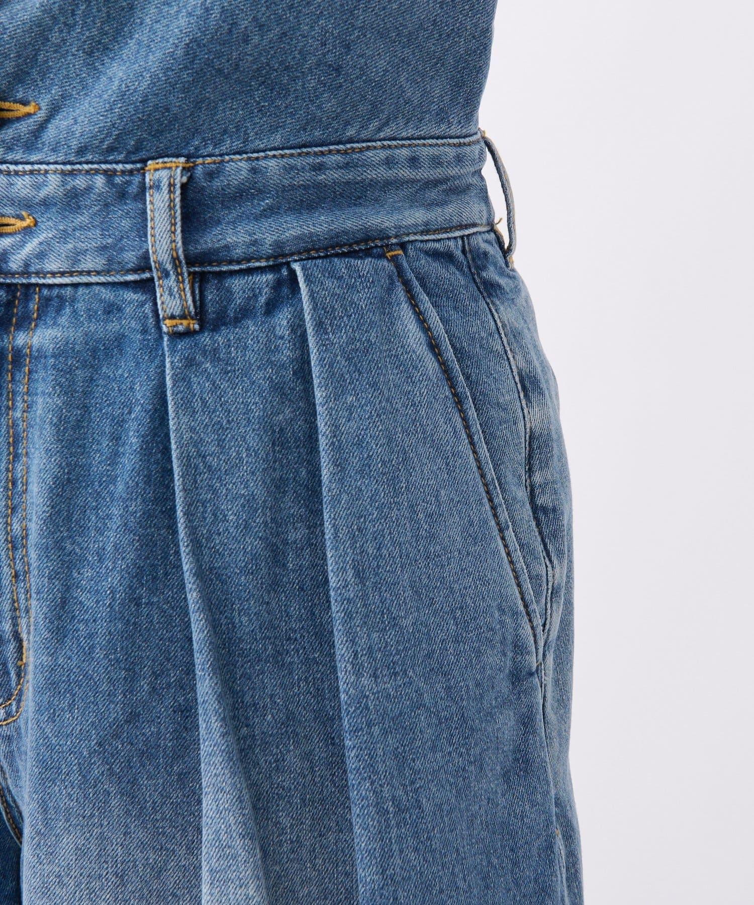 這款寬鬆牛仔長褲採用收腰設計。