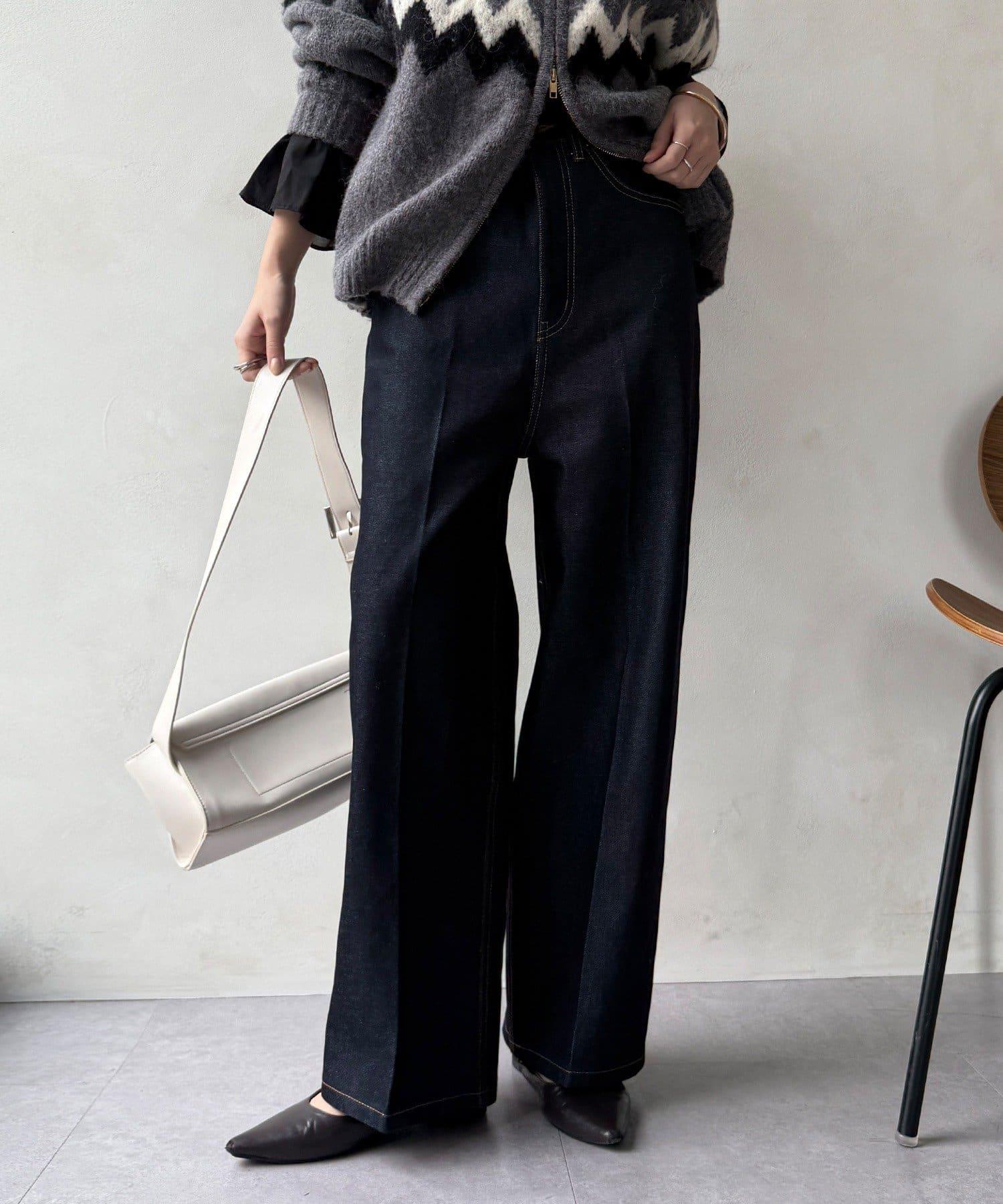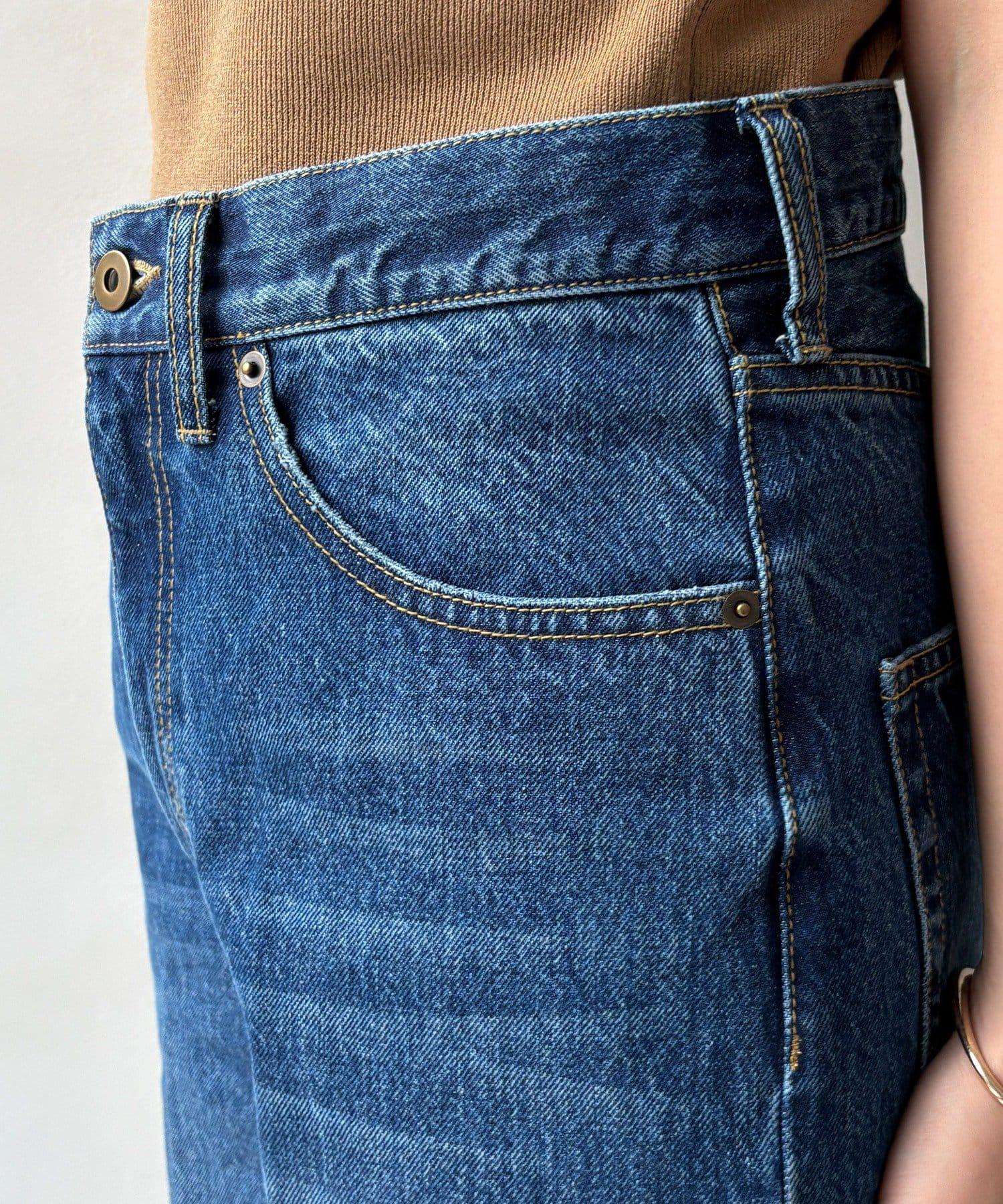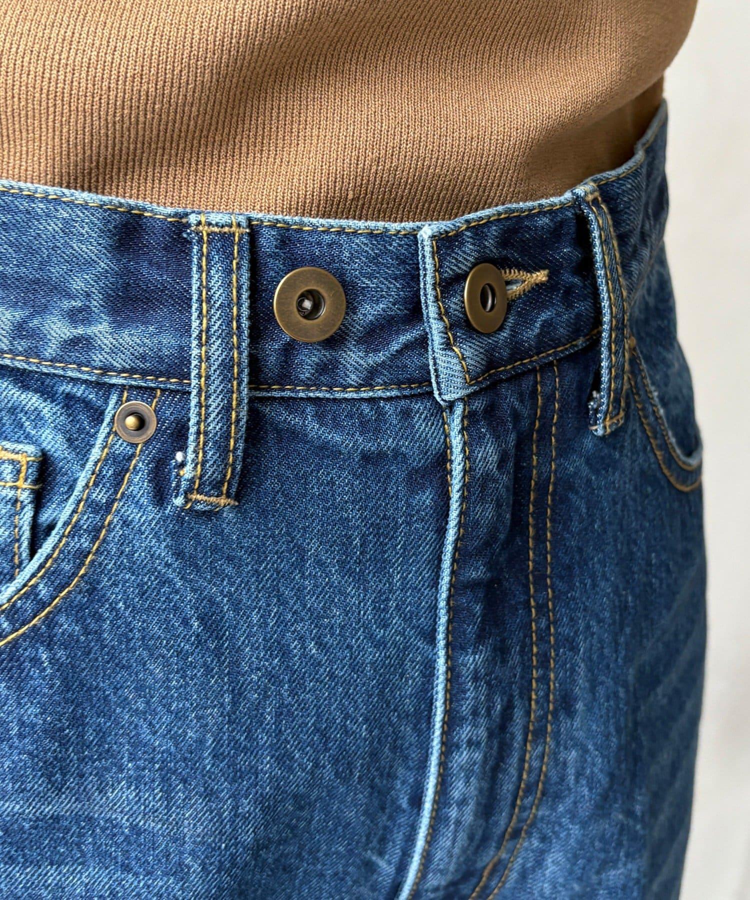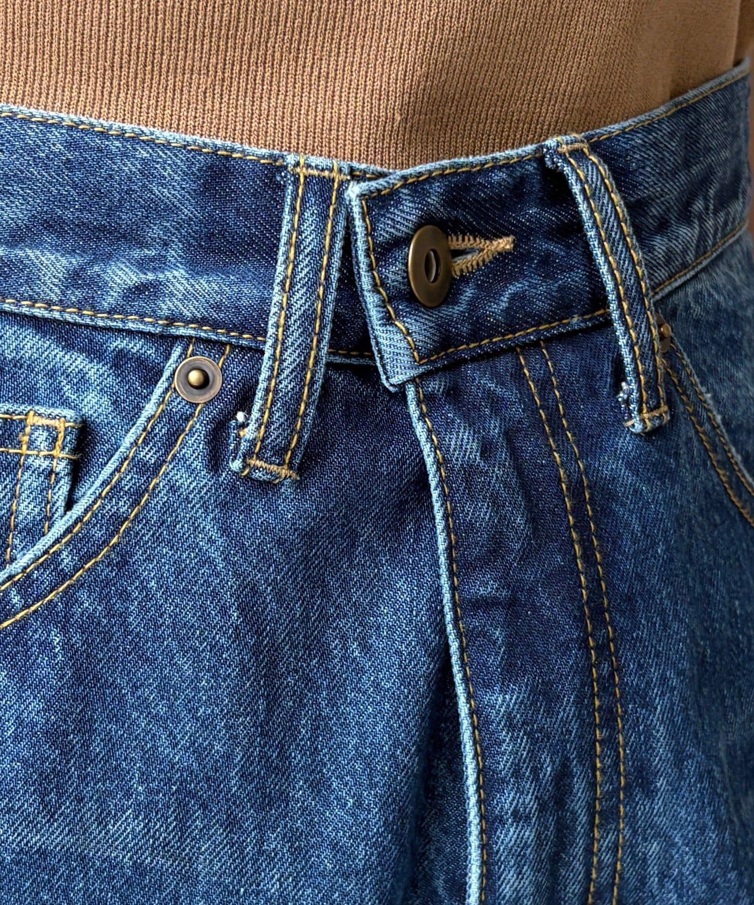 前幅中間的壓線設計強調了垂直線條。雖然是休閒牛仔布料,卻給人一種美腿的精緻印象。