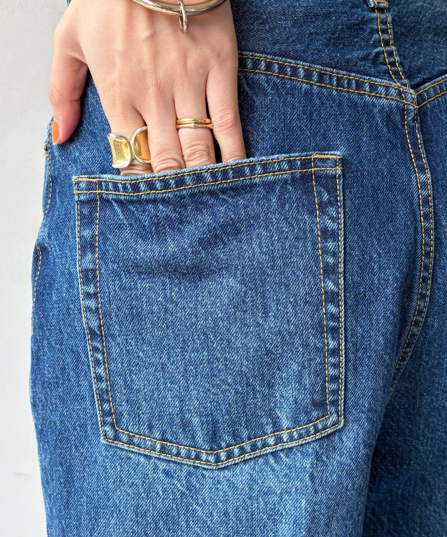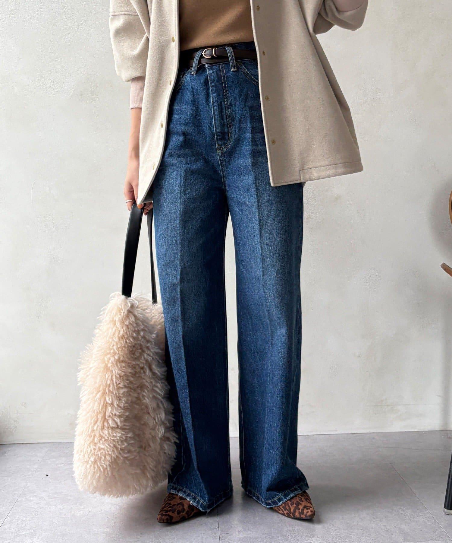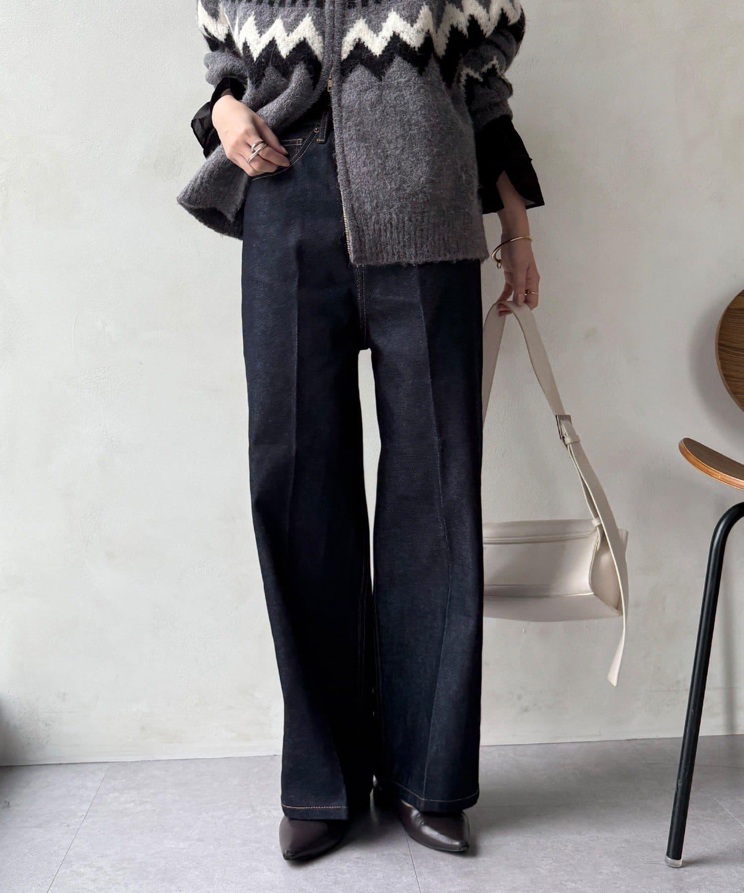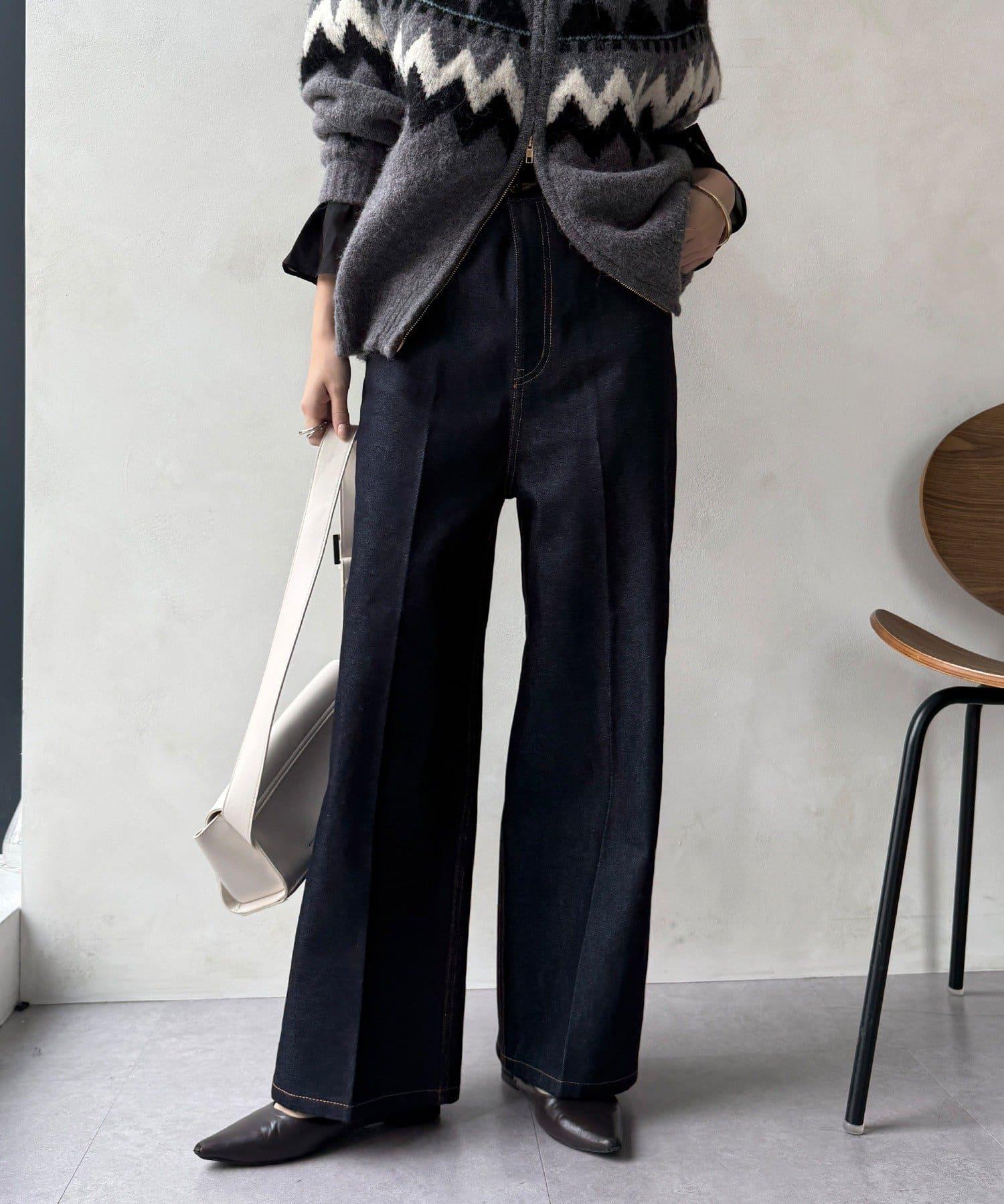 前幅中間的壓線設計強調了垂直線條。雖然是休閒牛仔布料,卻給人一種美腿的精緻印象。