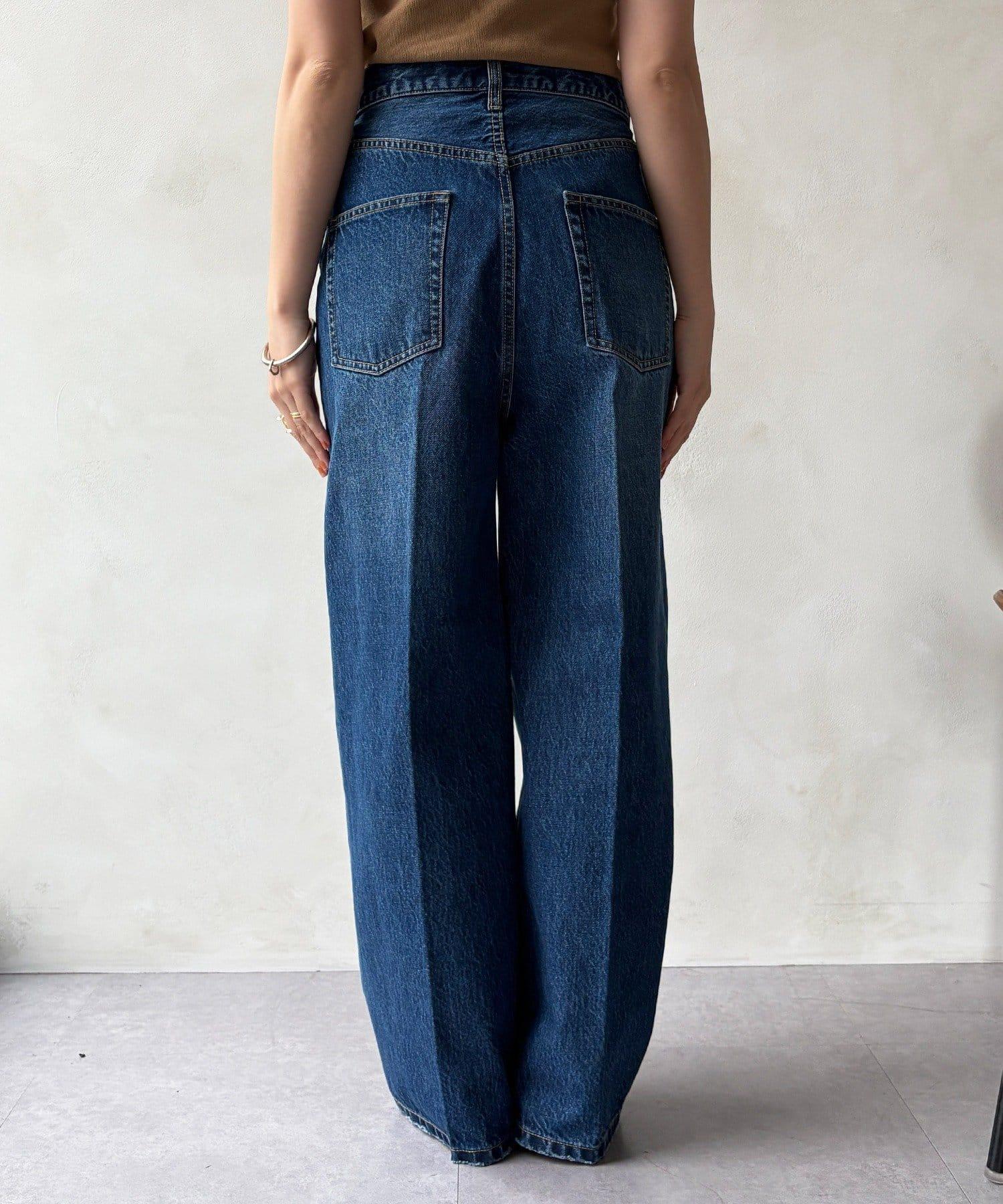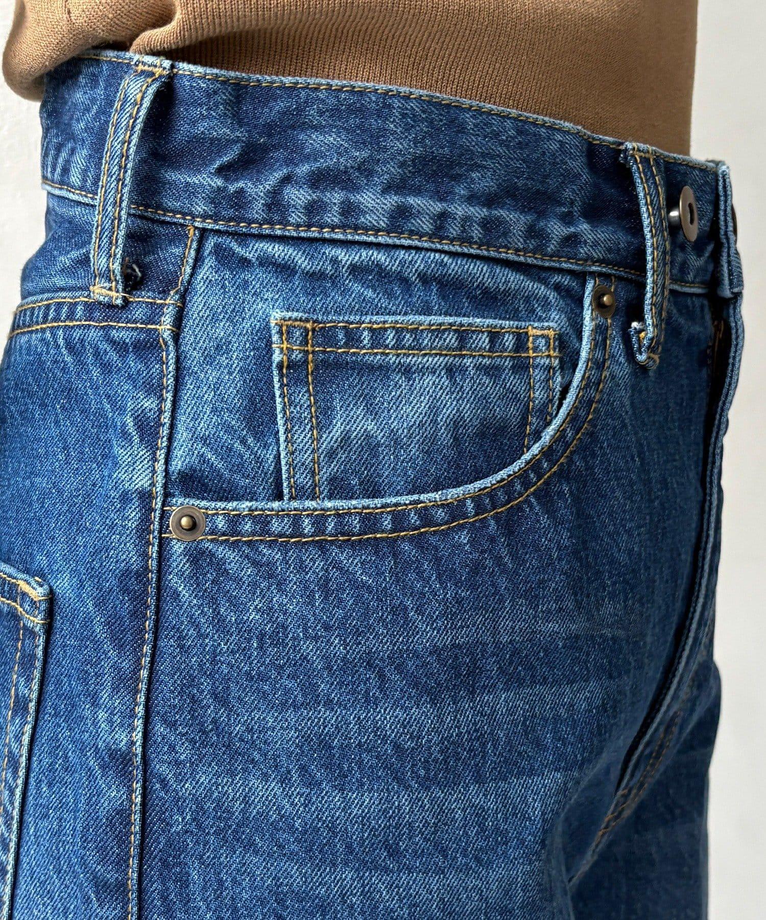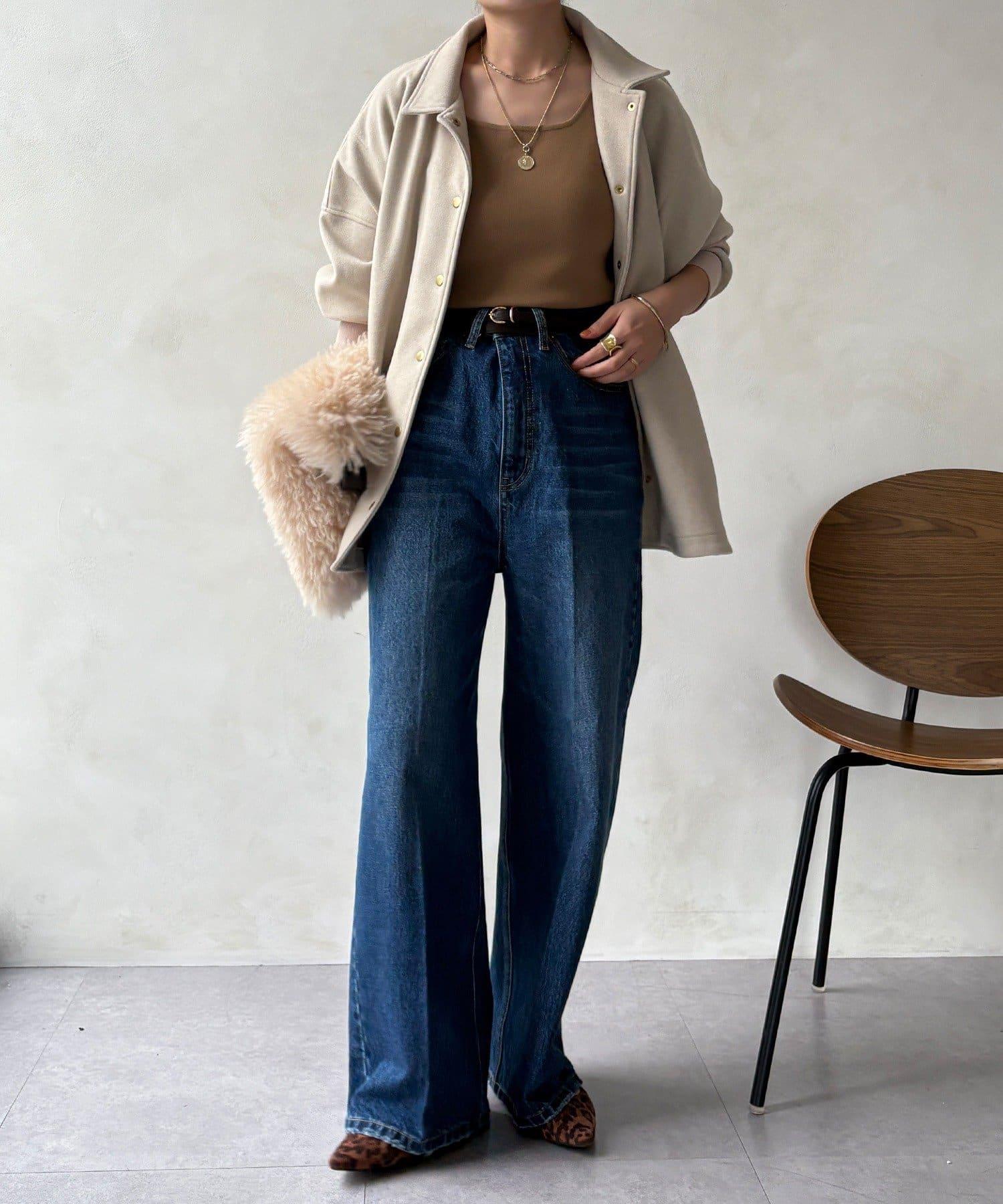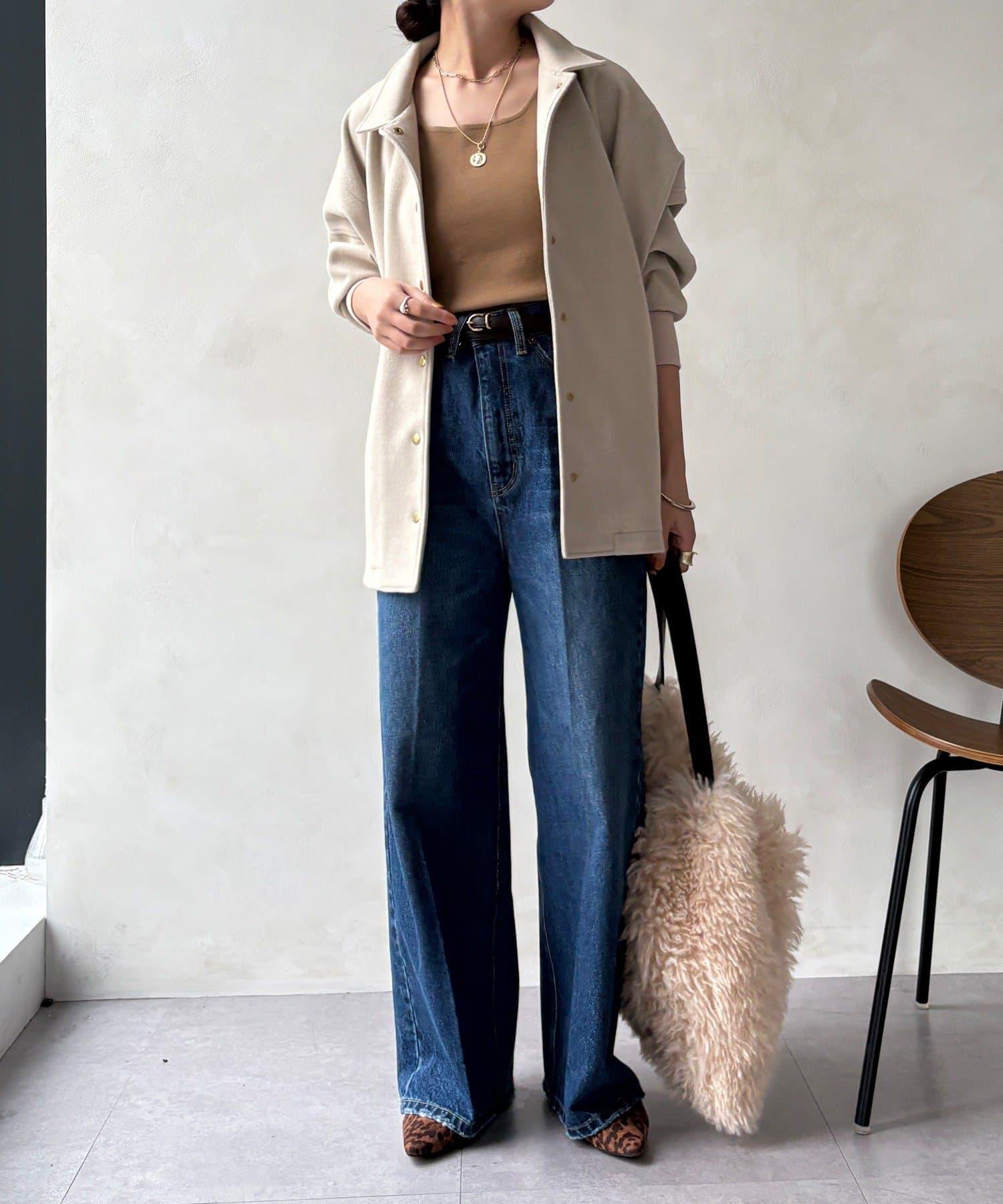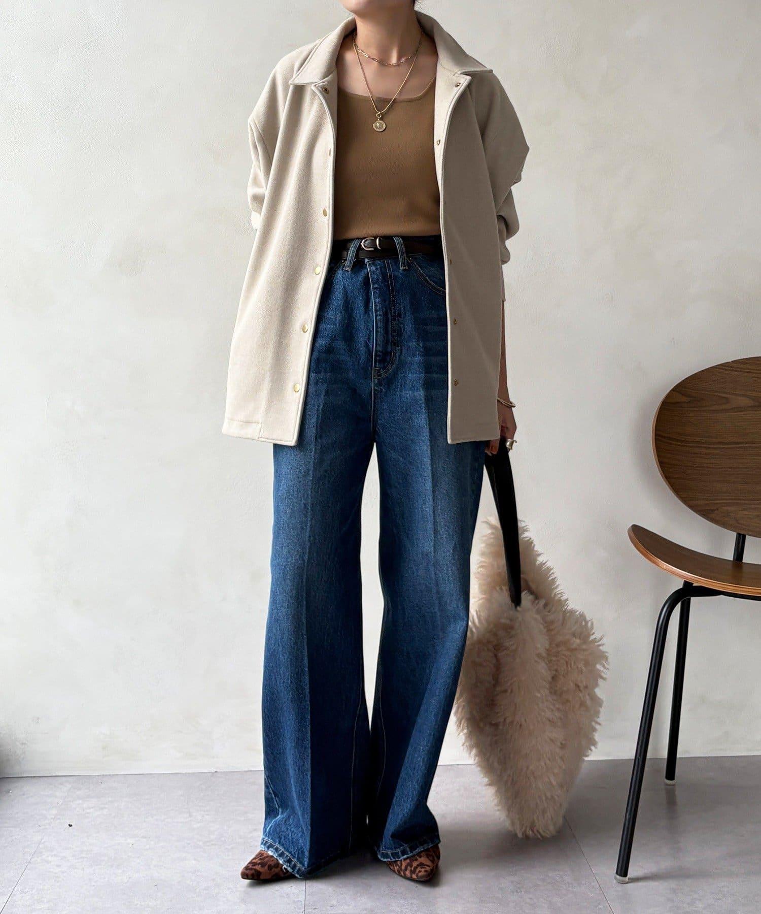 前幅中間的壓線設計強調了垂直線條。雖然是休閒牛仔布料,卻給人一種美腿的精緻印象。