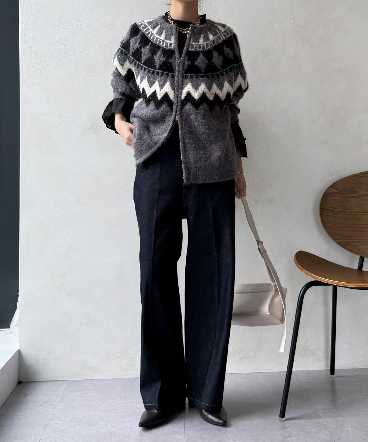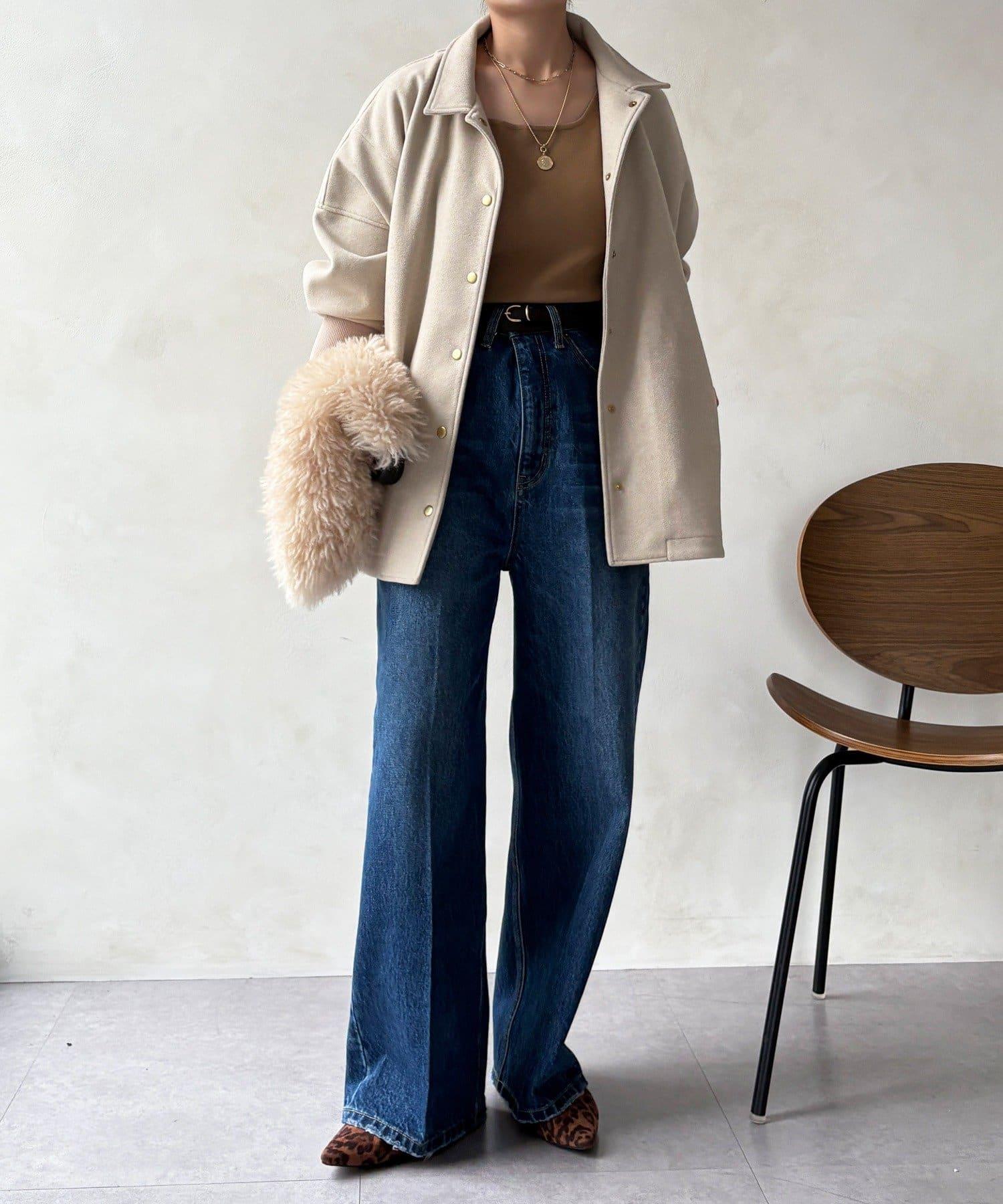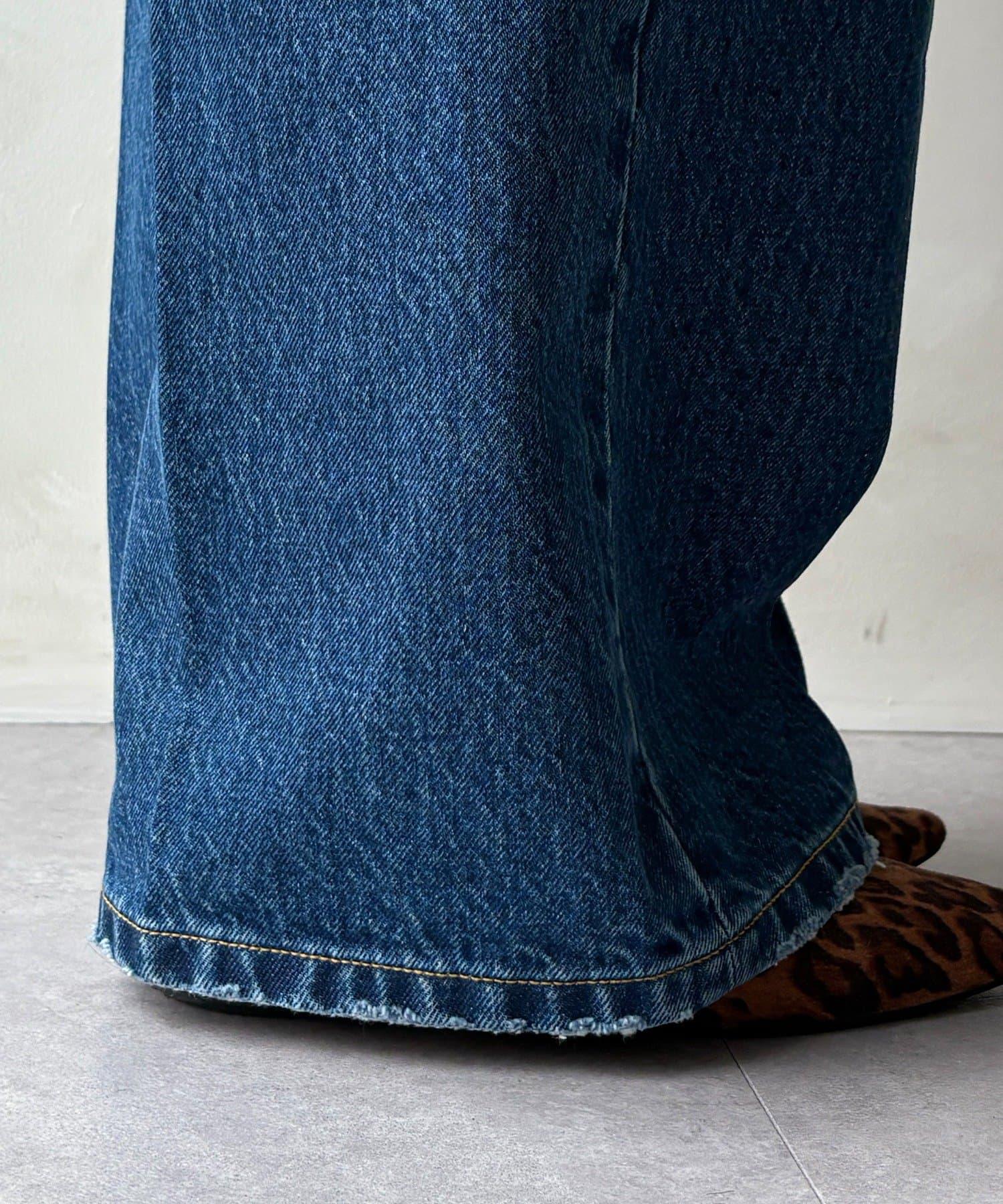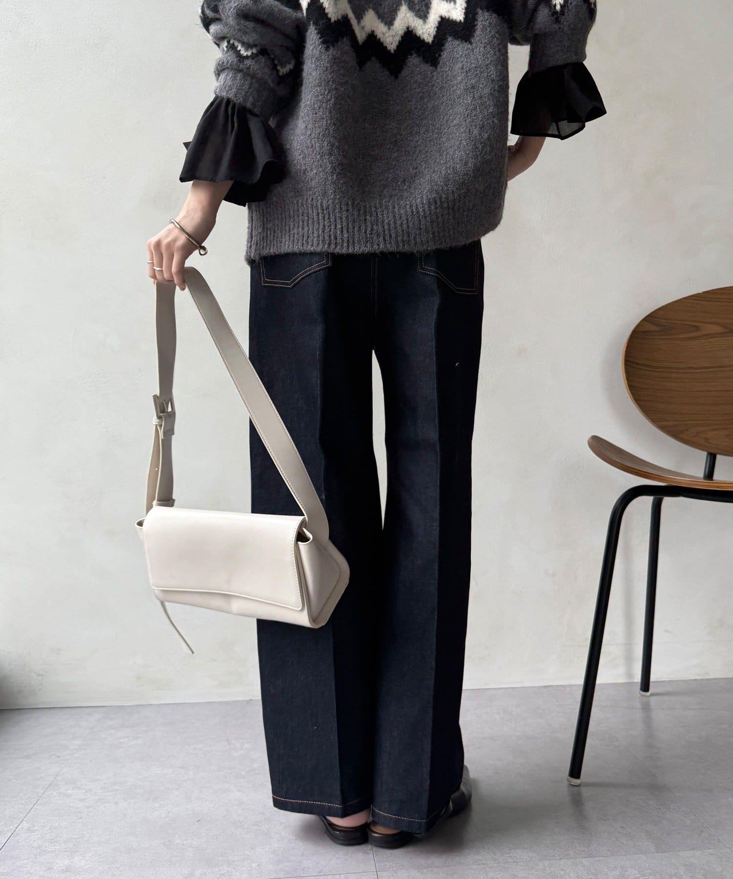 前幅中間的壓線設計強調了垂直線條。雖然是休閒牛仔布料,卻給人一種美腿的精緻印象。