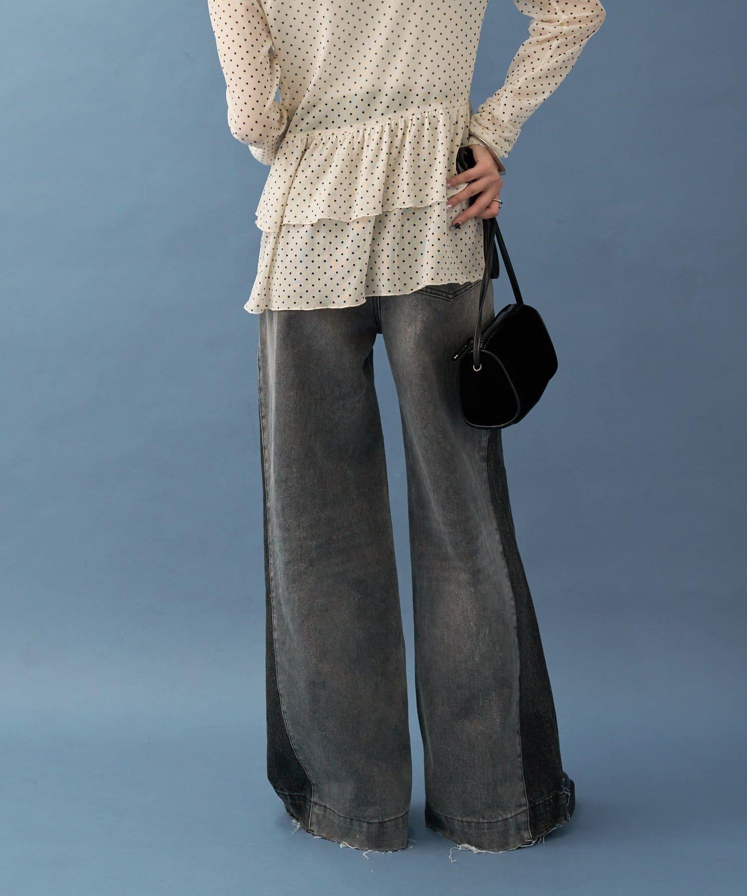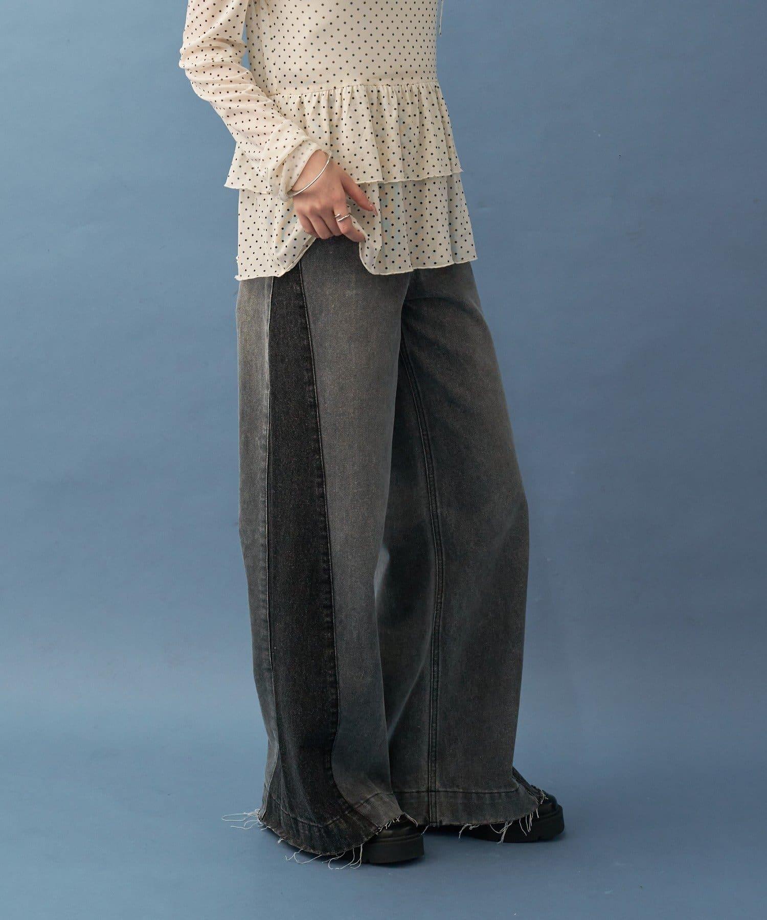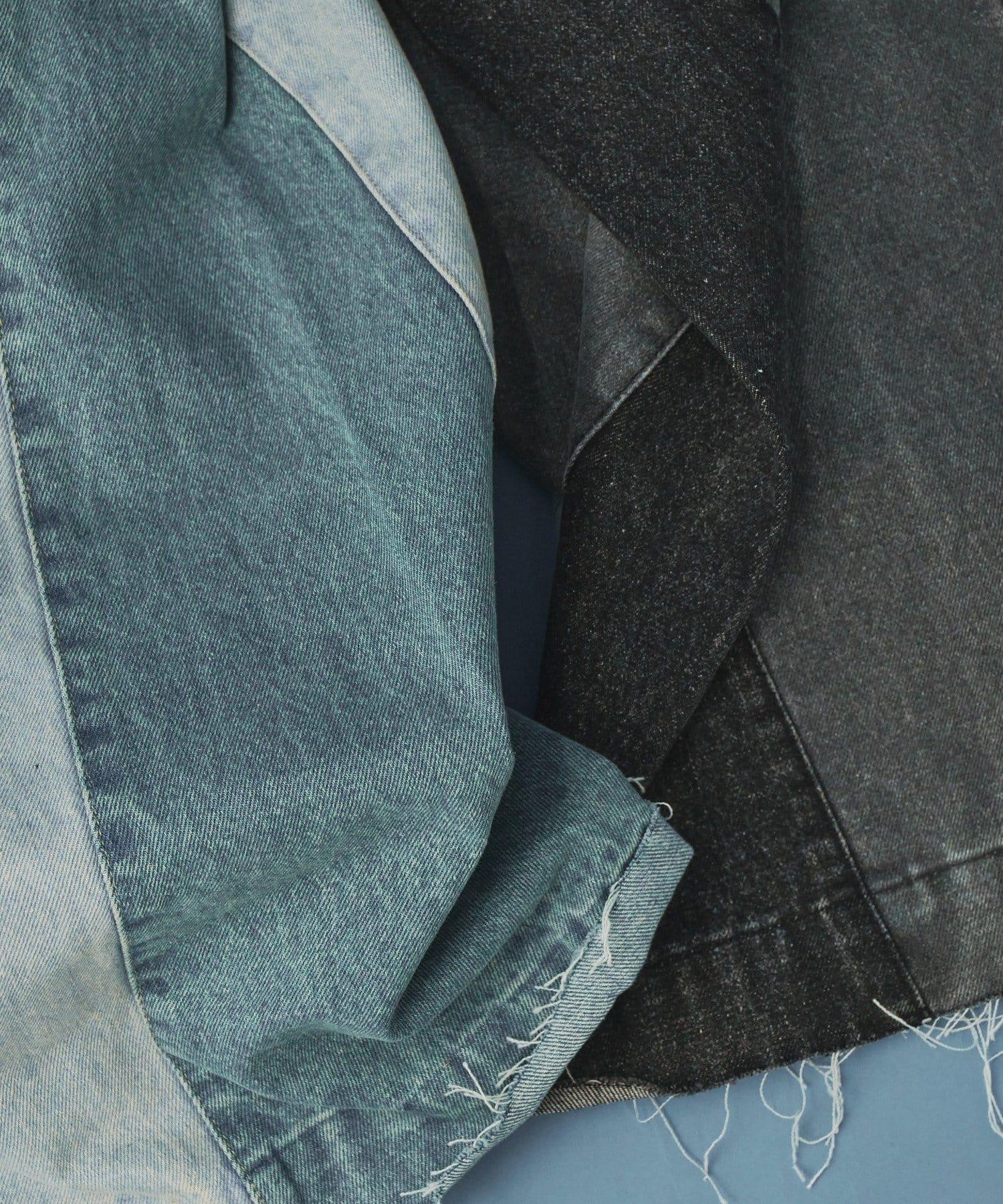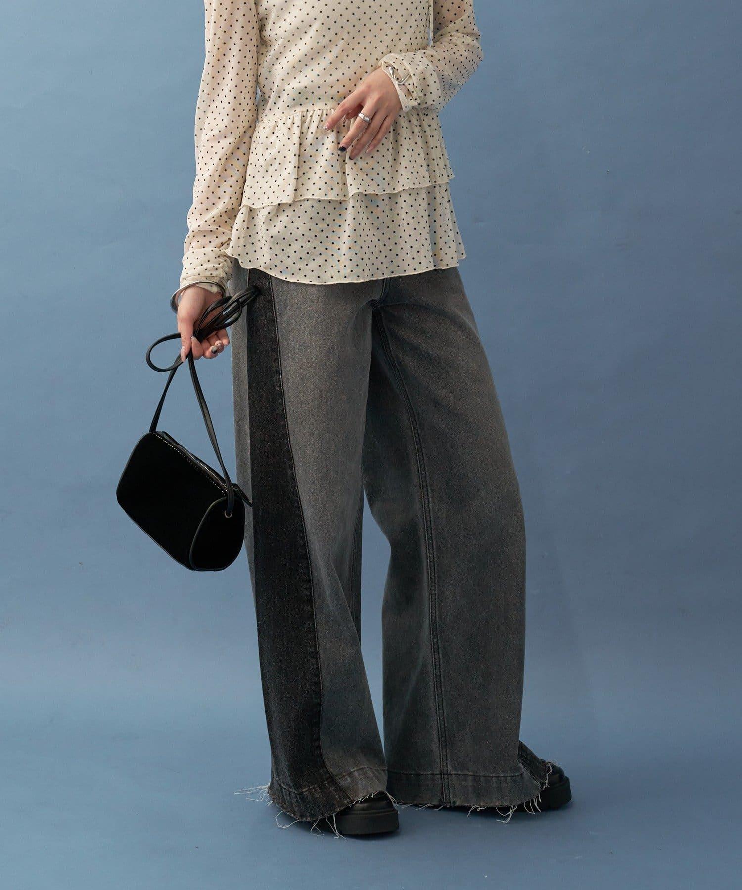 面板切換式牛仔布採用醒目的面板設計。黑藍兩色便於搭配上衣。
