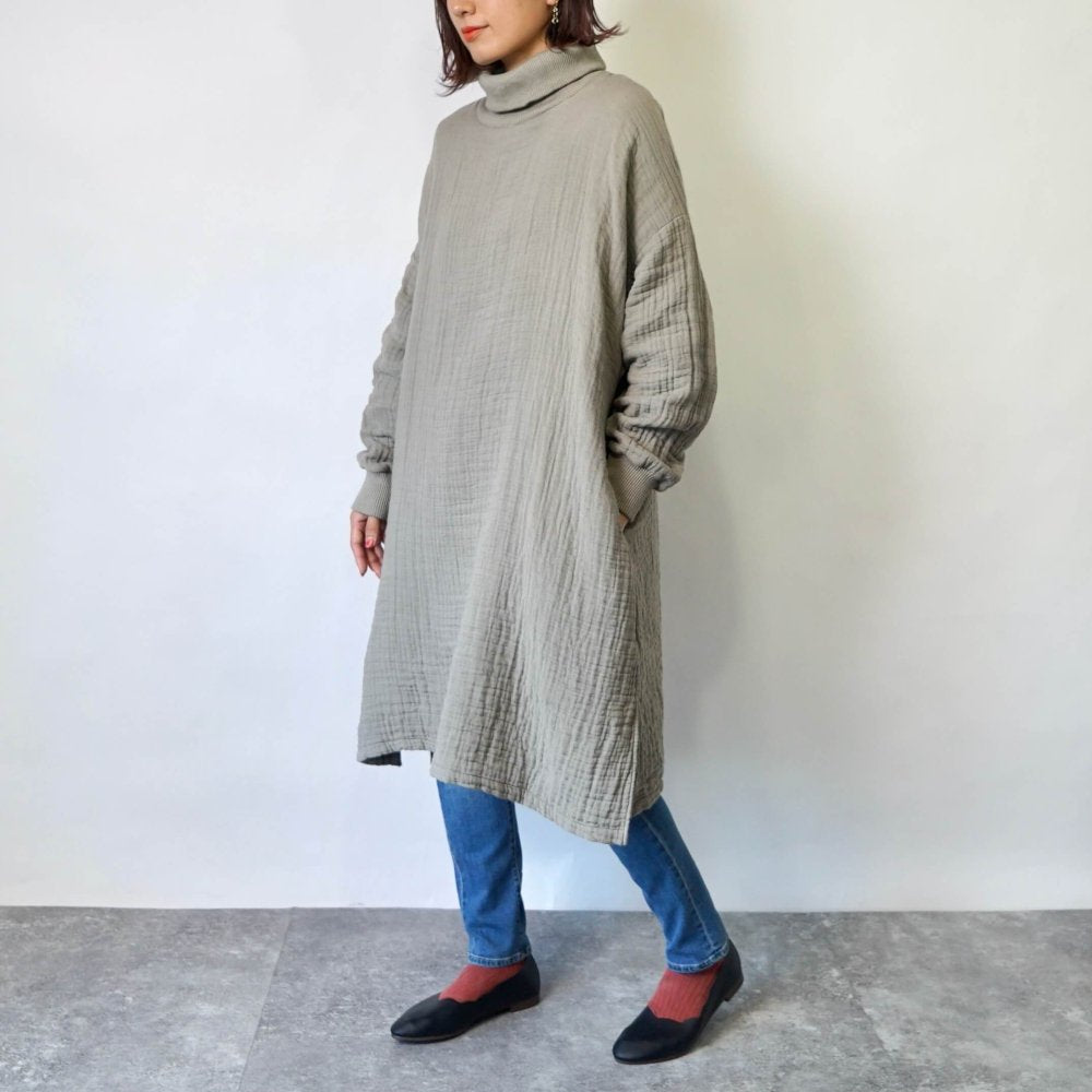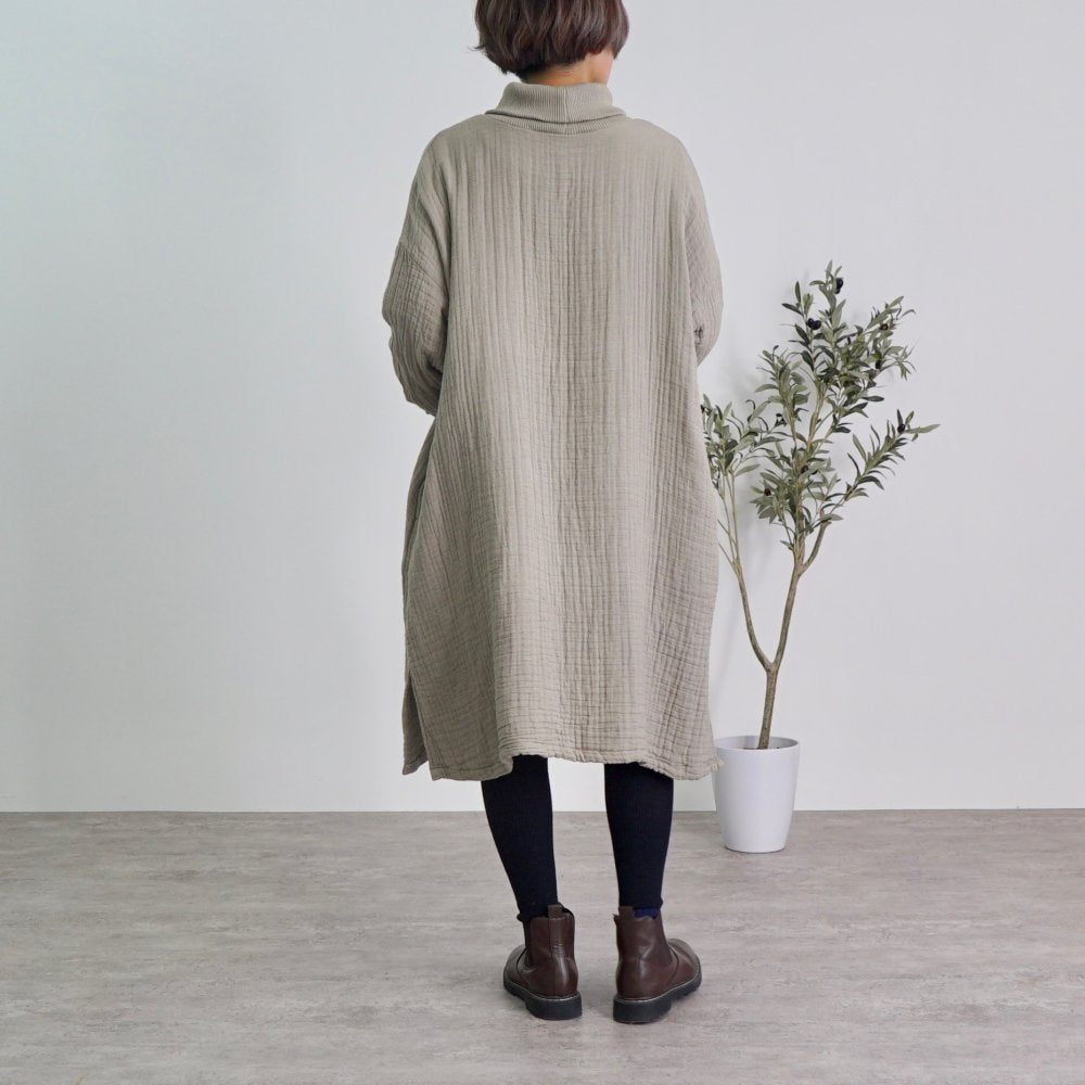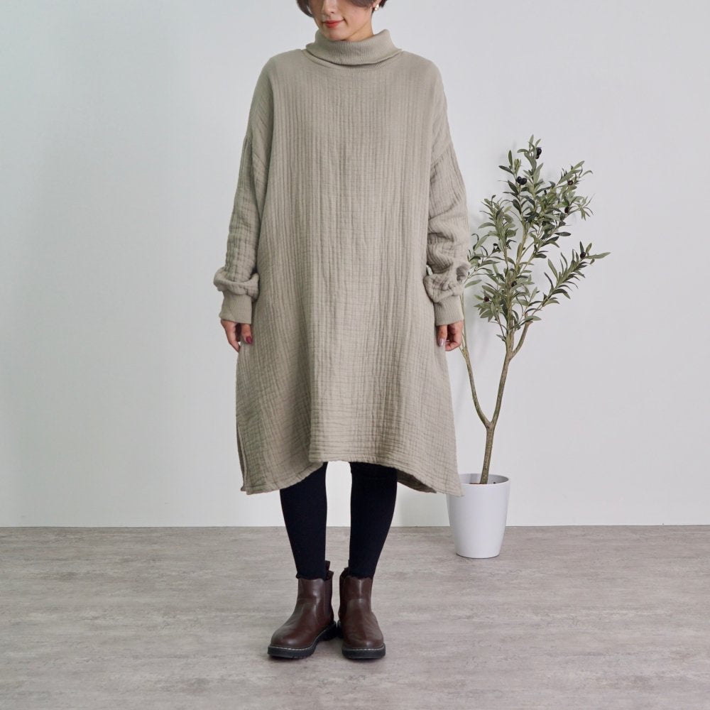 高領連衣裙 毛絨6層紗布/卡其色/三河織物