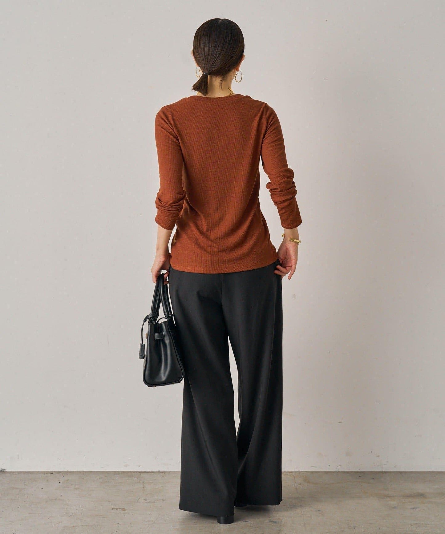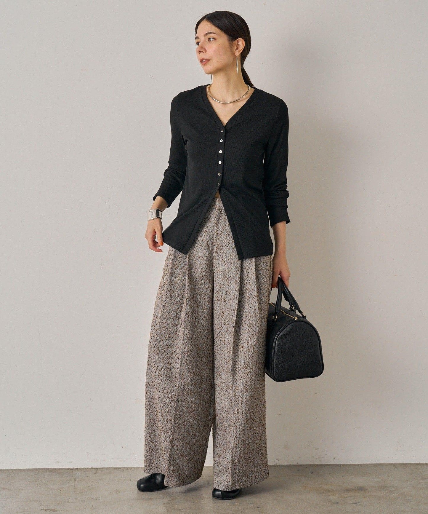 開衫的長度巧妙地遮住了腰部。