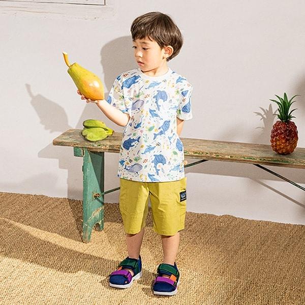 側袋上有鯊魚圖案的編織名稱,是一個巧妙的參考點。