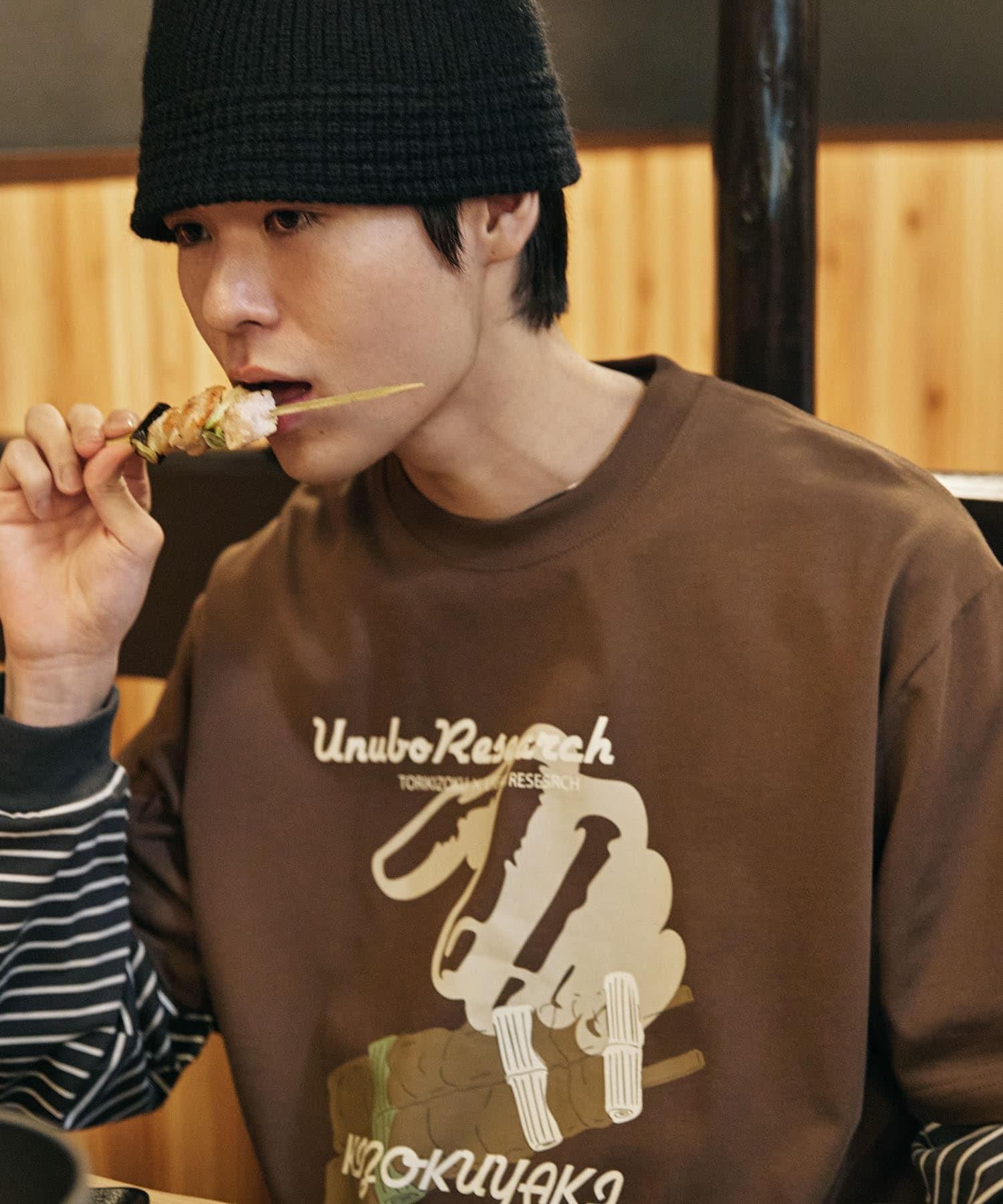 在這次合作中,Urban Research 創建了一個名為 "UnuboResearch "的虛構品牌,超越了現有的品牌形象,並在 T 恤、長 T 恤和運動衫中加入了新繪製的圖案,將服裝和烤雞肉串交織在一起。
