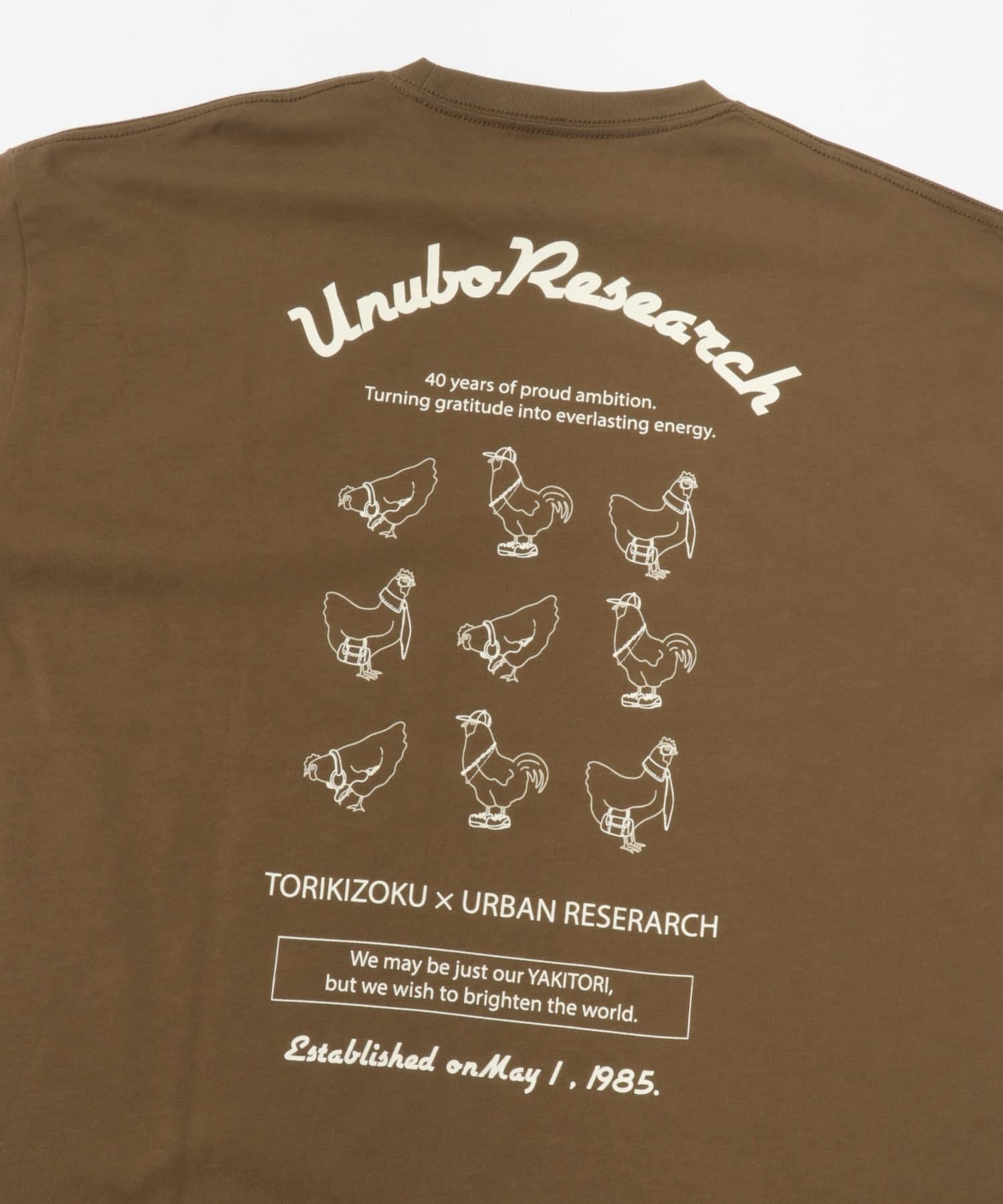 在這次合作中,Urban Research 創建了一個名為 "UnuboResearch "的虛構品牌,超越了現有的品牌形象,並在 T 恤、長 T 恤和運動衫中加入了新繪製的圖案,將服裝和烤雞肉串交織在一起。