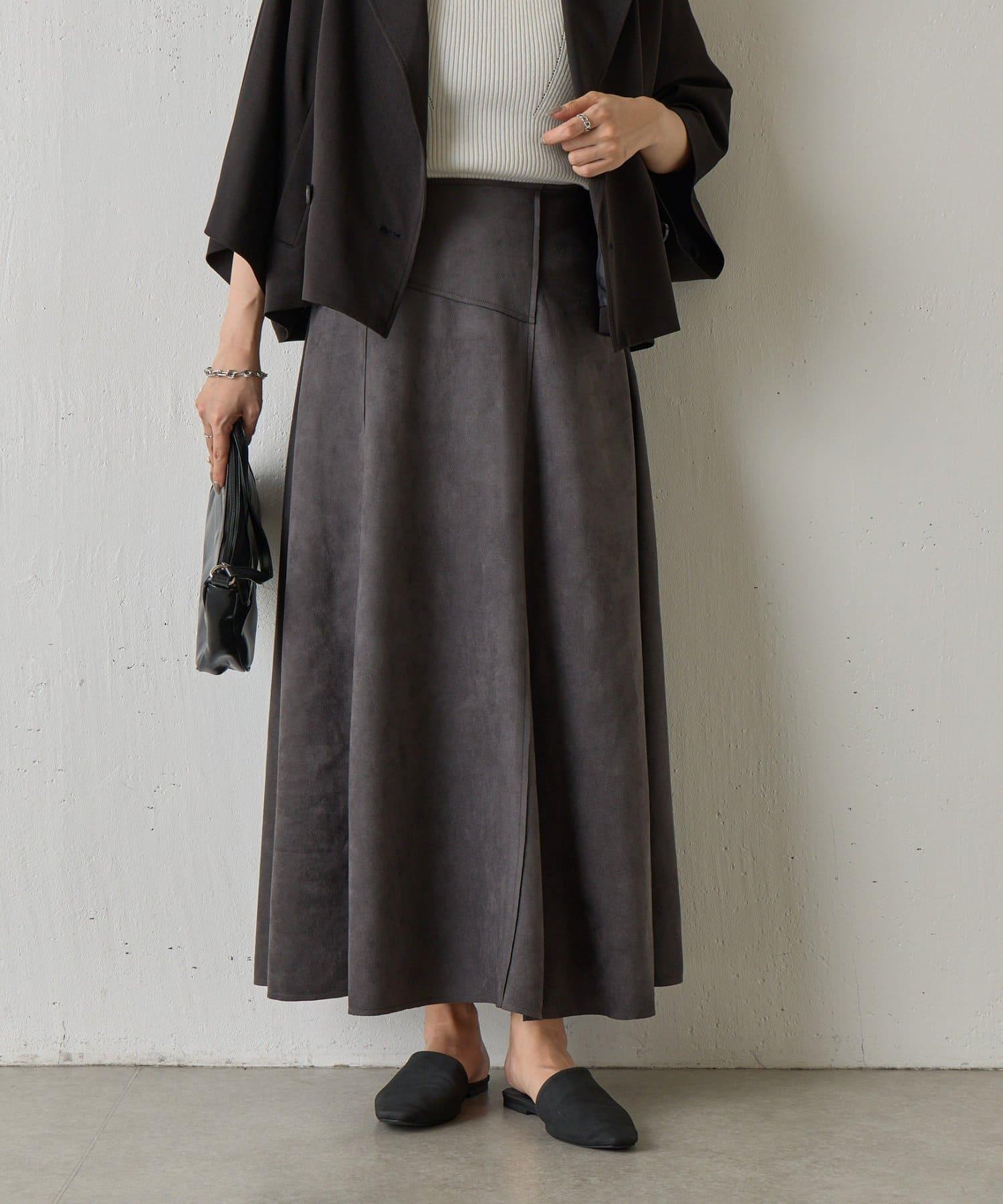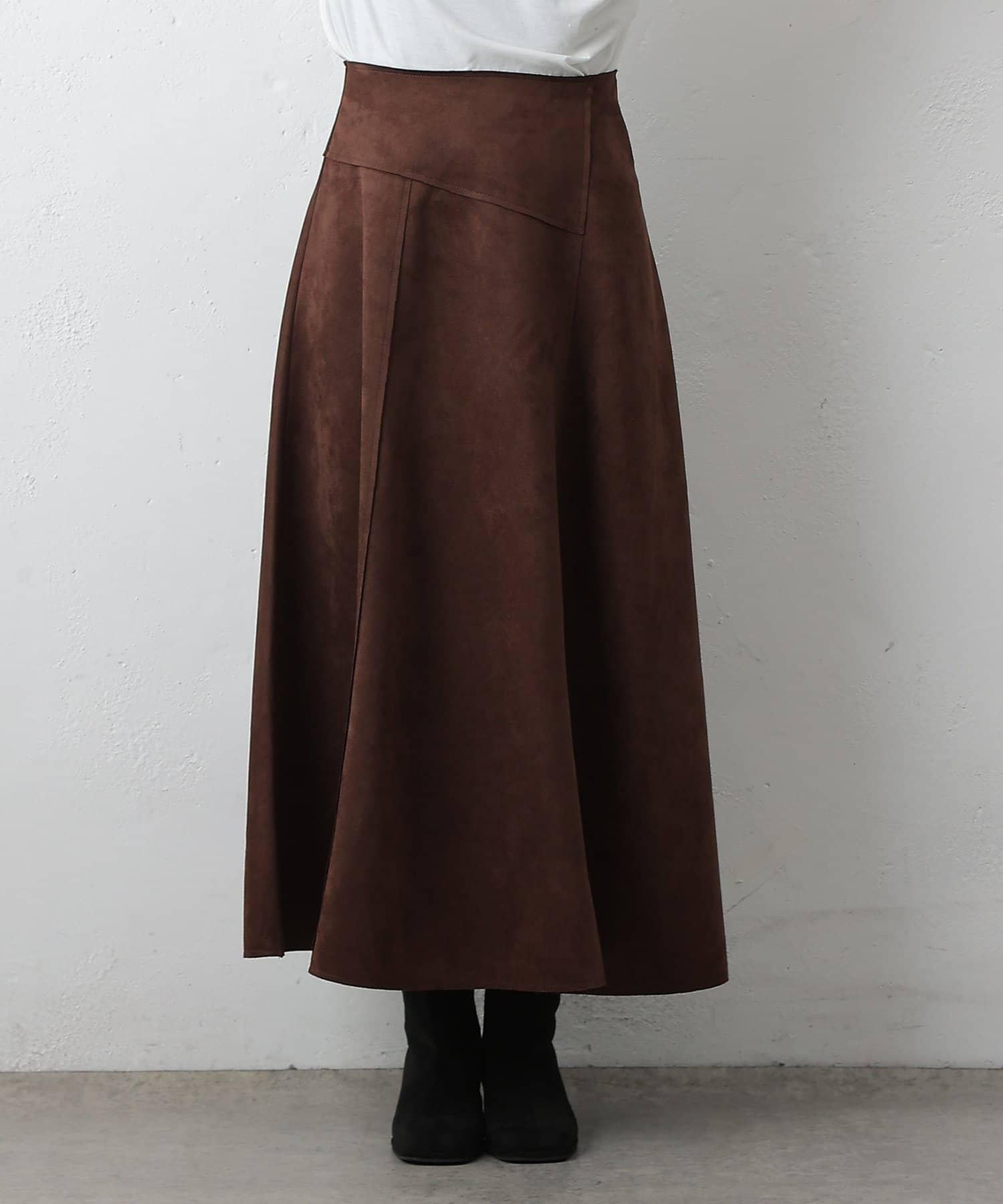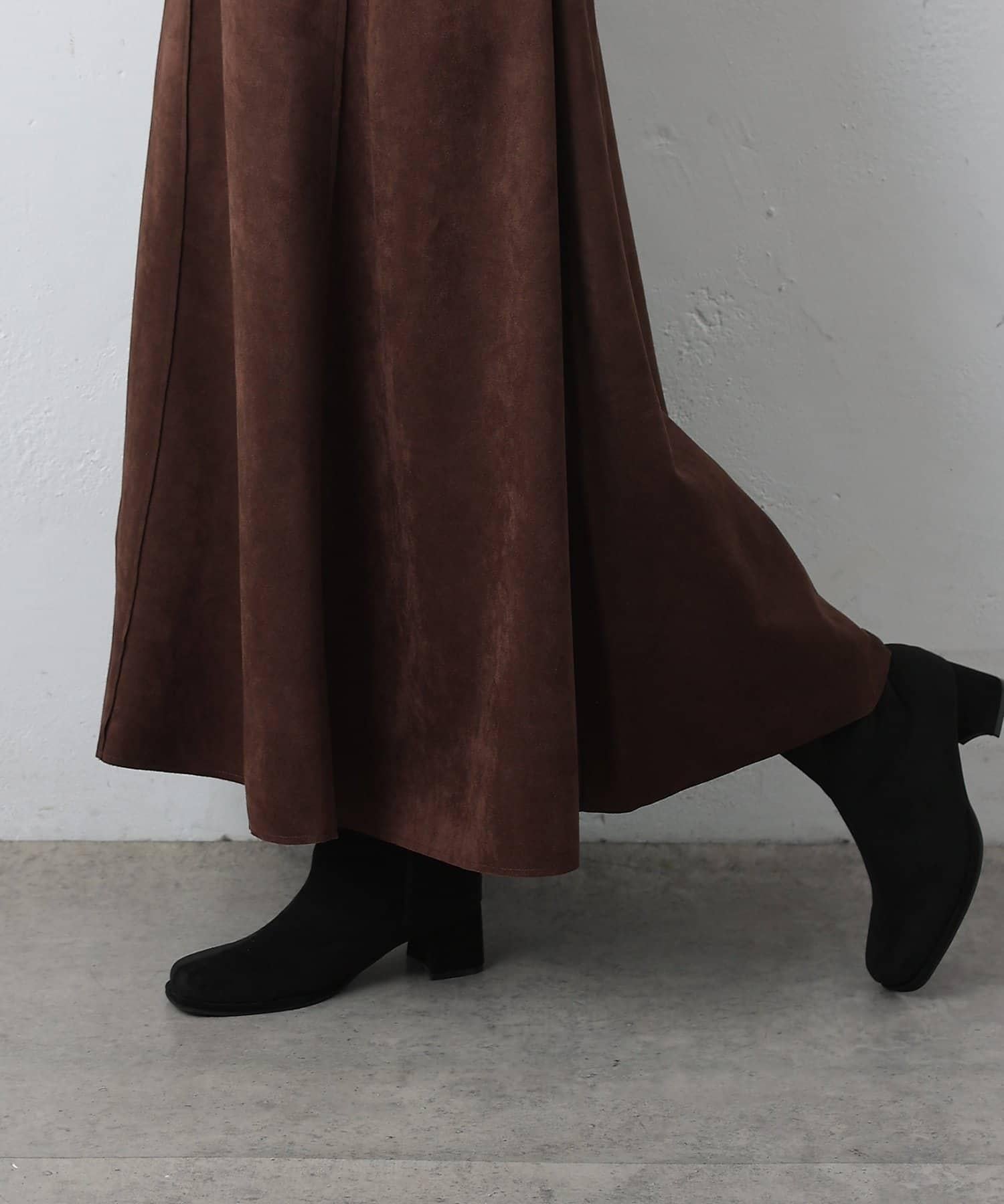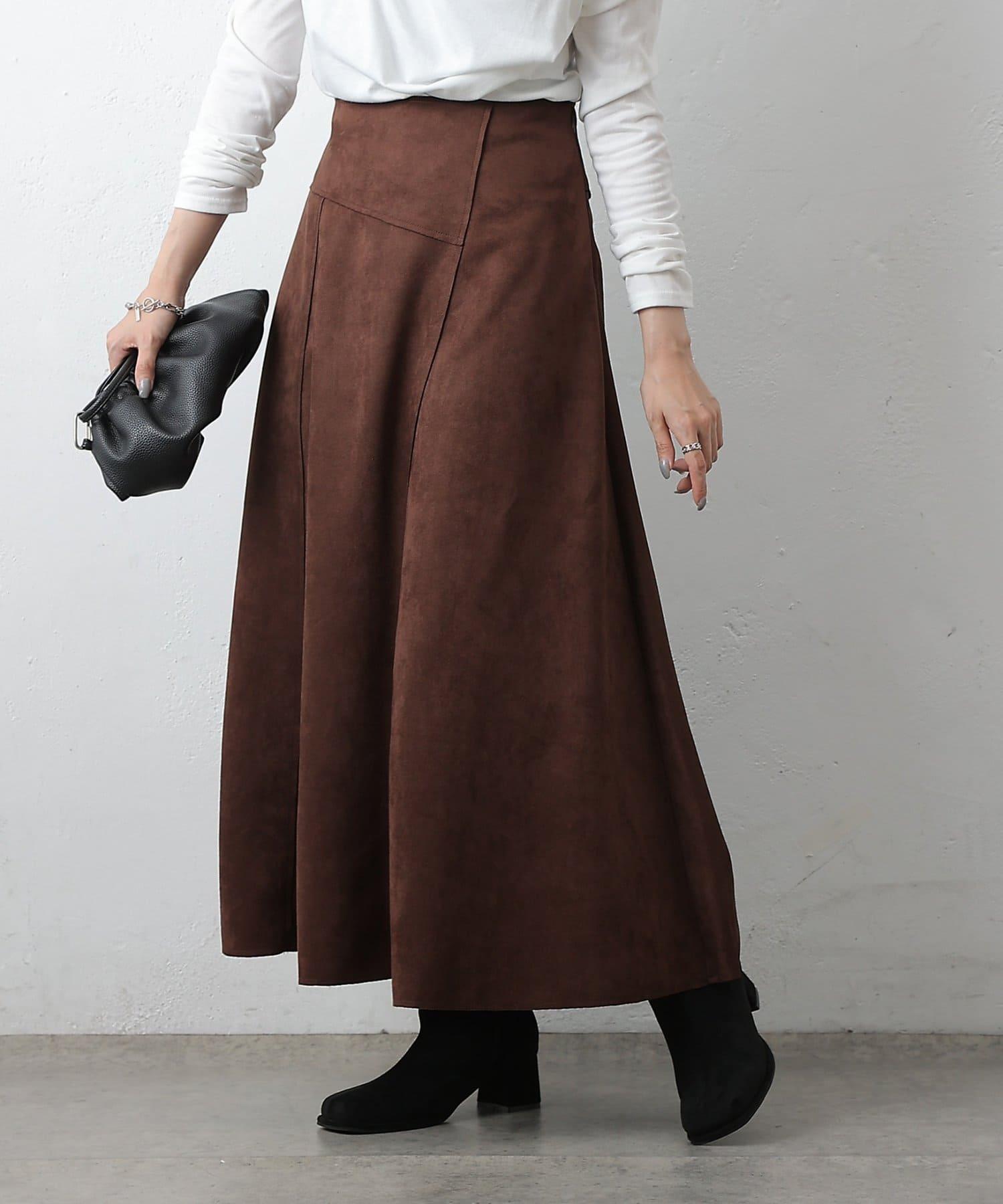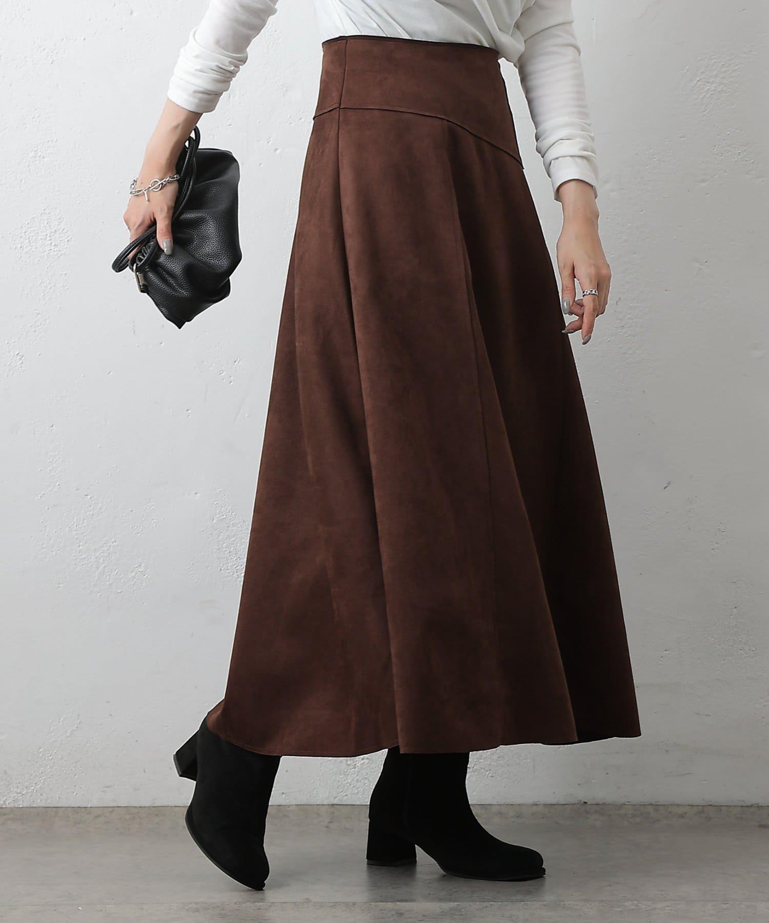 麂皮絨面料製成的喇叭裙,手感溼潤,光澤優雅,極具女性魅力。