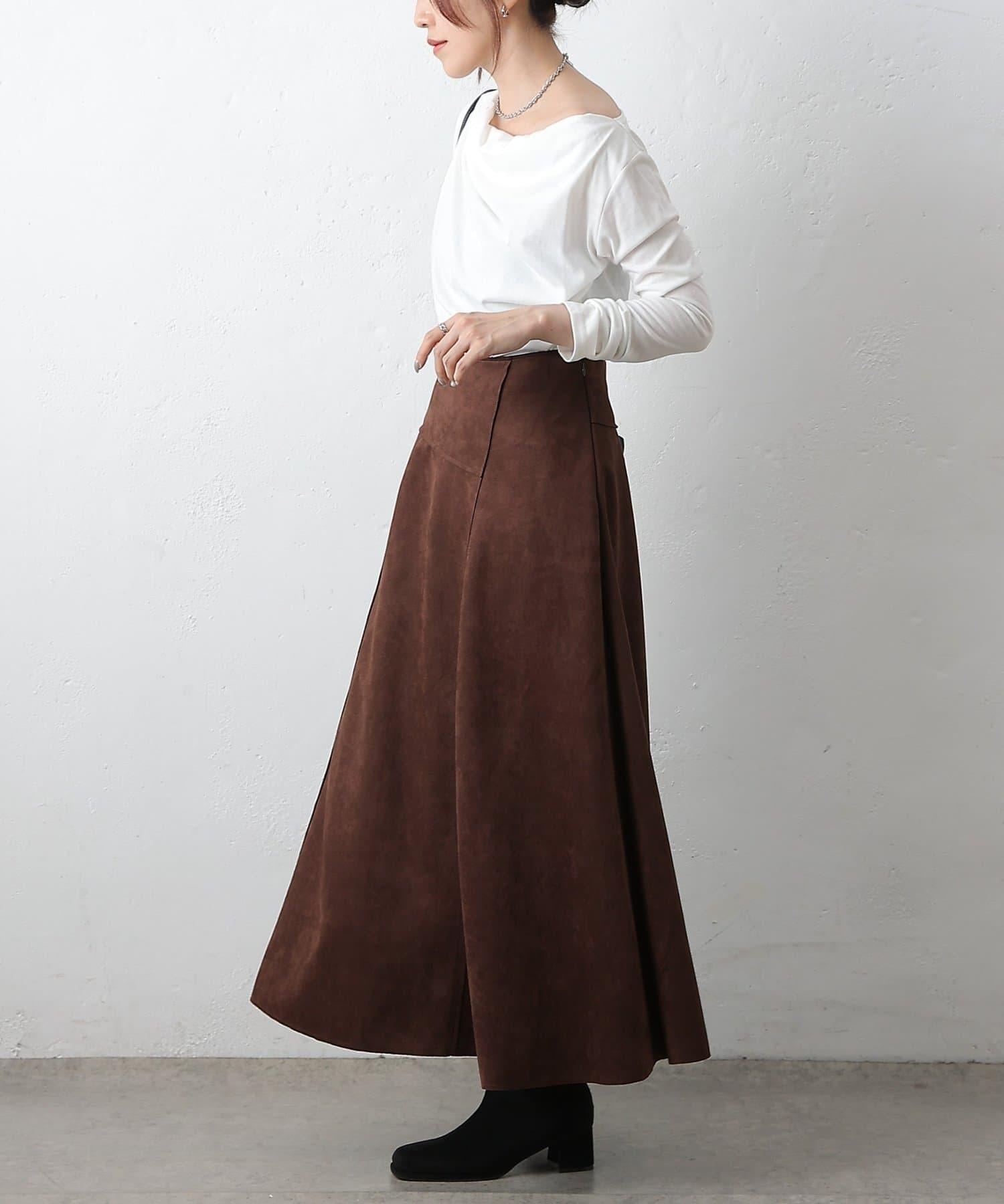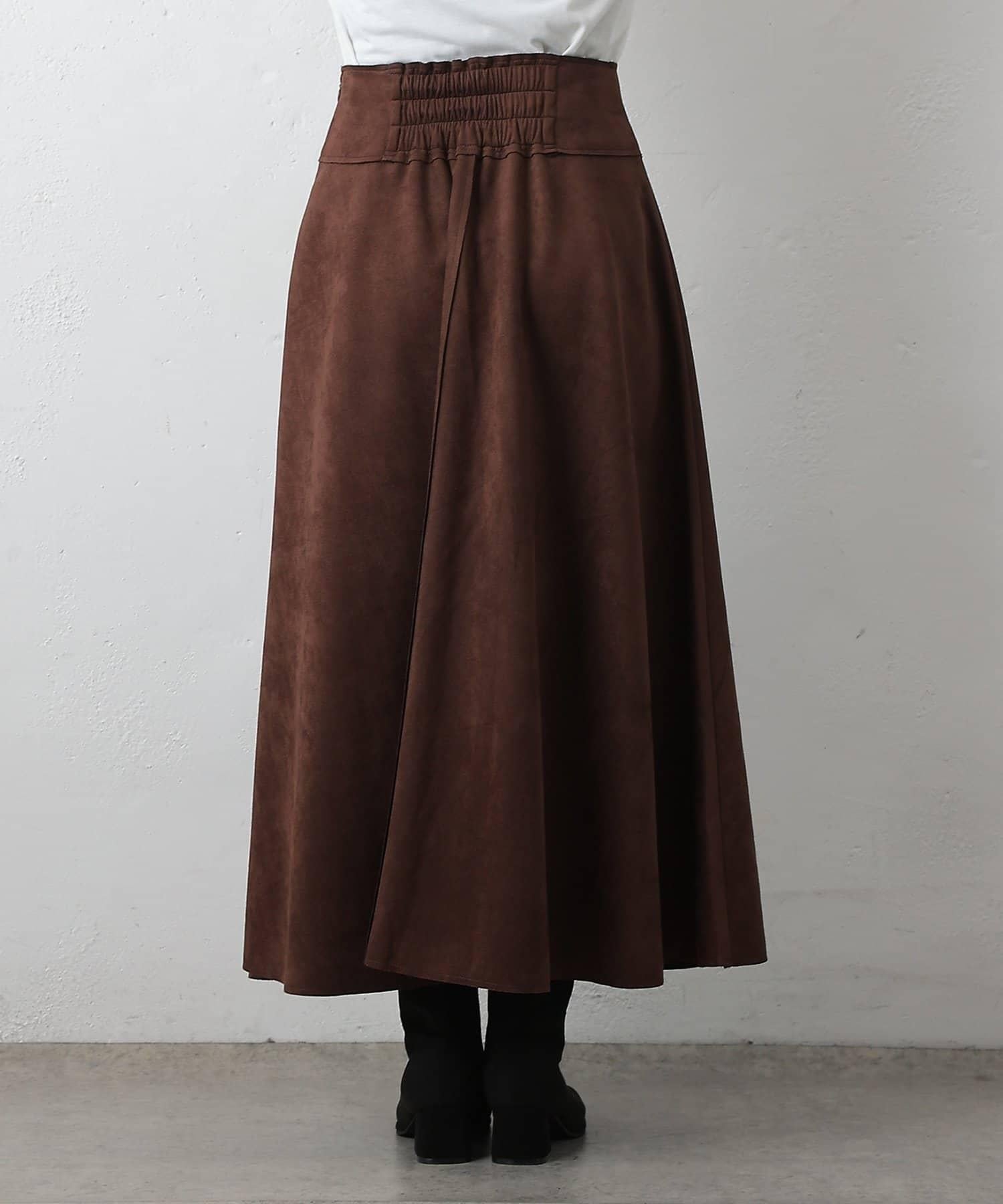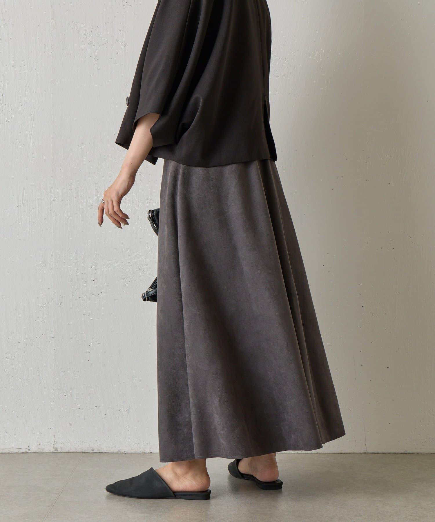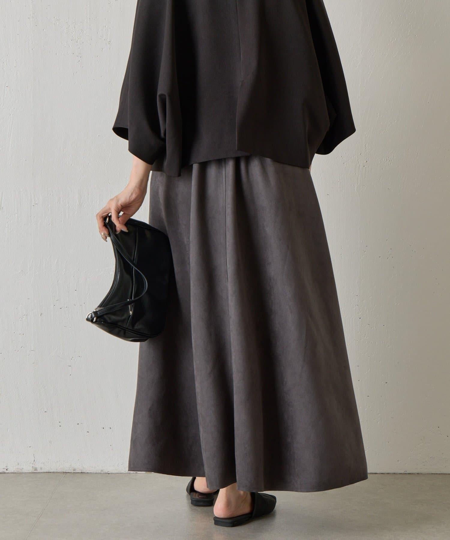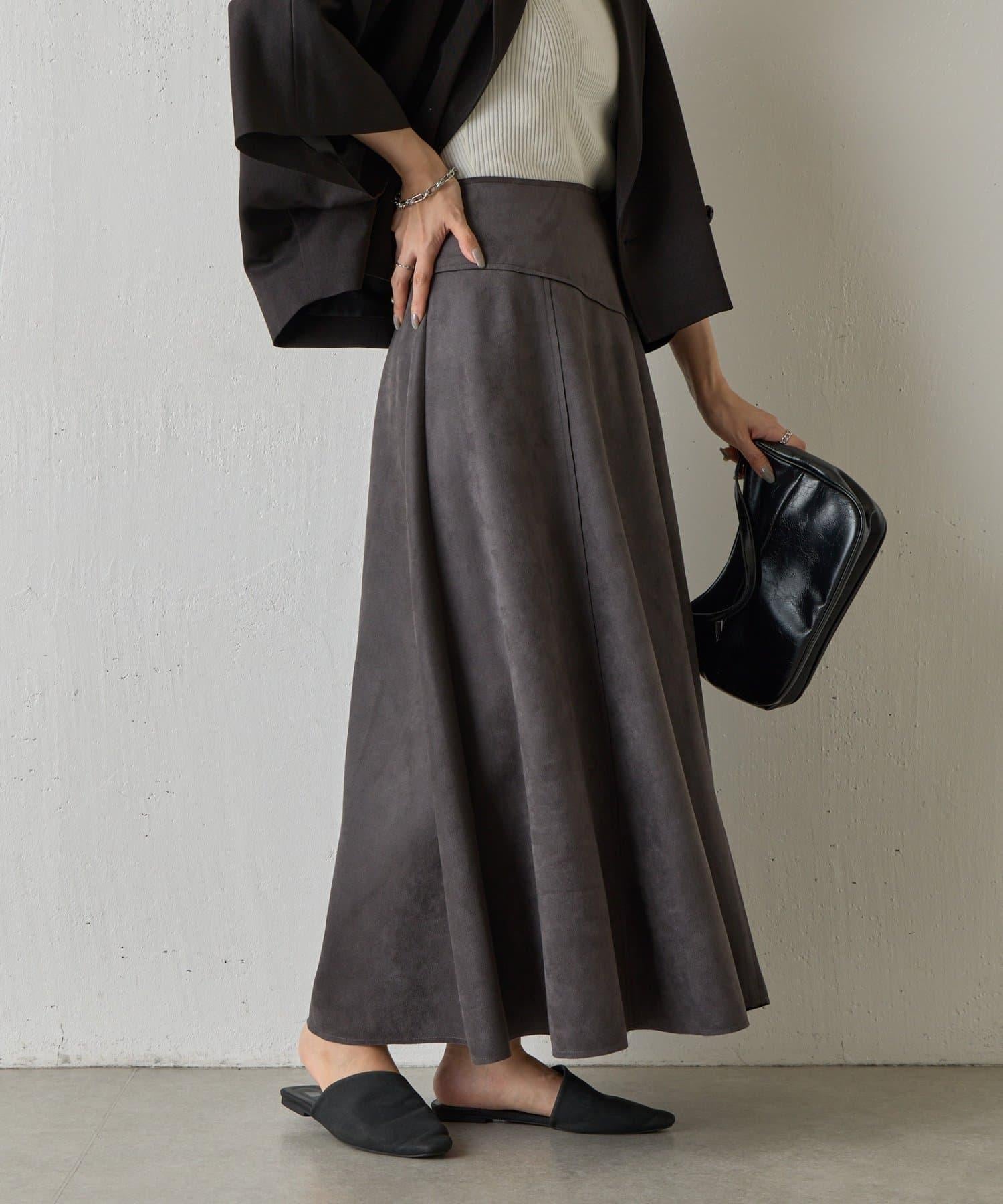 麂皮絨面料製成的喇叭裙,手感溼潤,光澤優雅,極具女性魅力。
