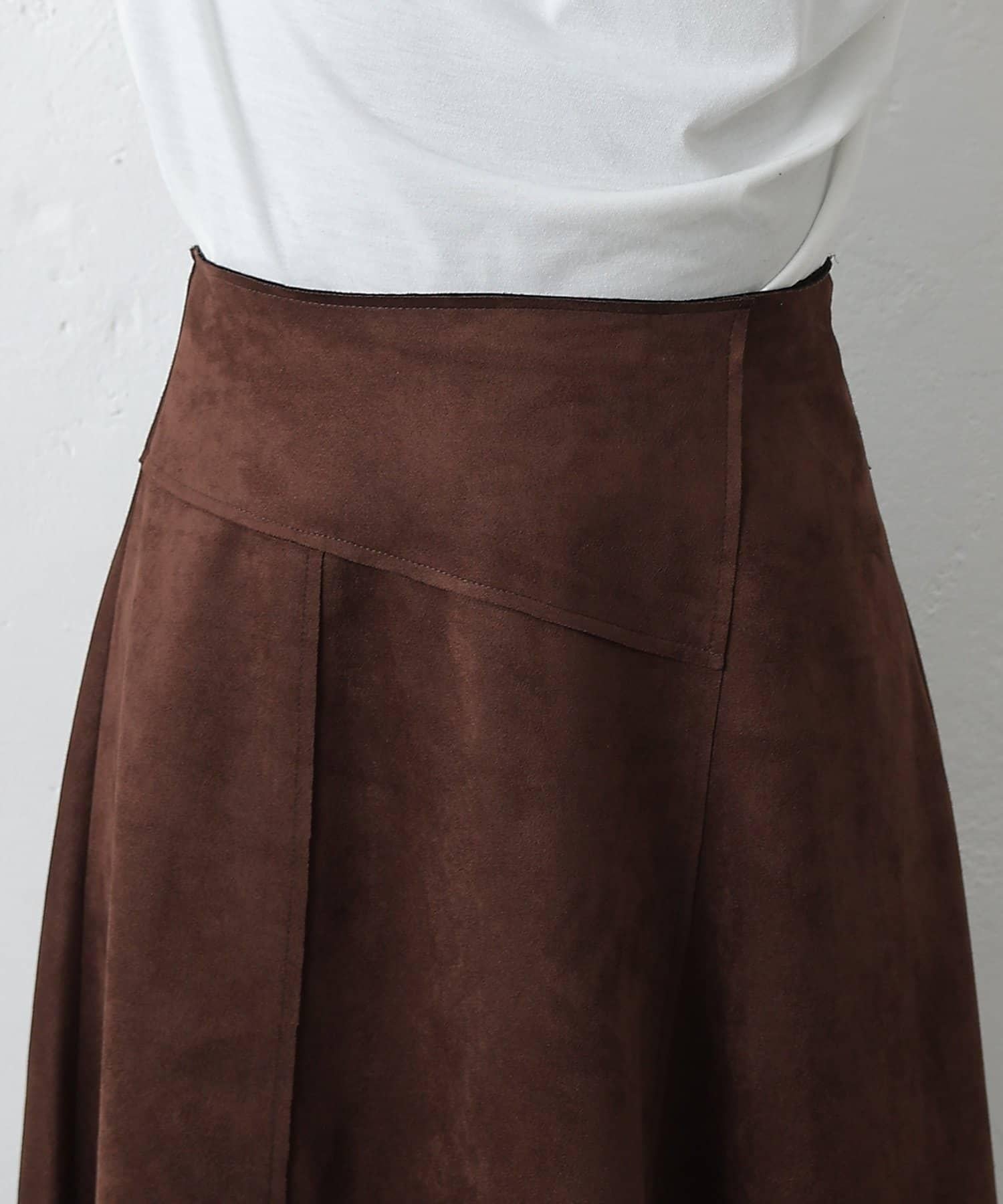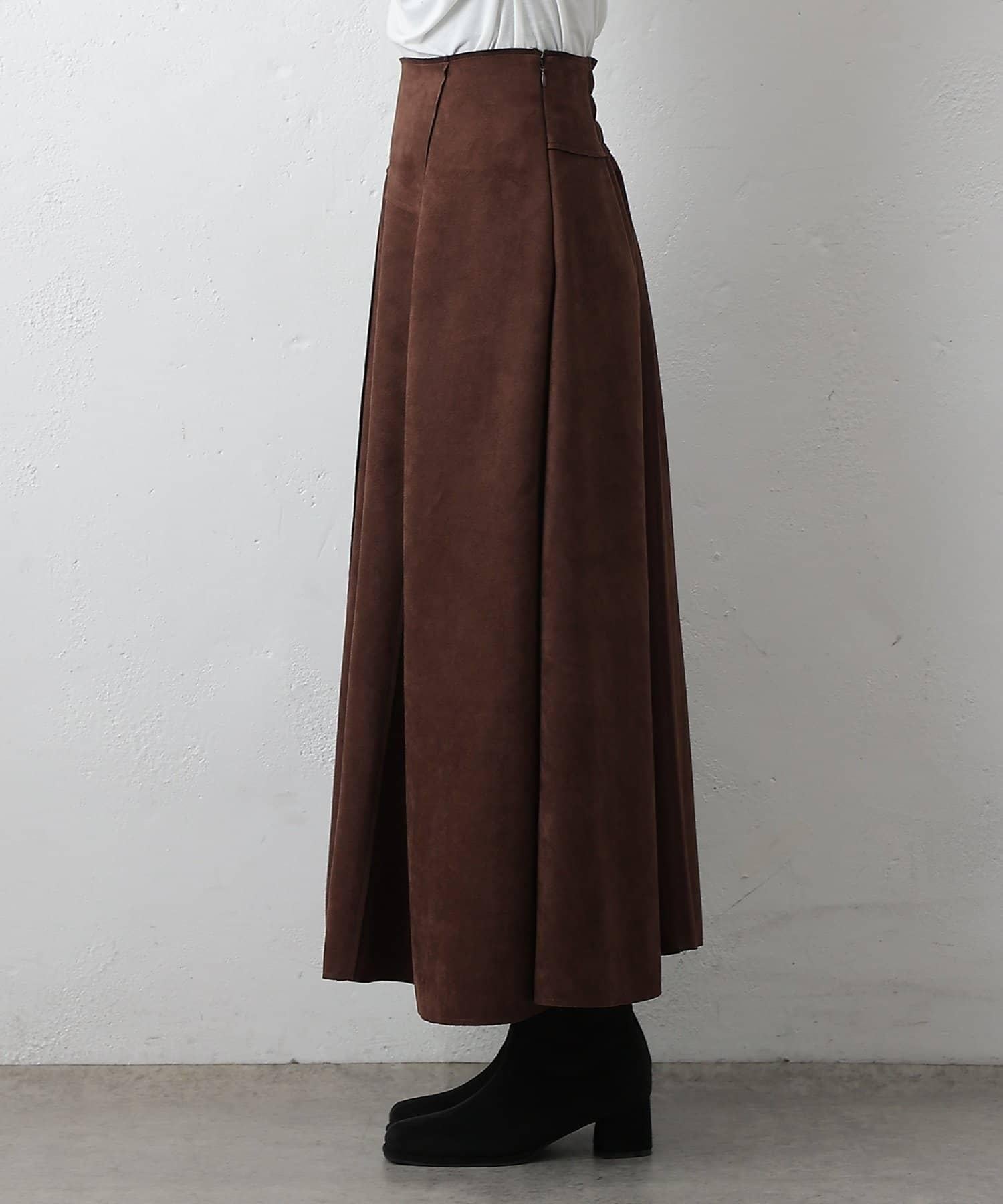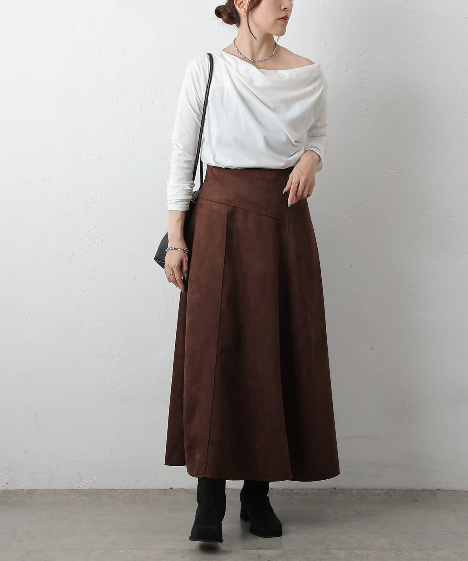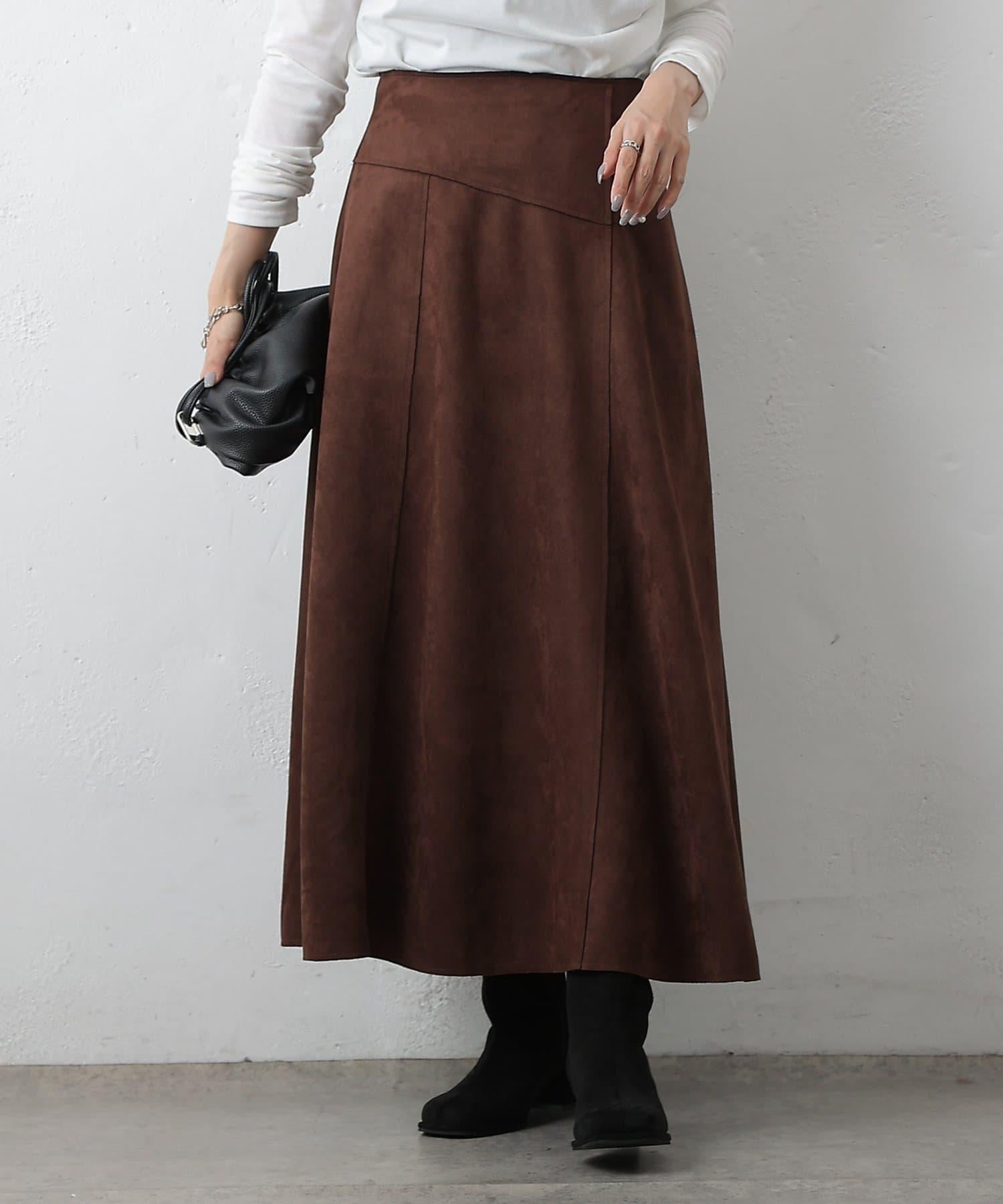 麂皮絨面料製成的喇叭裙,手感溼潤,光澤優雅,極具女性魅力。