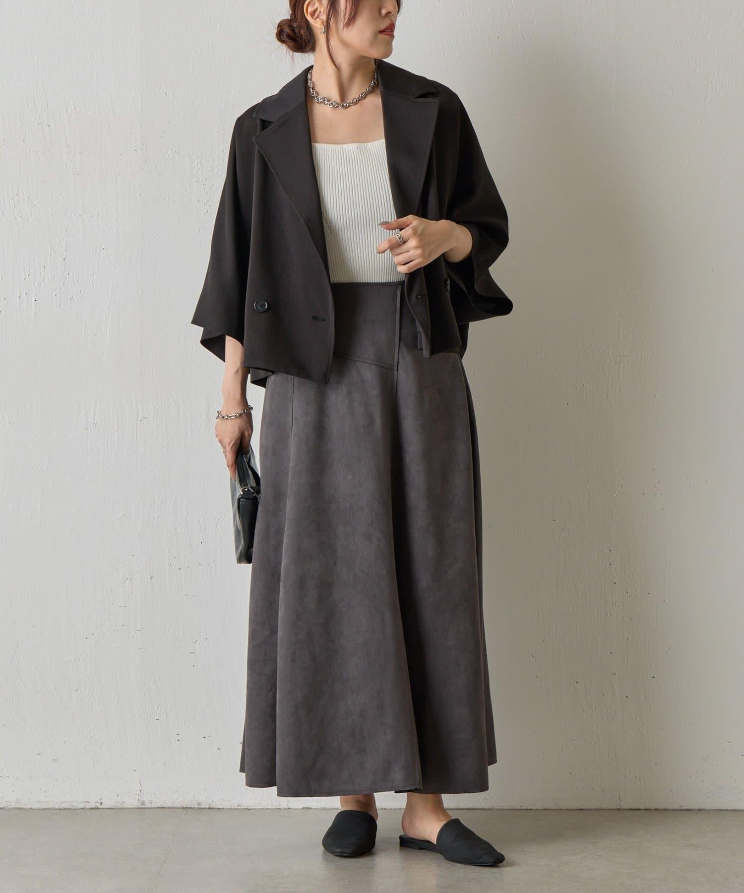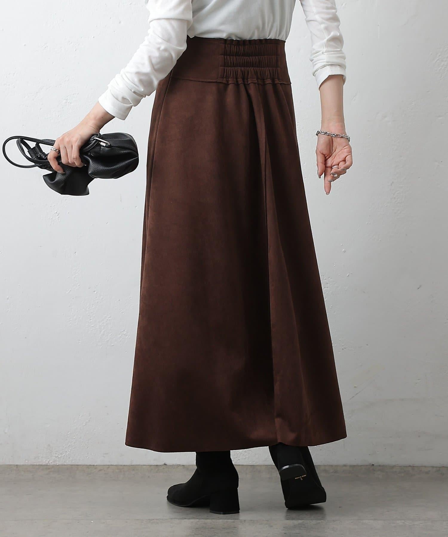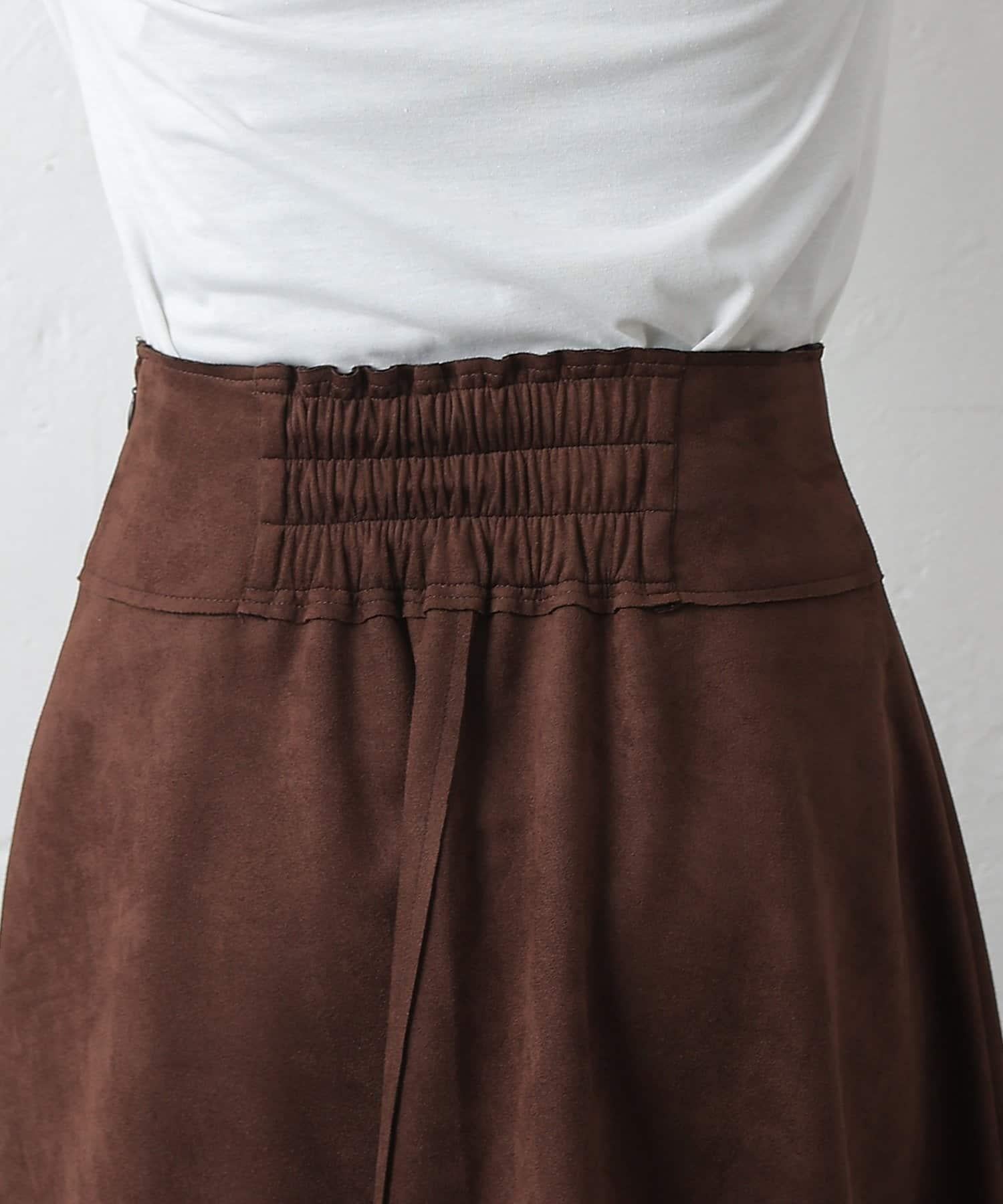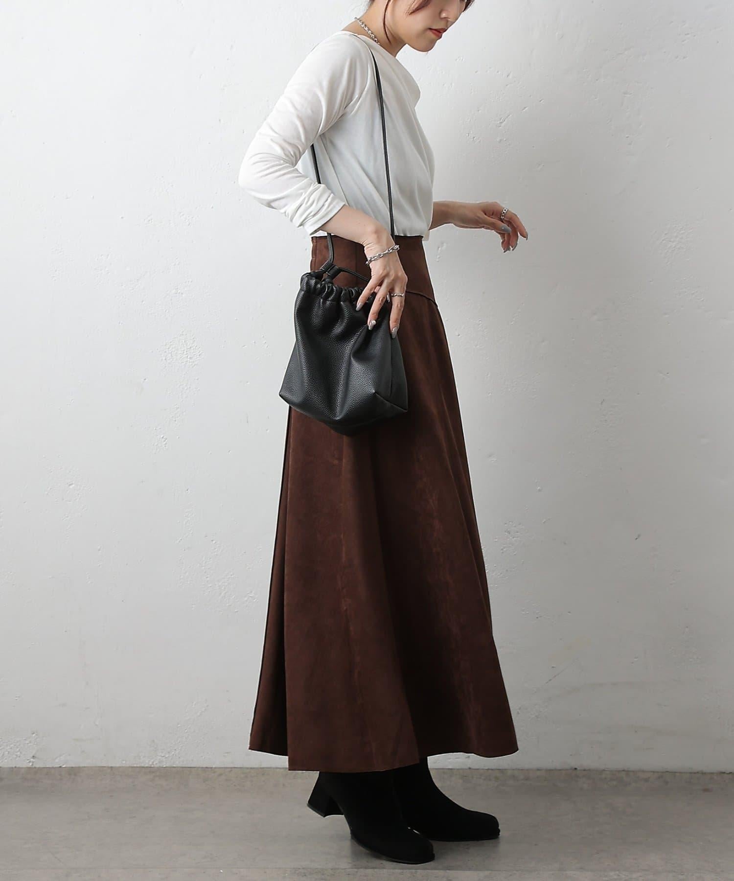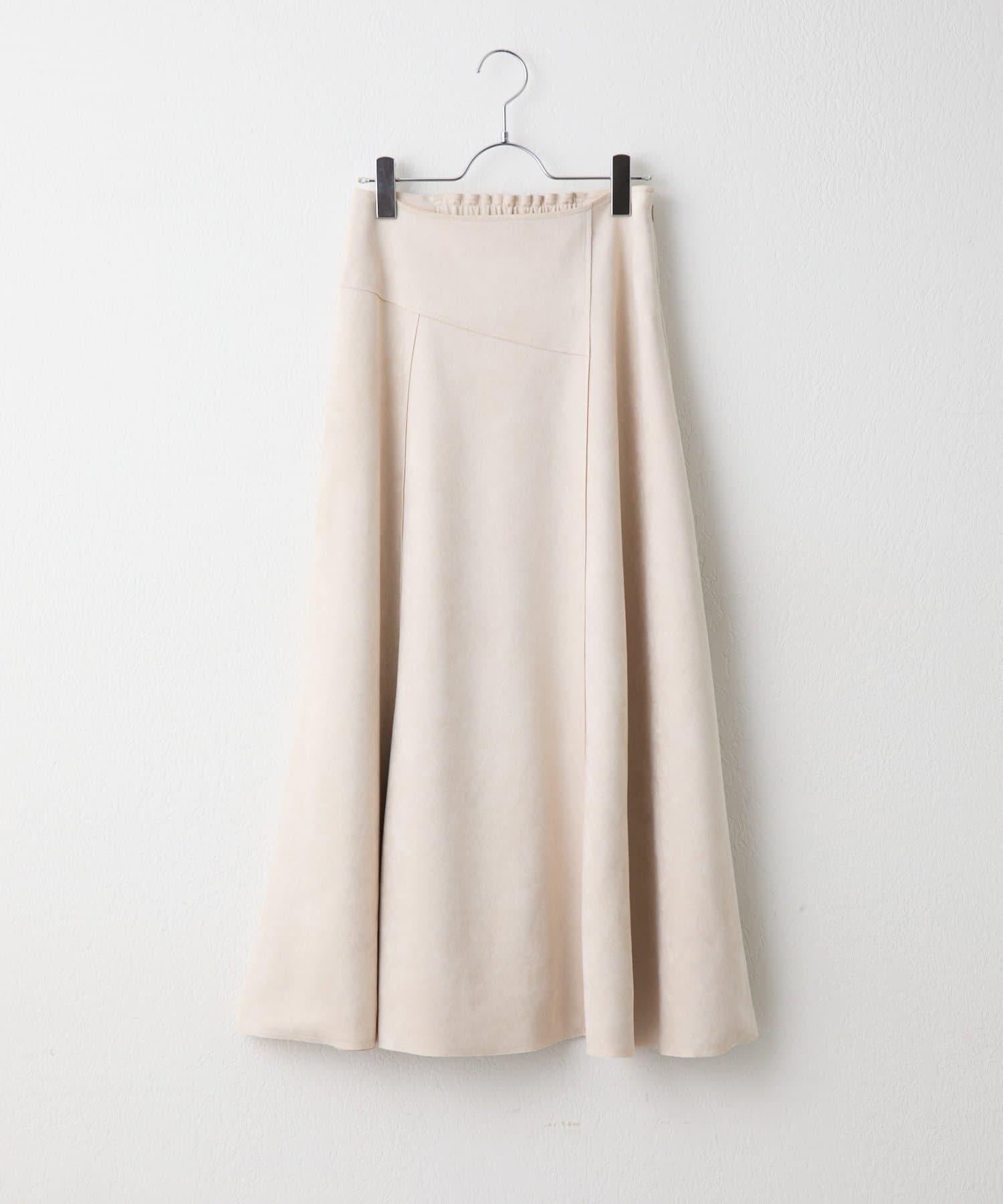 麂皮絨面料製成的喇叭裙,手感溼潤,光澤優雅,極具女性魅力。