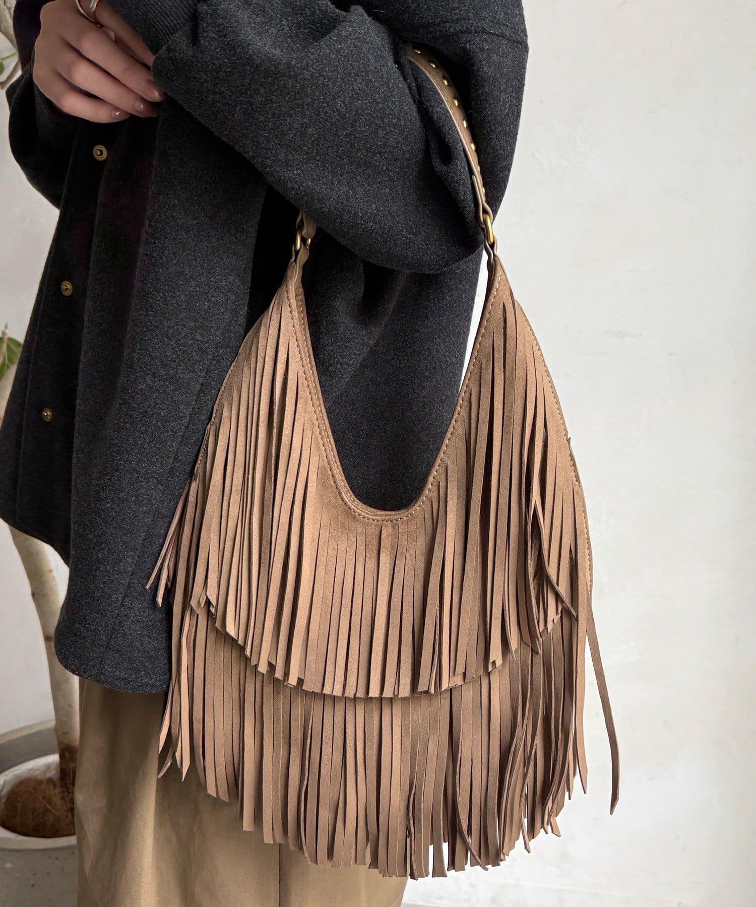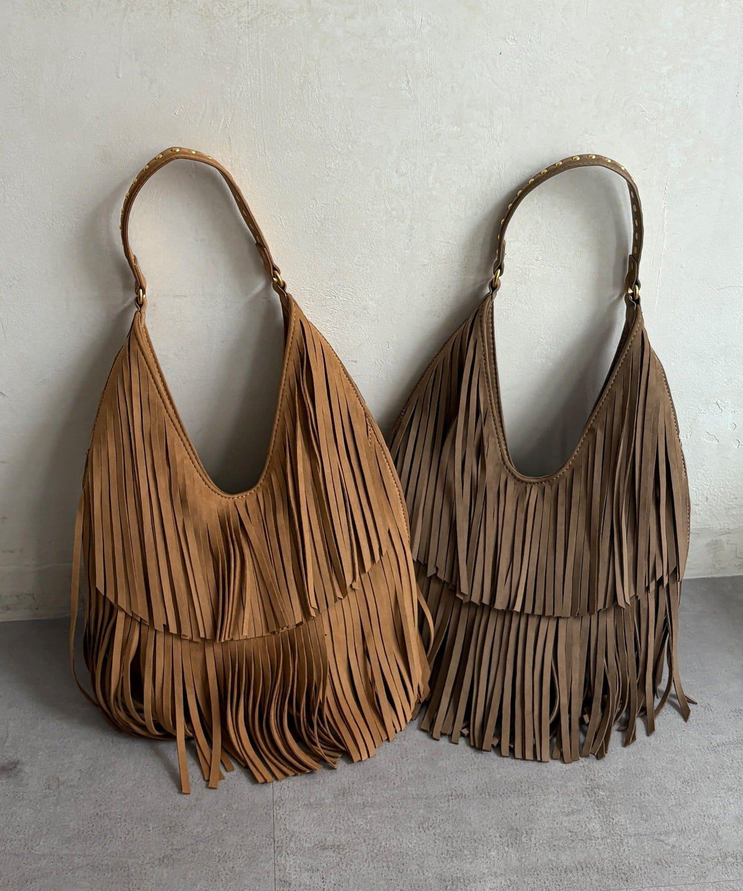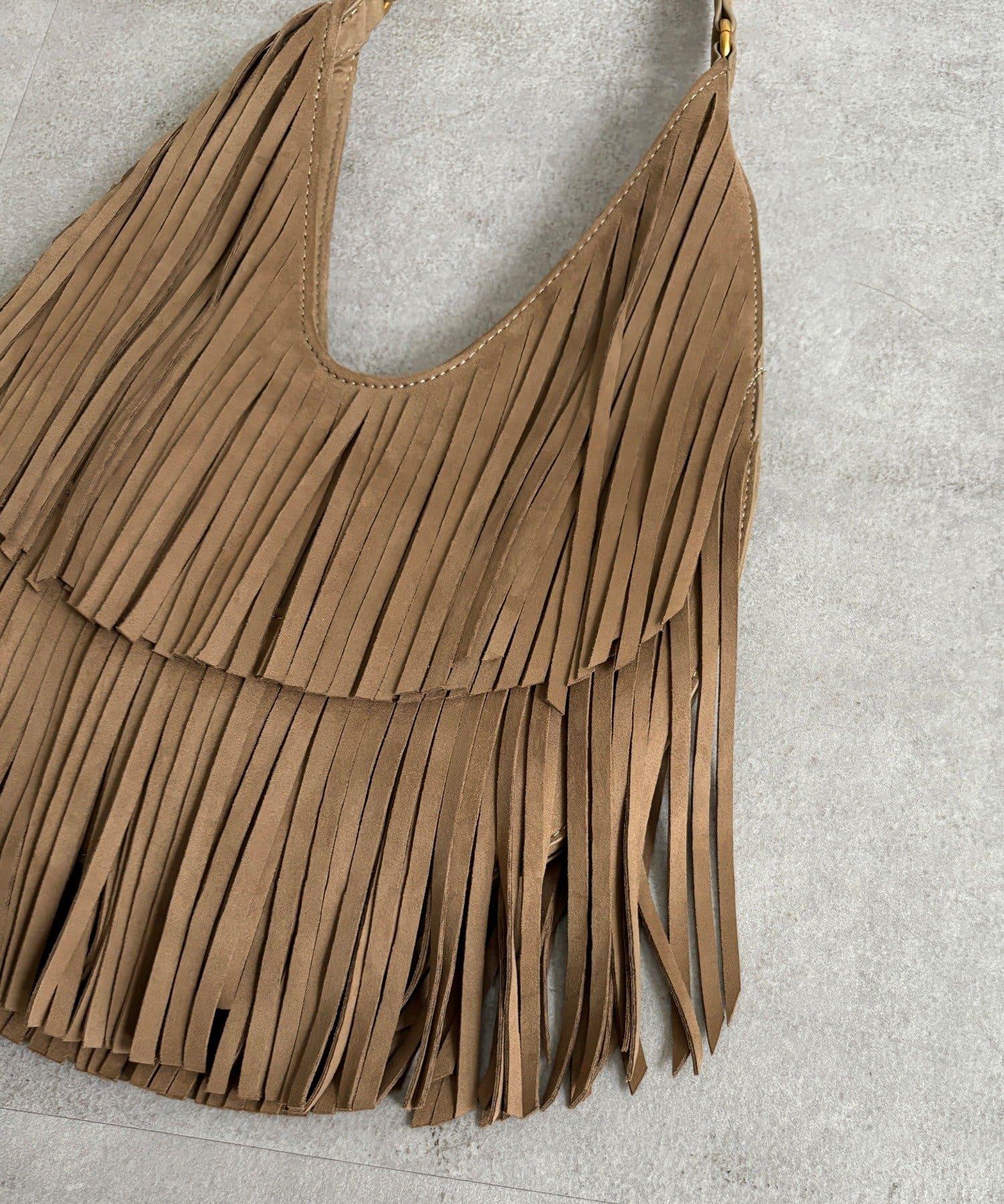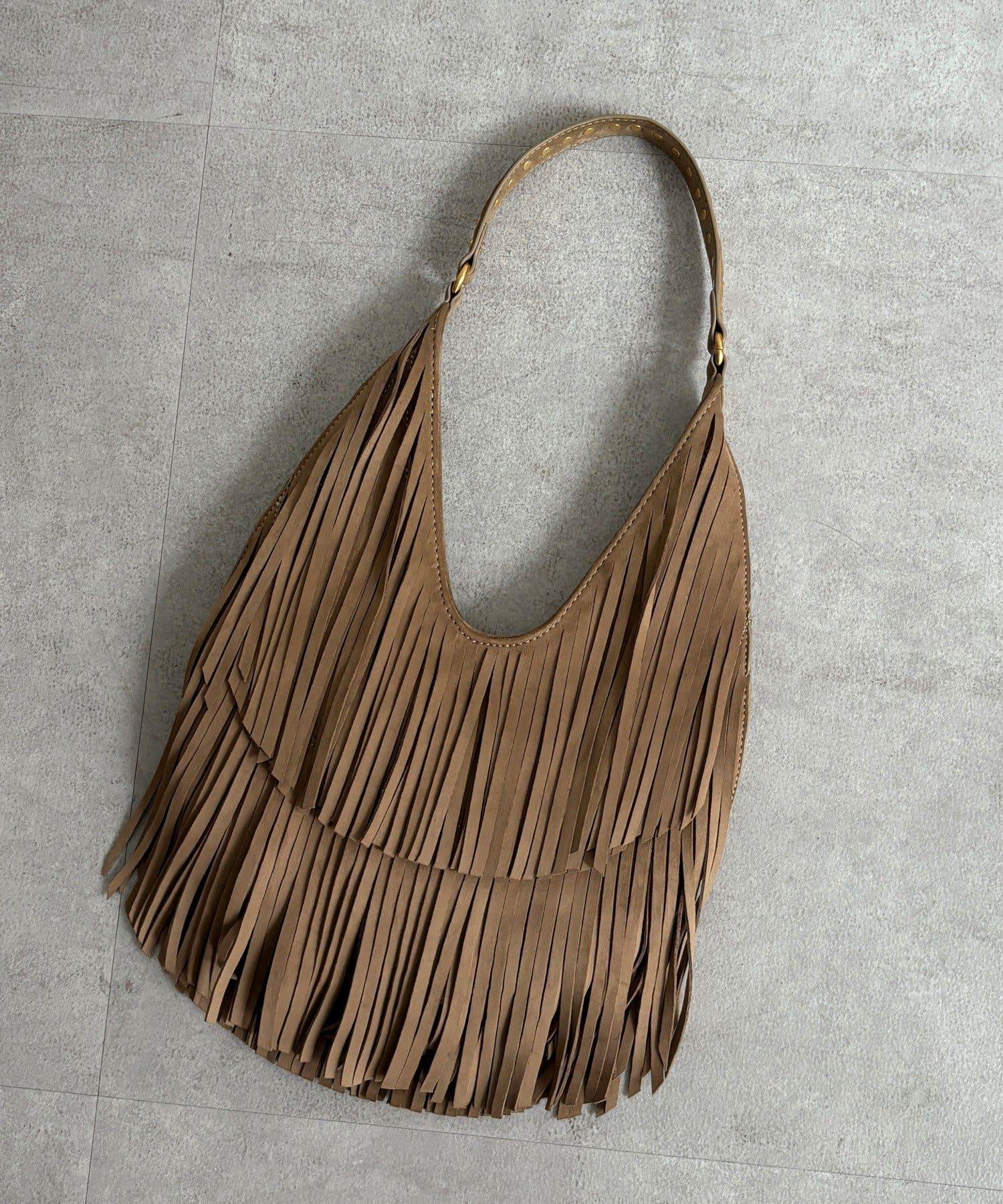 這是一款時尚的半肩揹包,採用柔軟的絨面革材質,帶有流蘇。