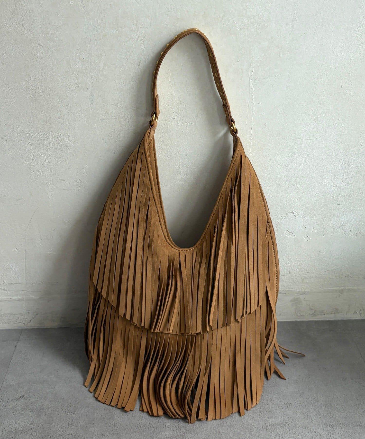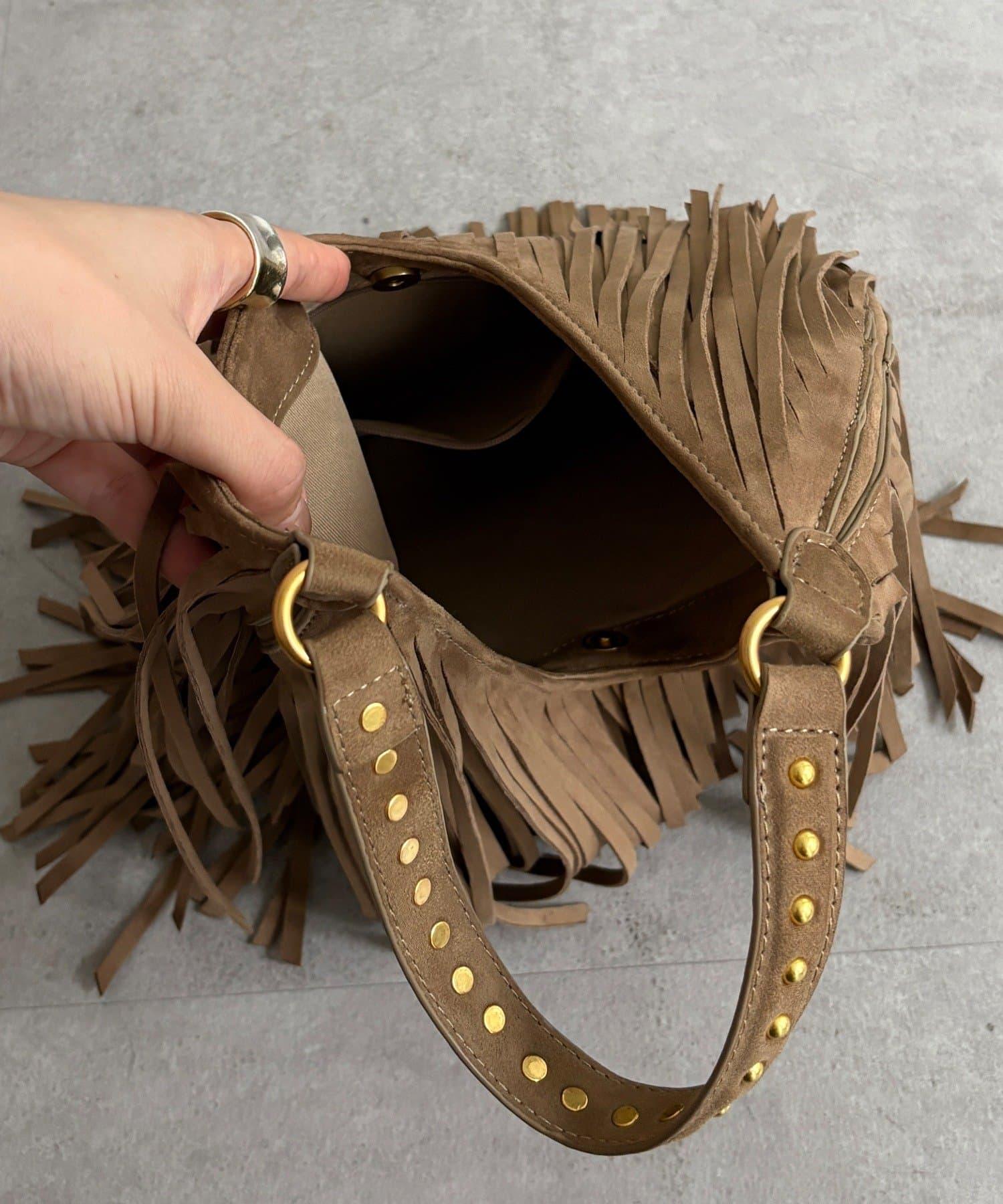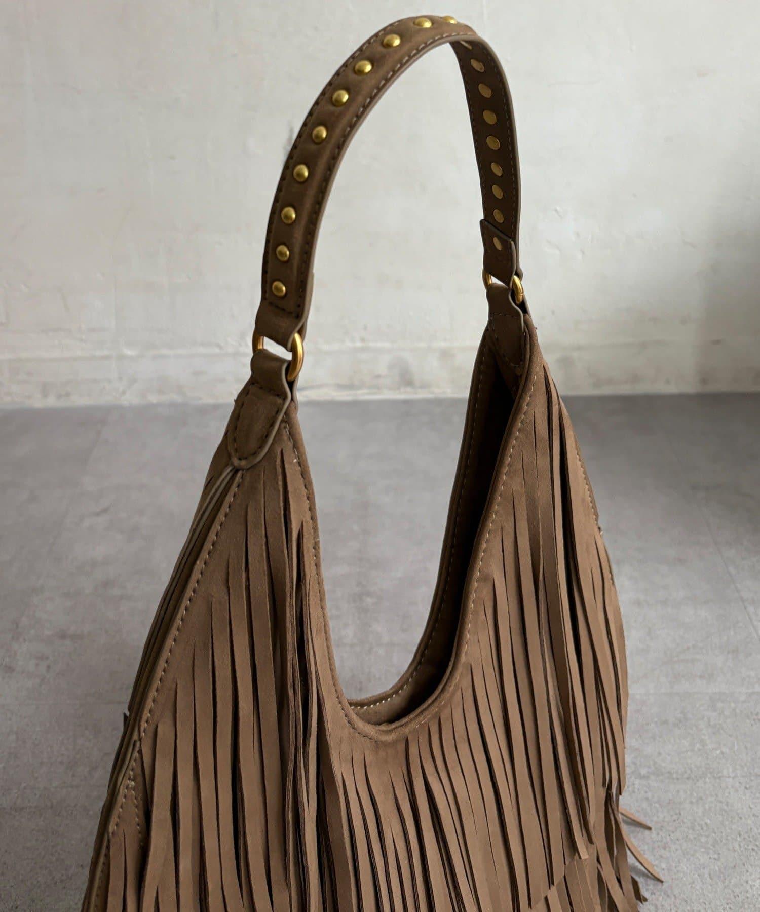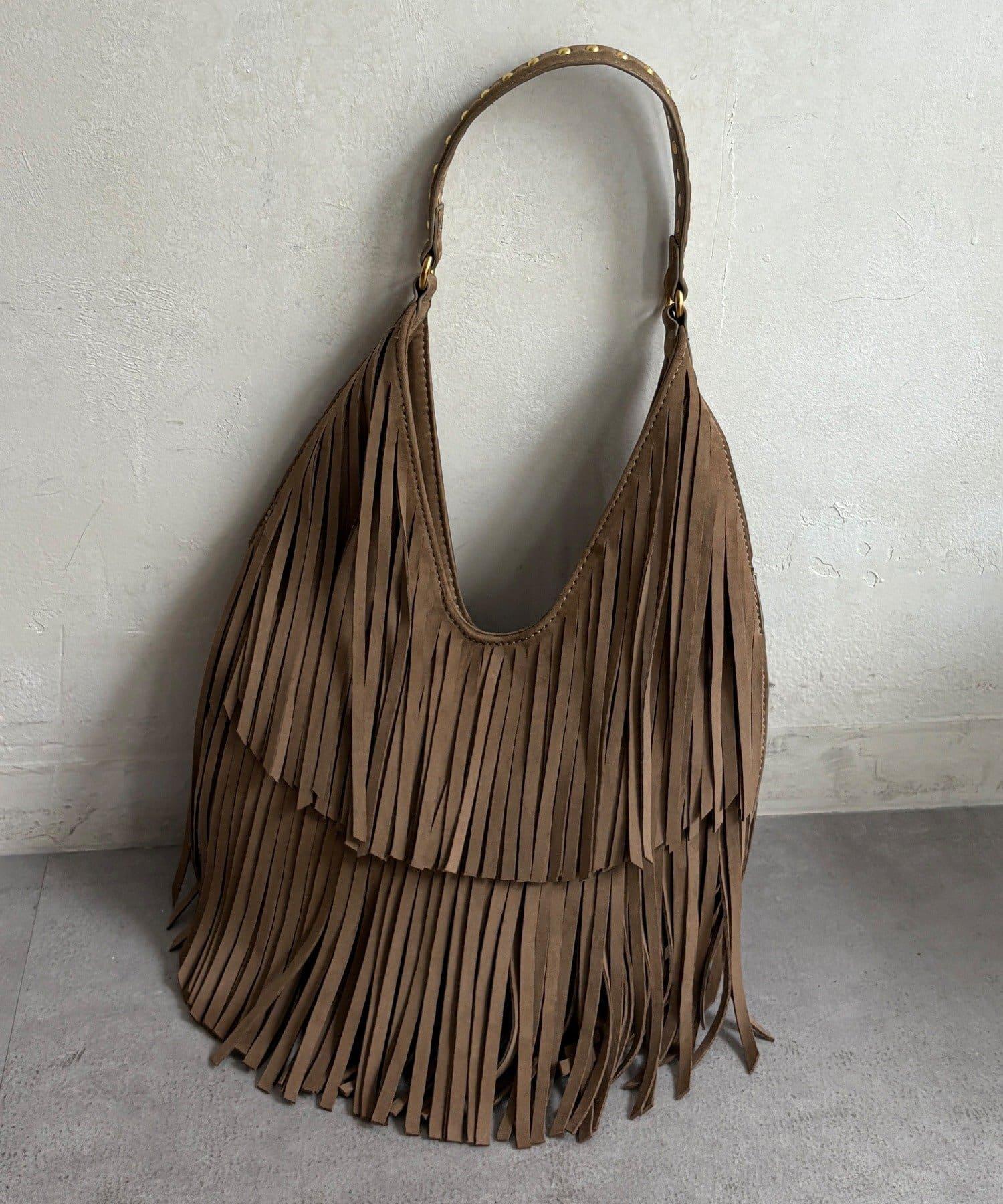 這是一款時尚的半肩揹包,採用柔軟的絨面革材質,帶有流蘇。