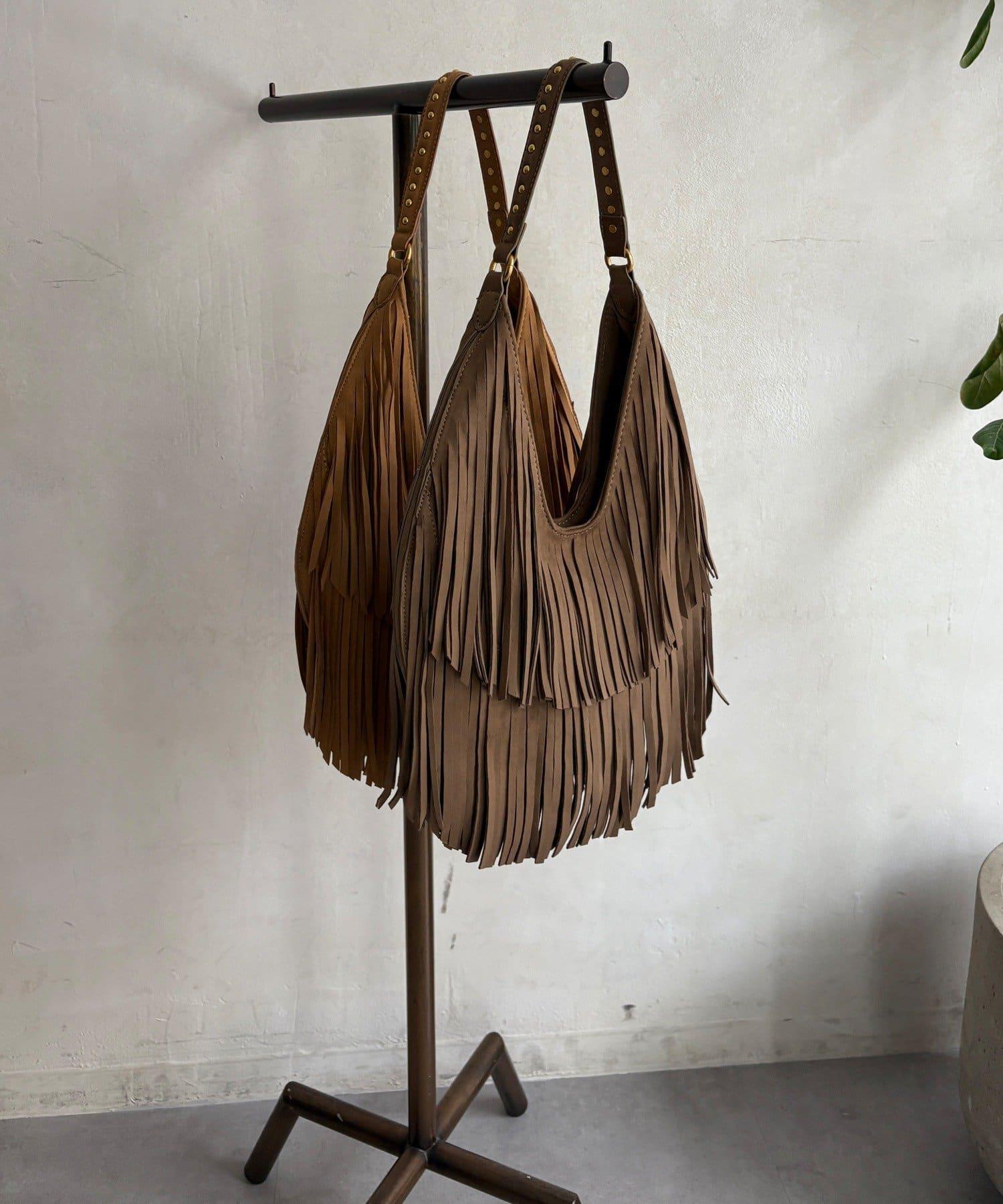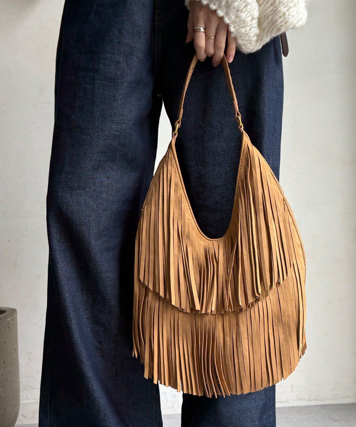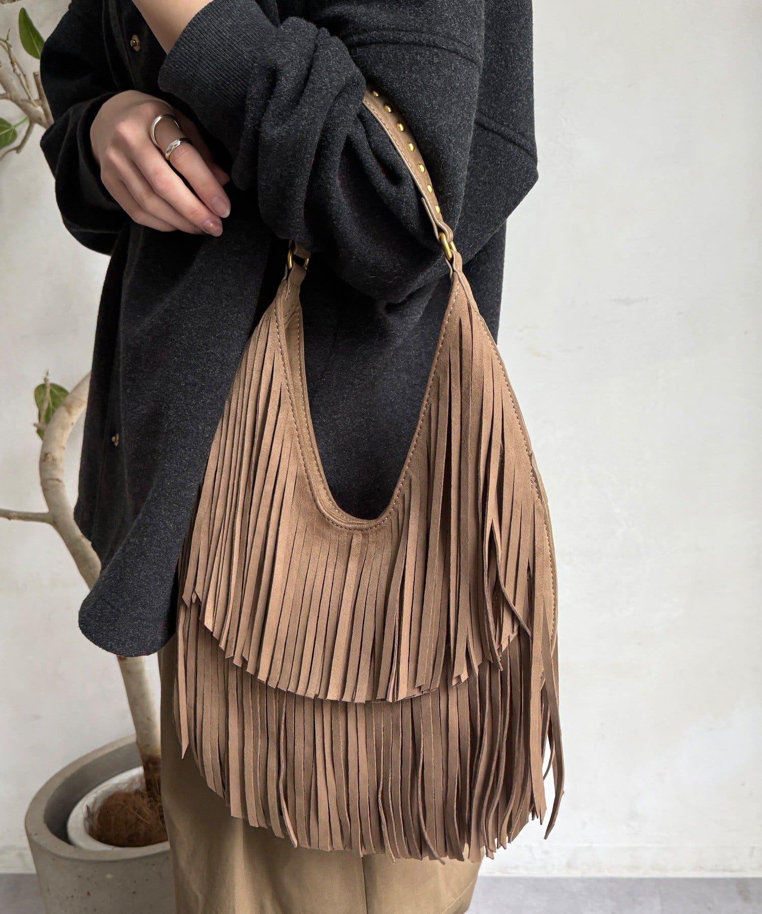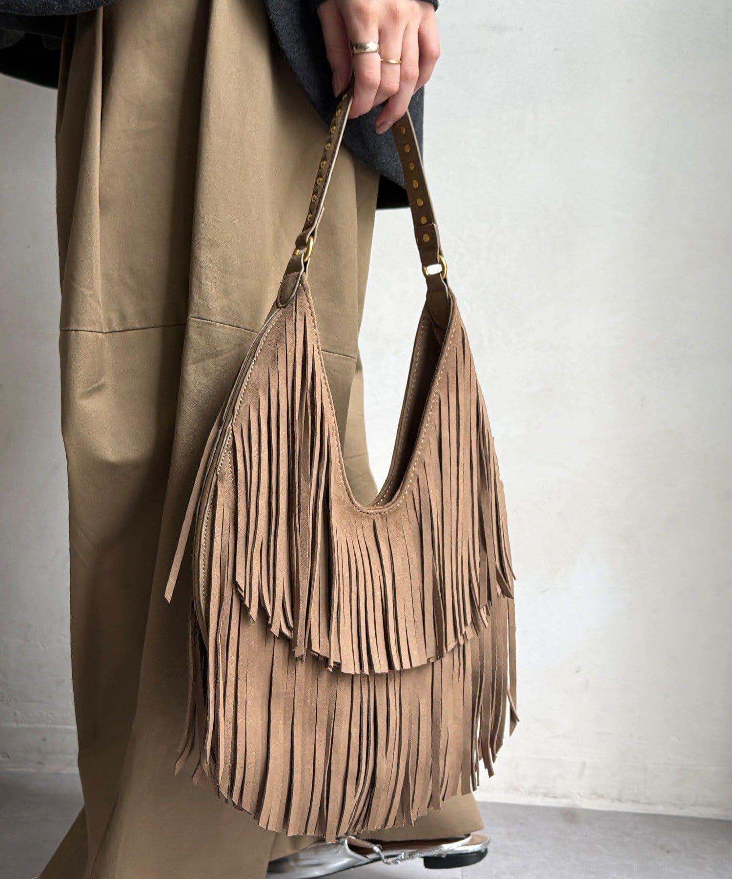 這是一款時尚的半肩揹包,採用柔軟的絨面革材質,帶有流蘇。