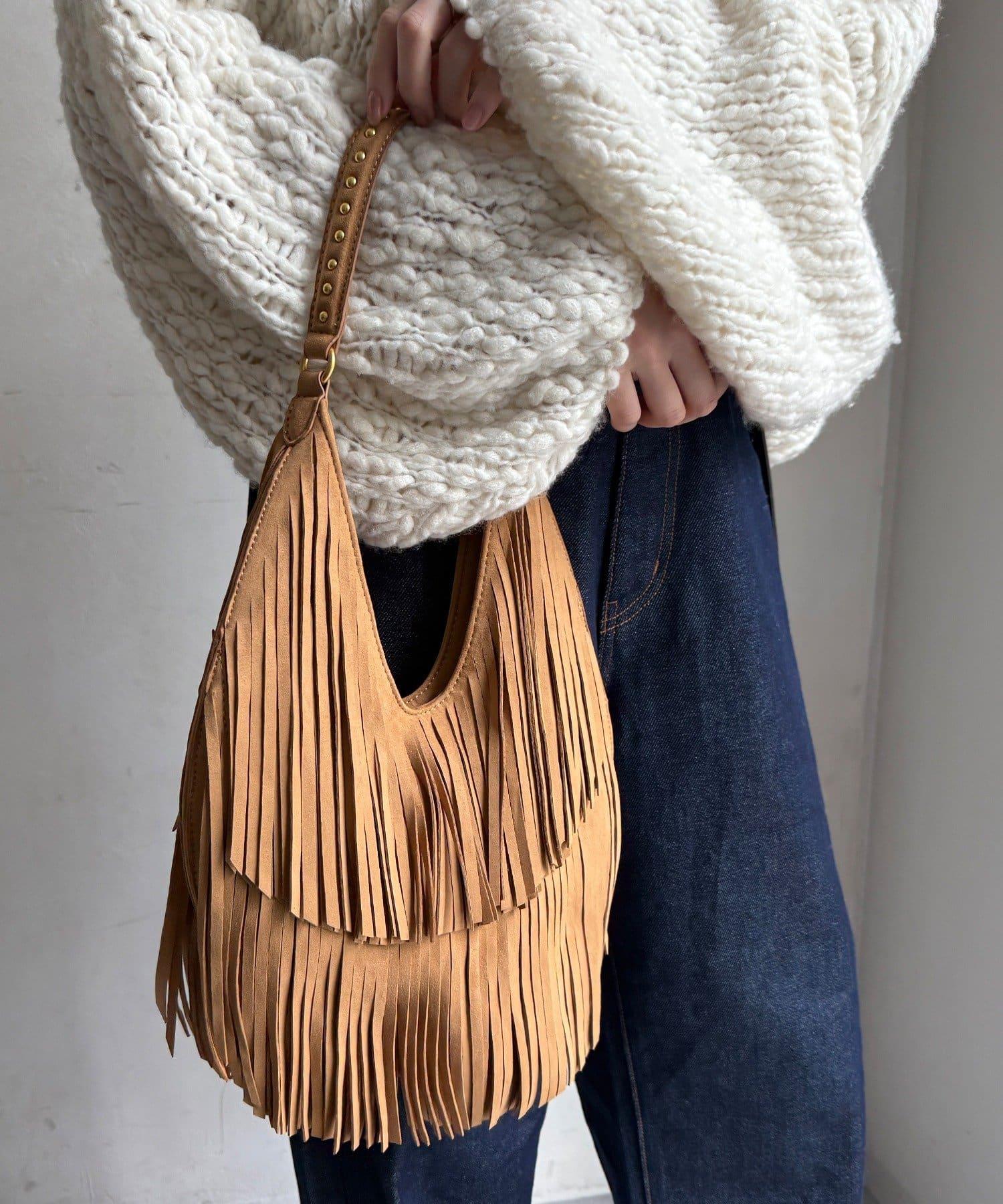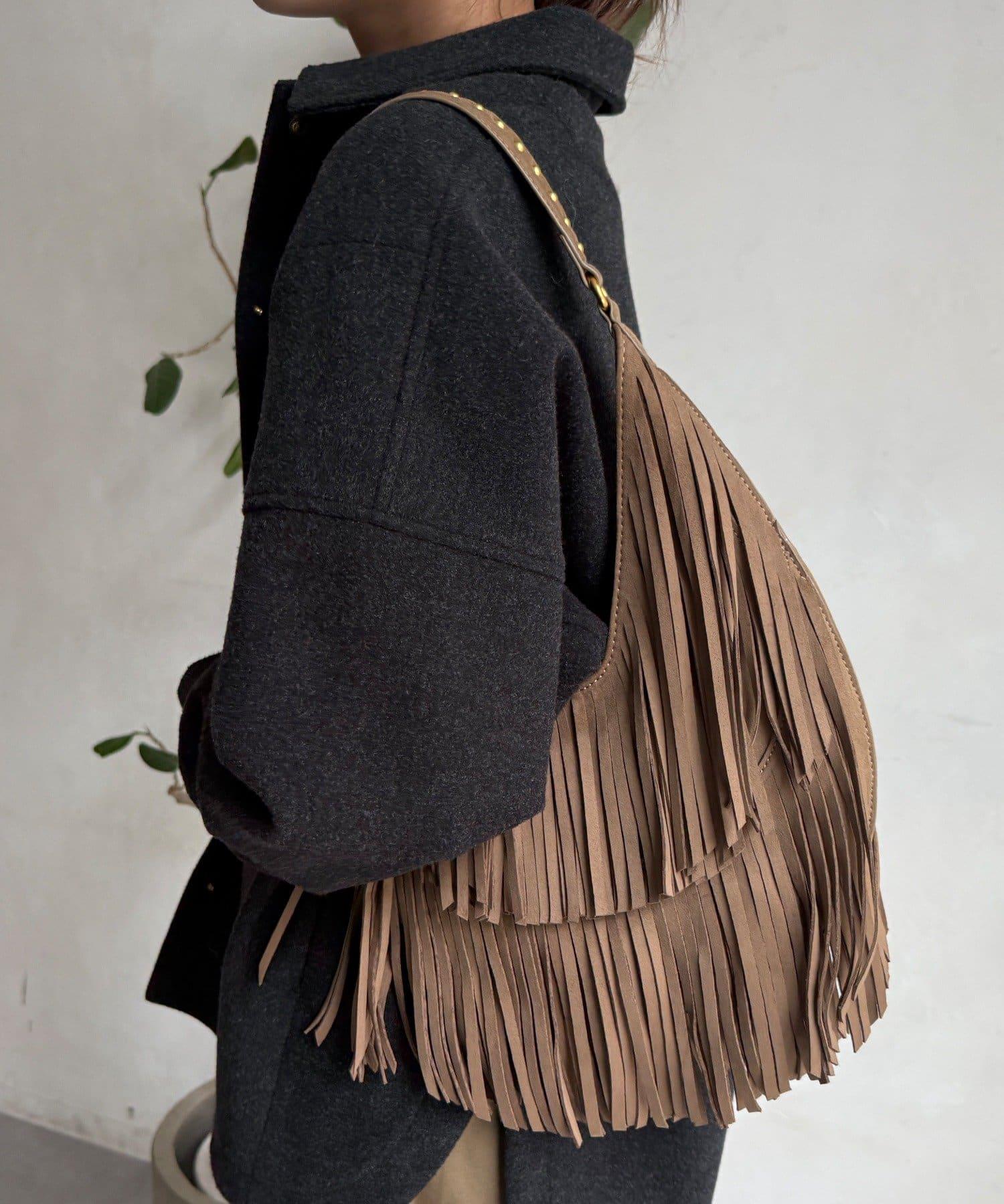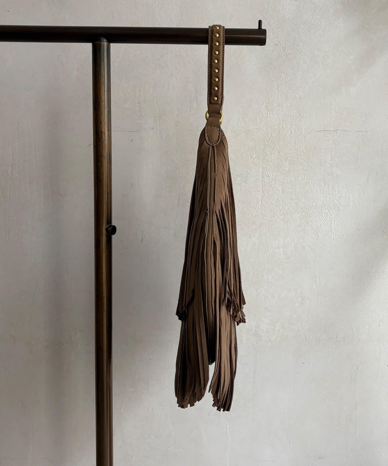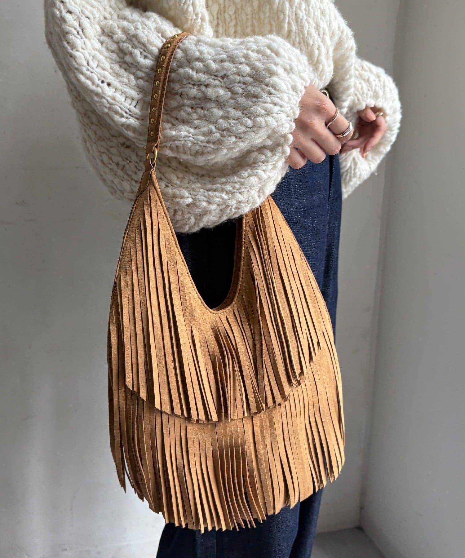 這是一款時尚的半肩揹包,採用柔軟的絨面革材質,帶有流蘇。