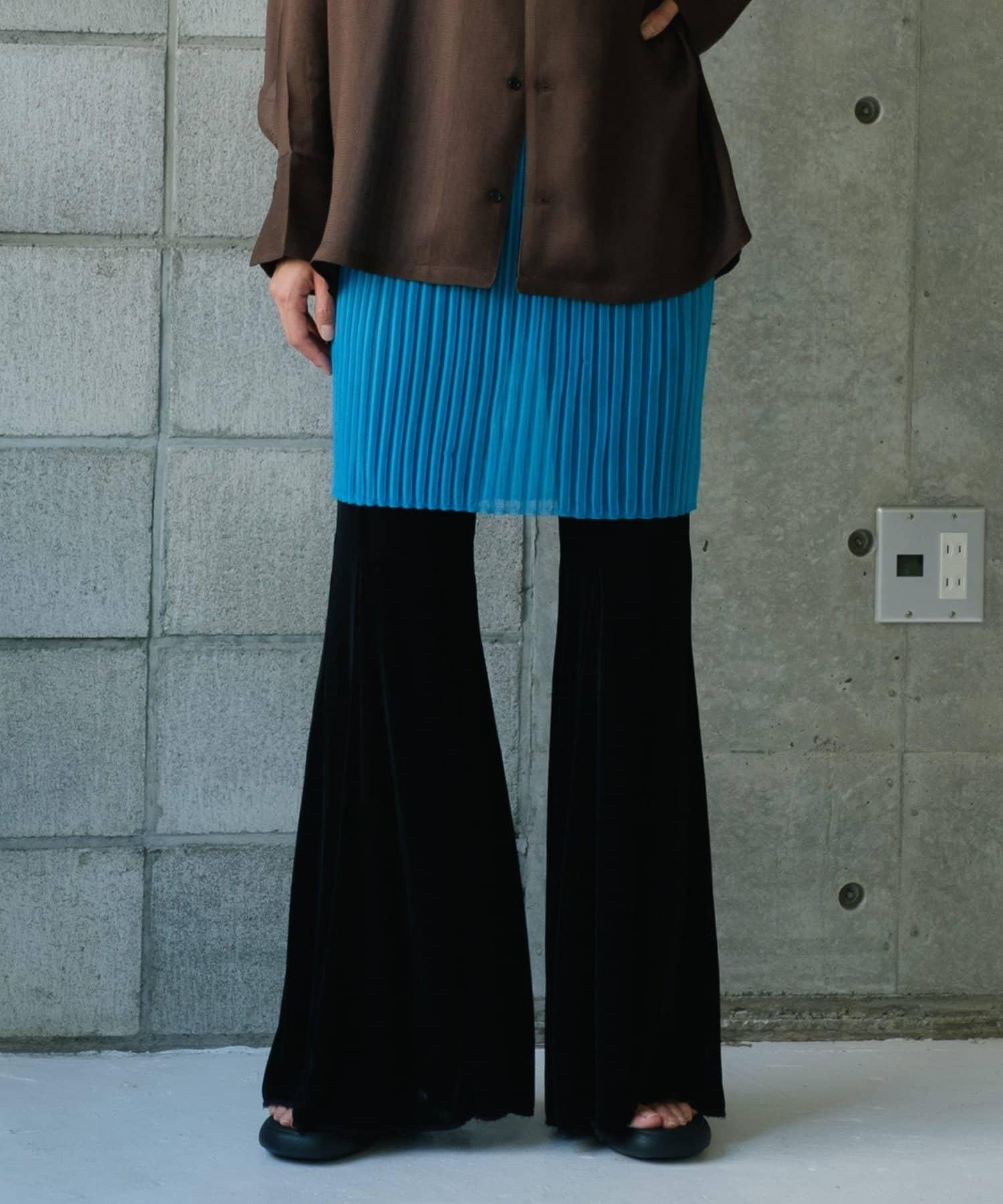 同樣面料的透視羅紋拉鍊裙也可供選擇。本季推薦的穿法是將兩件單品疊穿,並從拉鍊處露出喇叭褲。