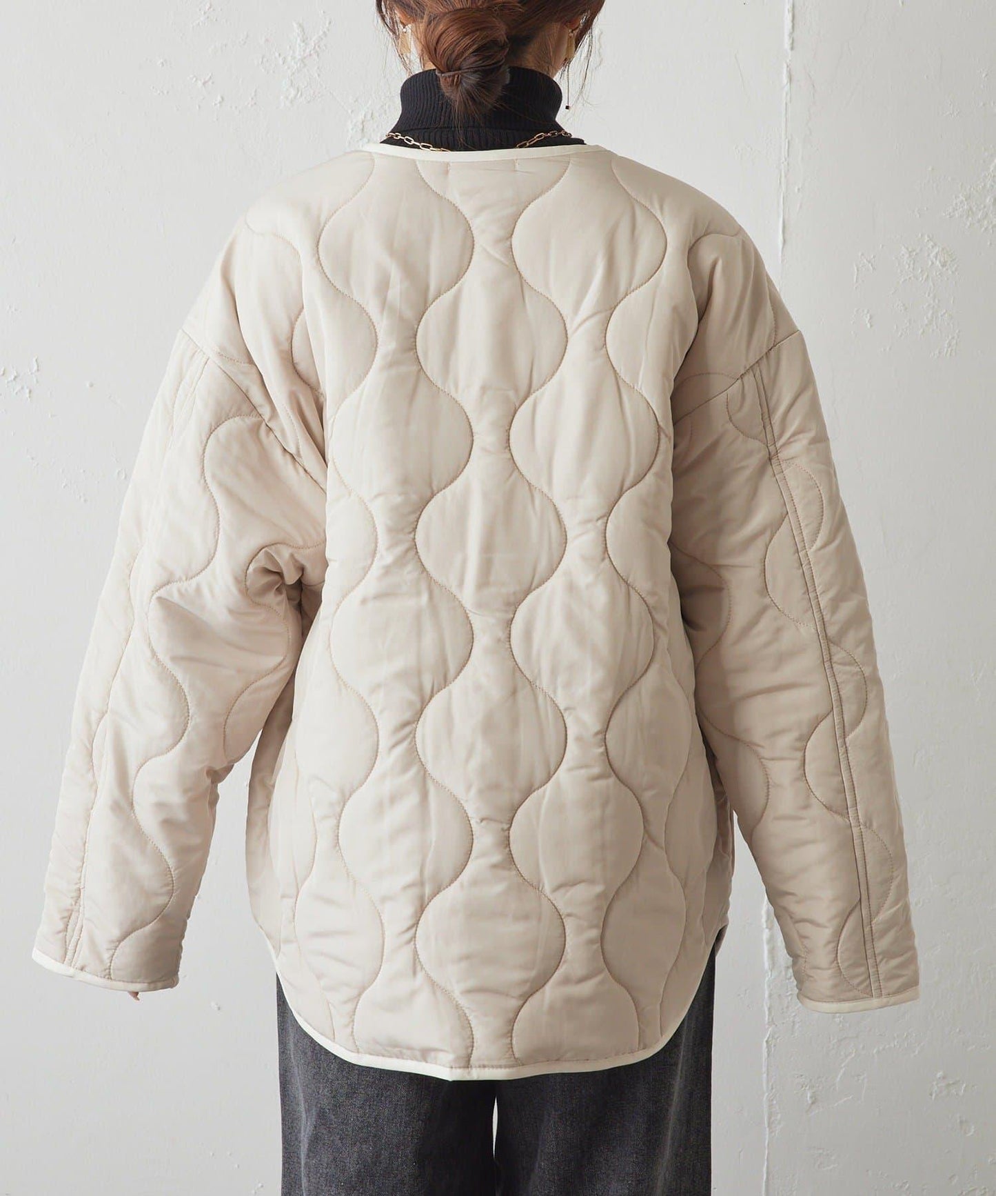 這款無領夾克採用絎縫面料製成,是秋冬季外套的主打產品,輕便保暖。