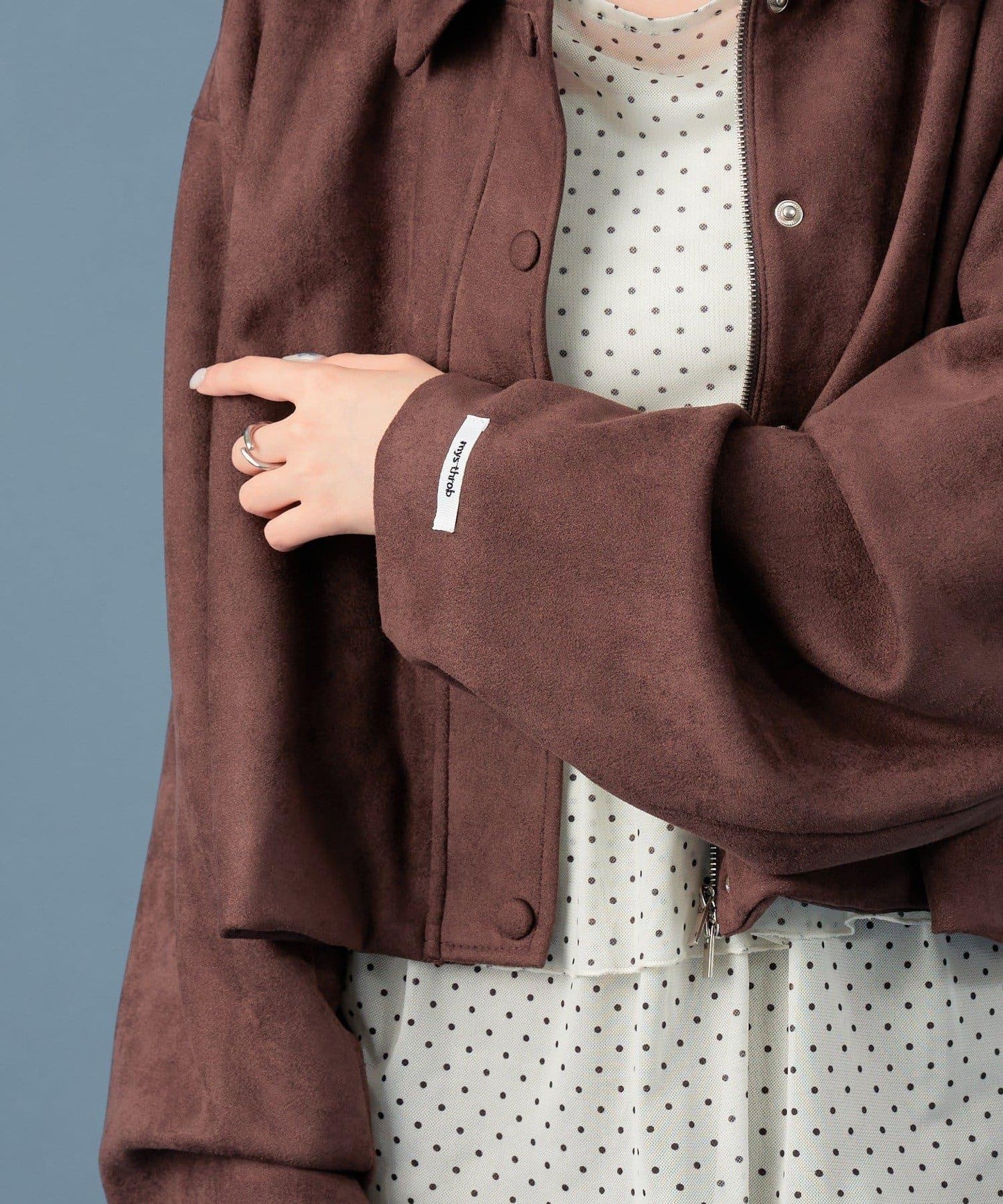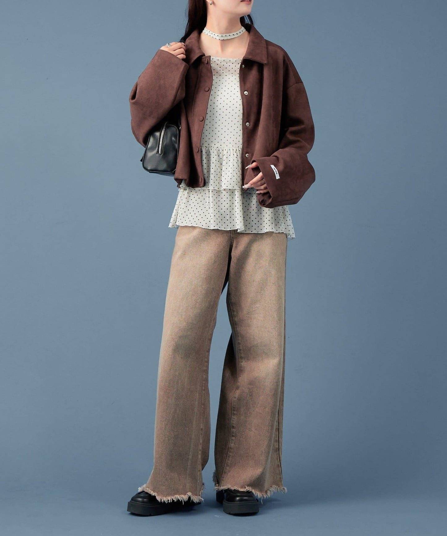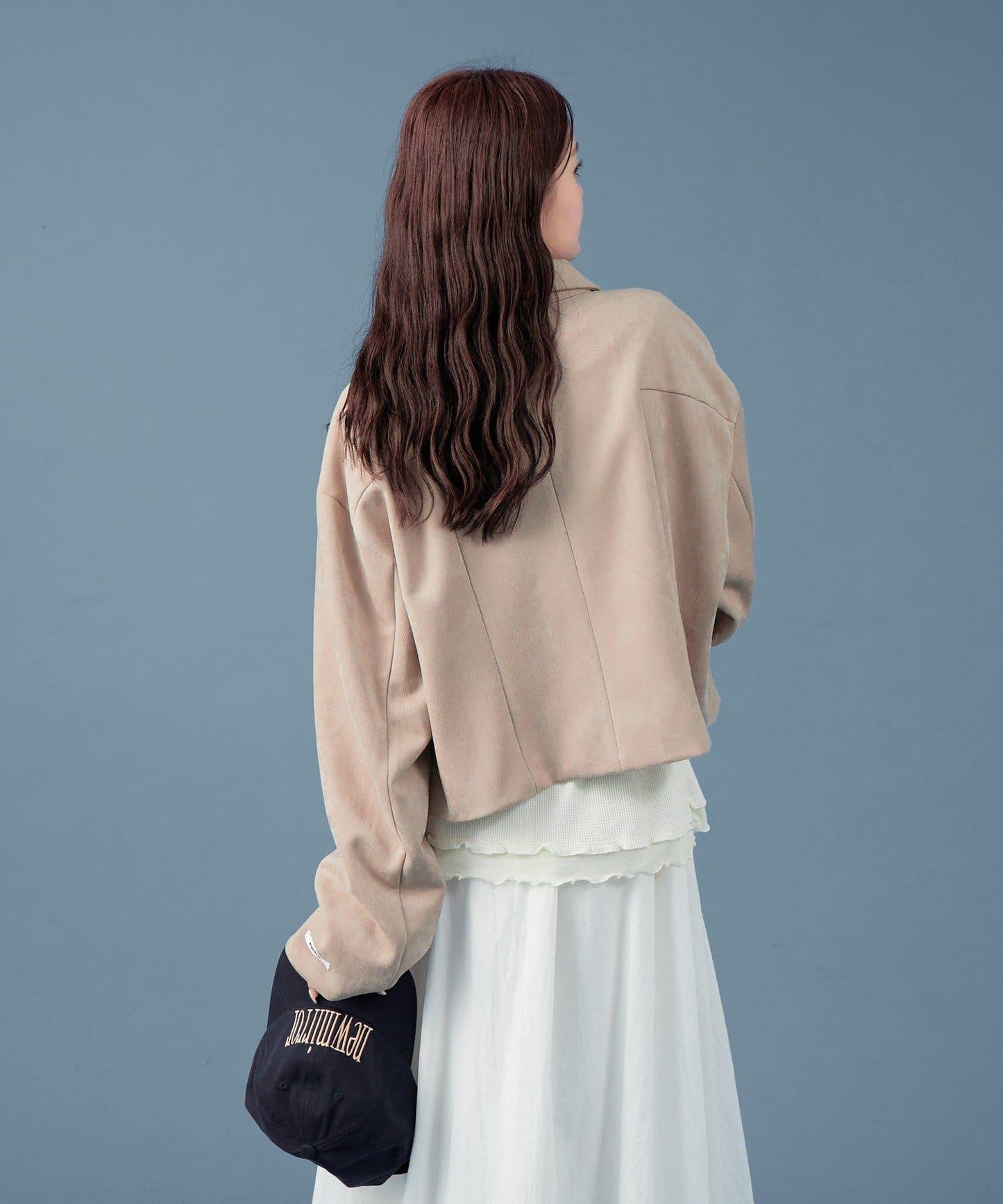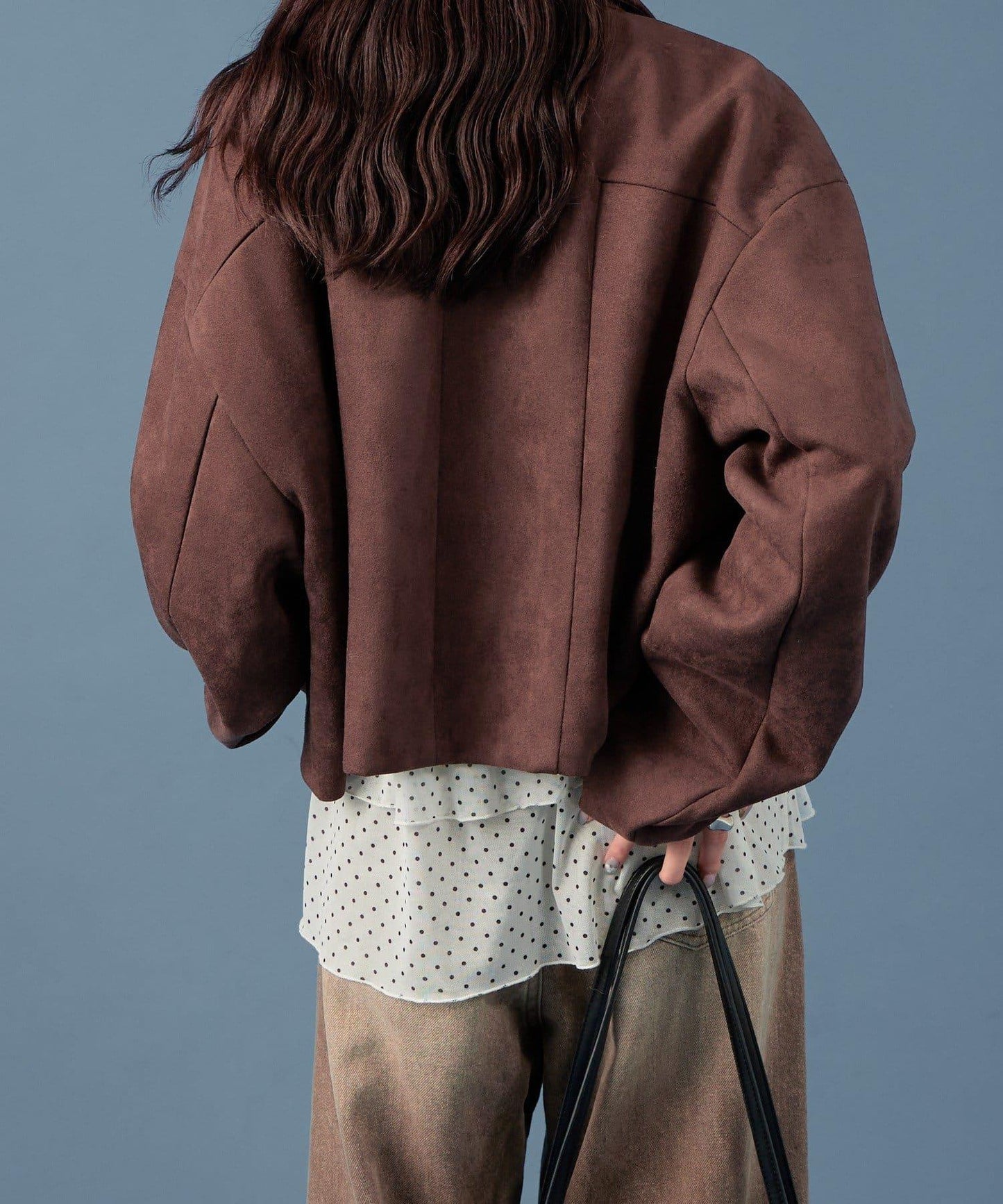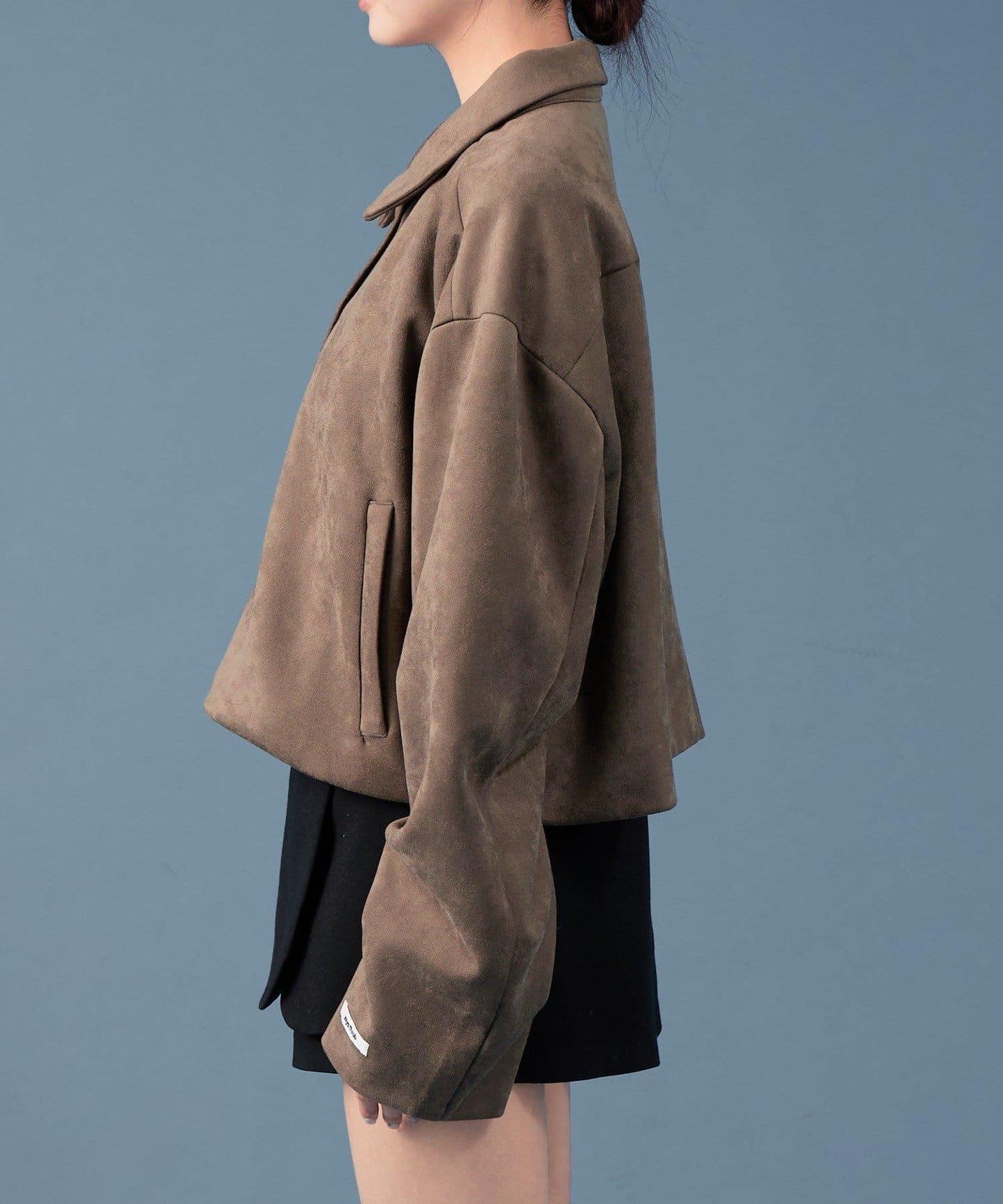 採用仿麂皮絨面料,是一款大氣的短外套。袖子寬大,可寬鬆穿著。