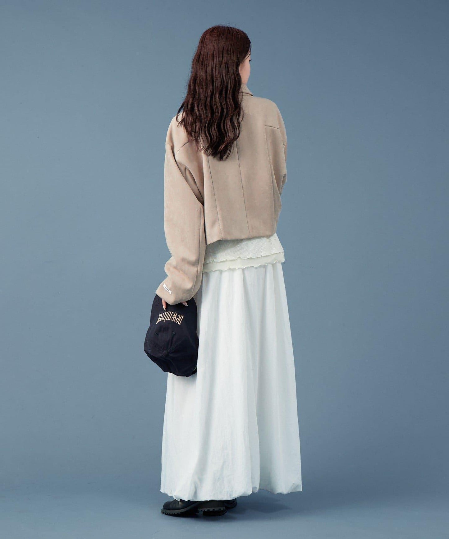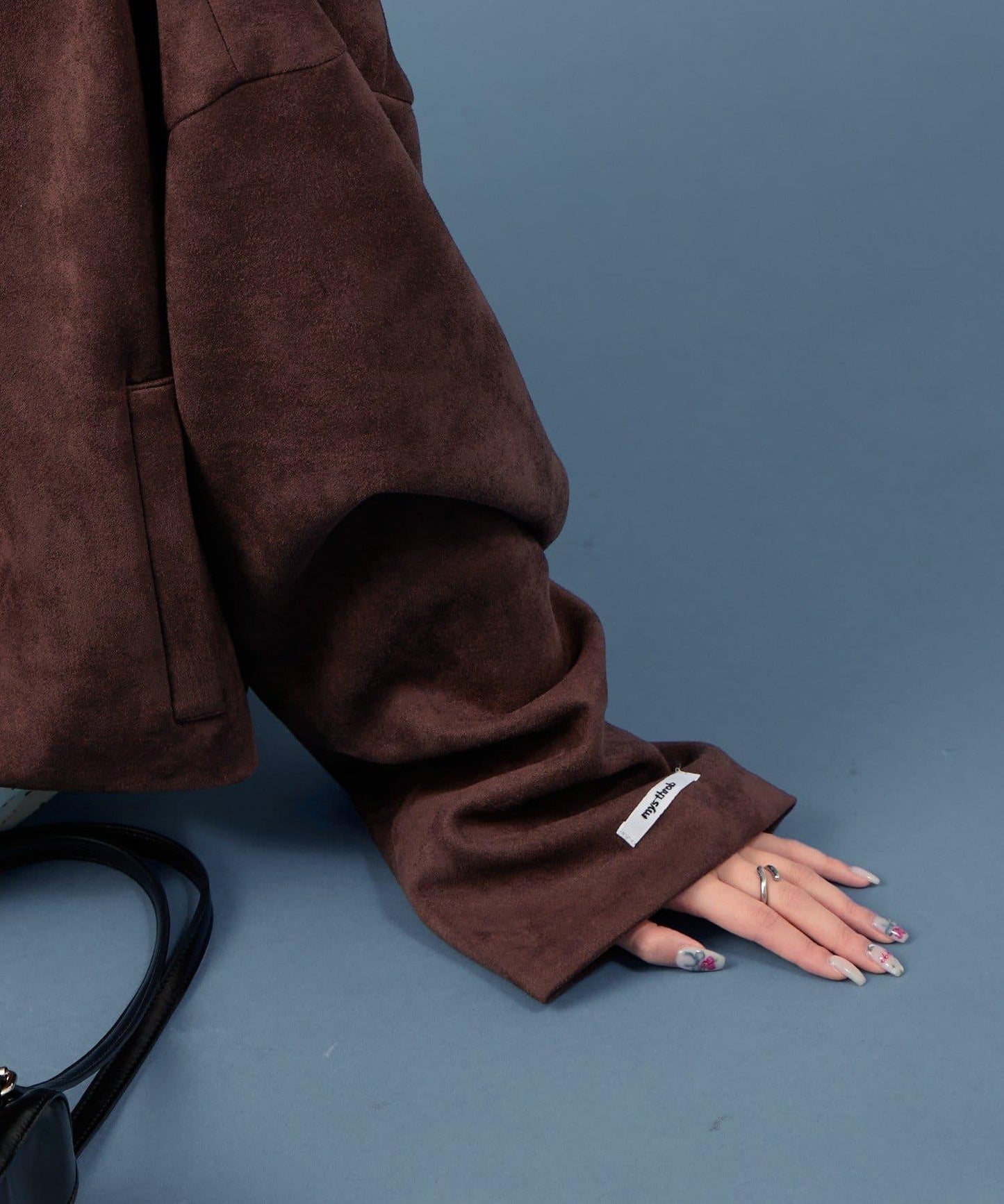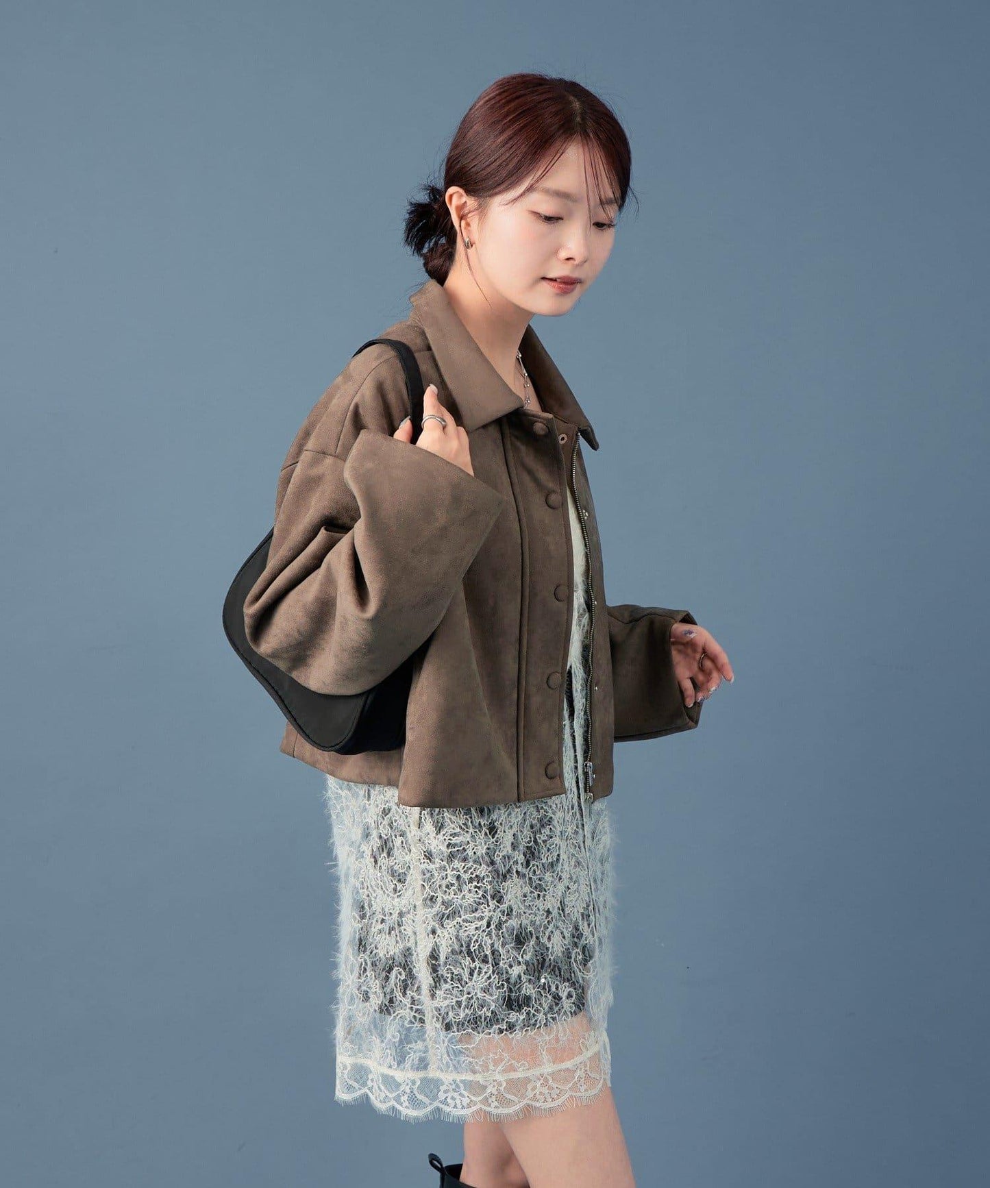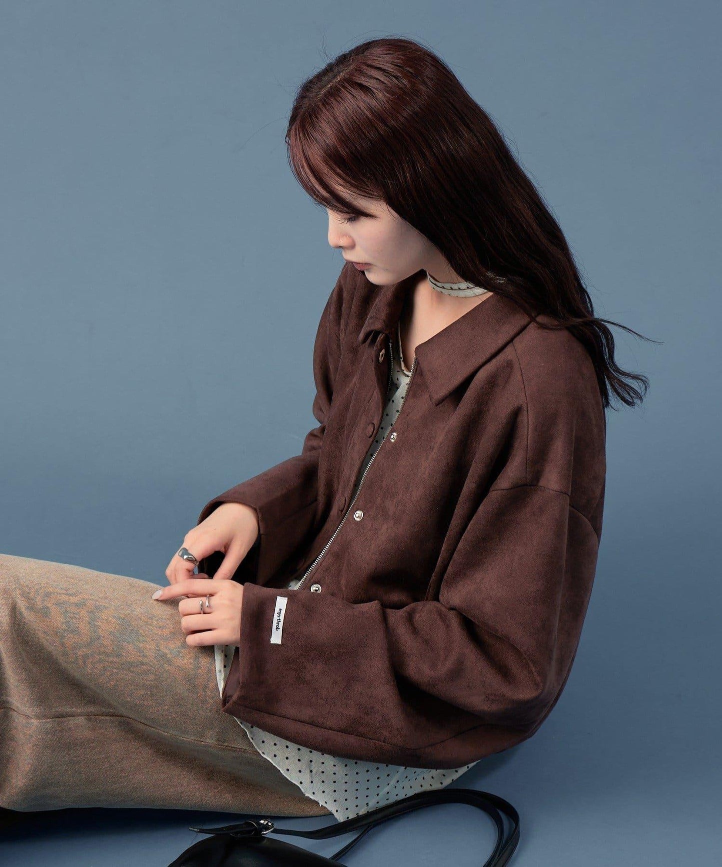 採用仿麂皮絨面料,是一款大氣的短外套。袖子寬大,可寬鬆穿著。