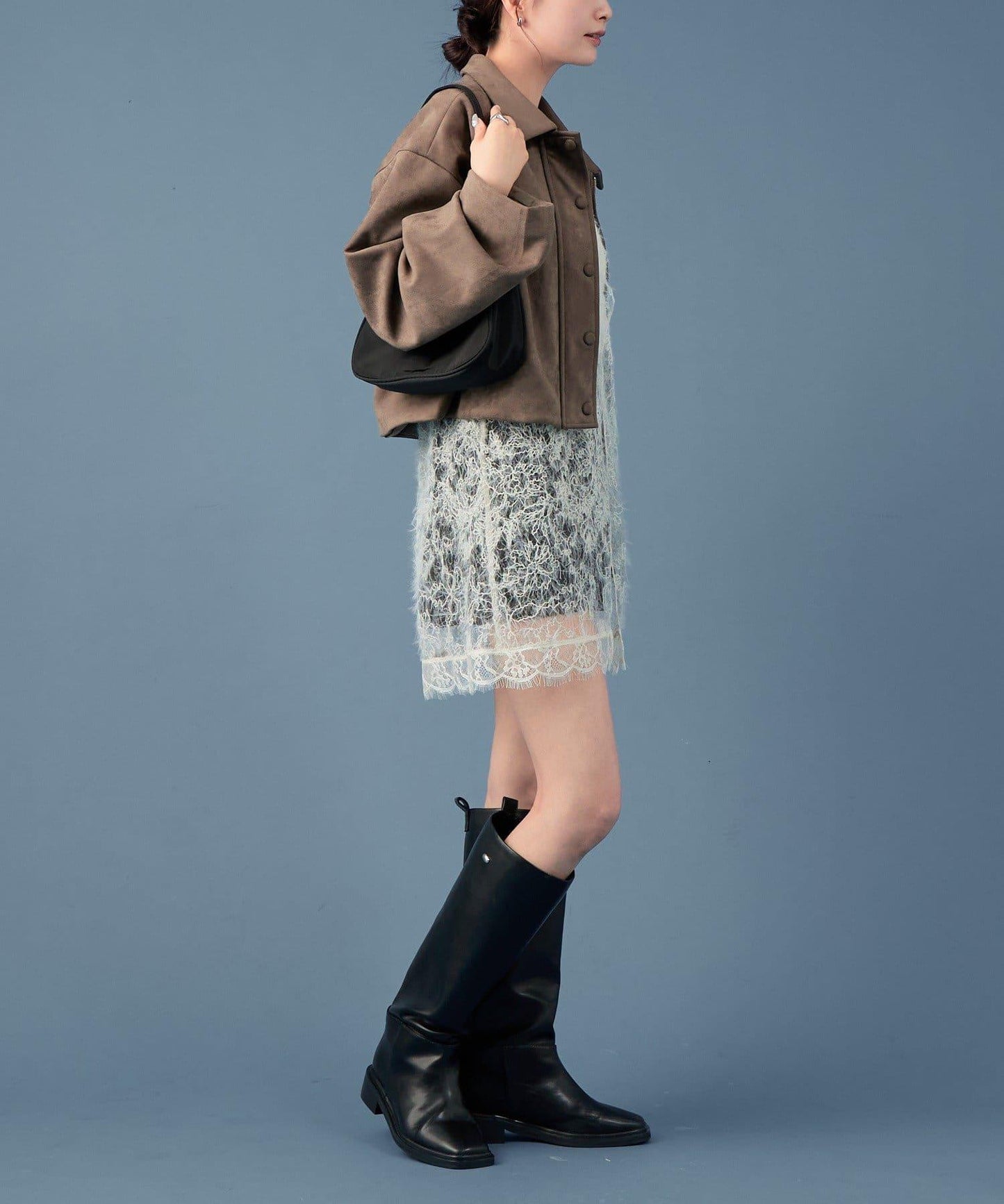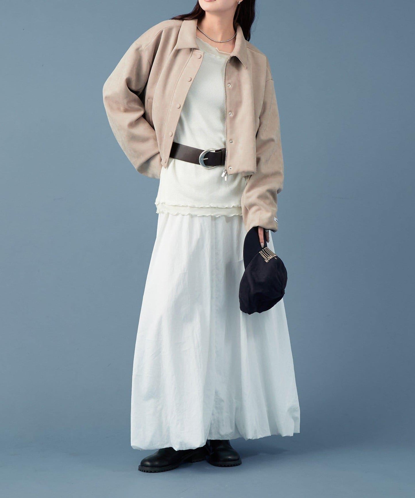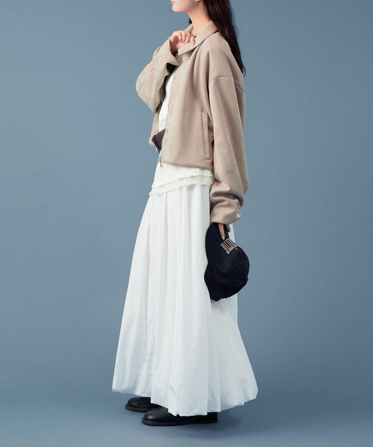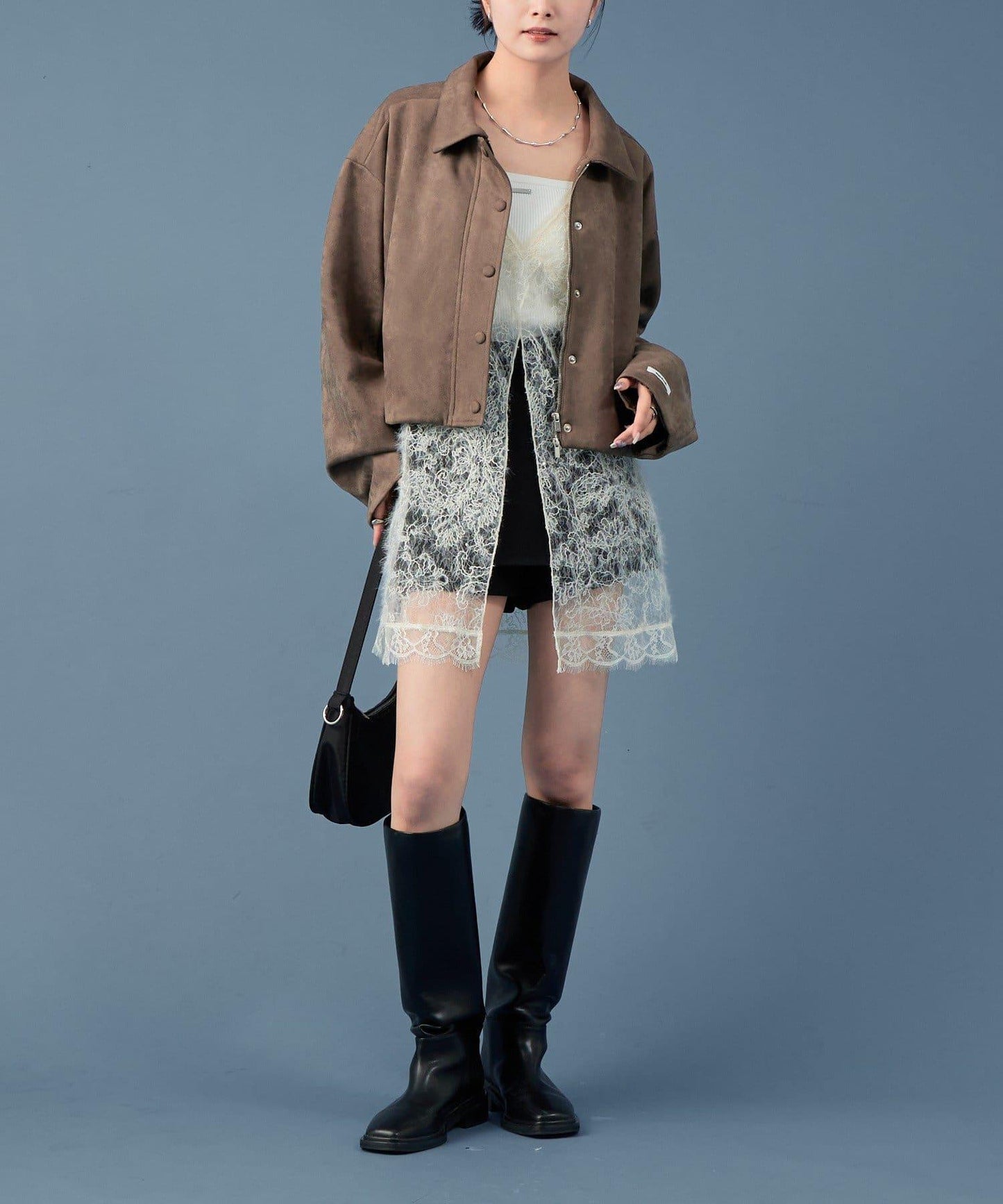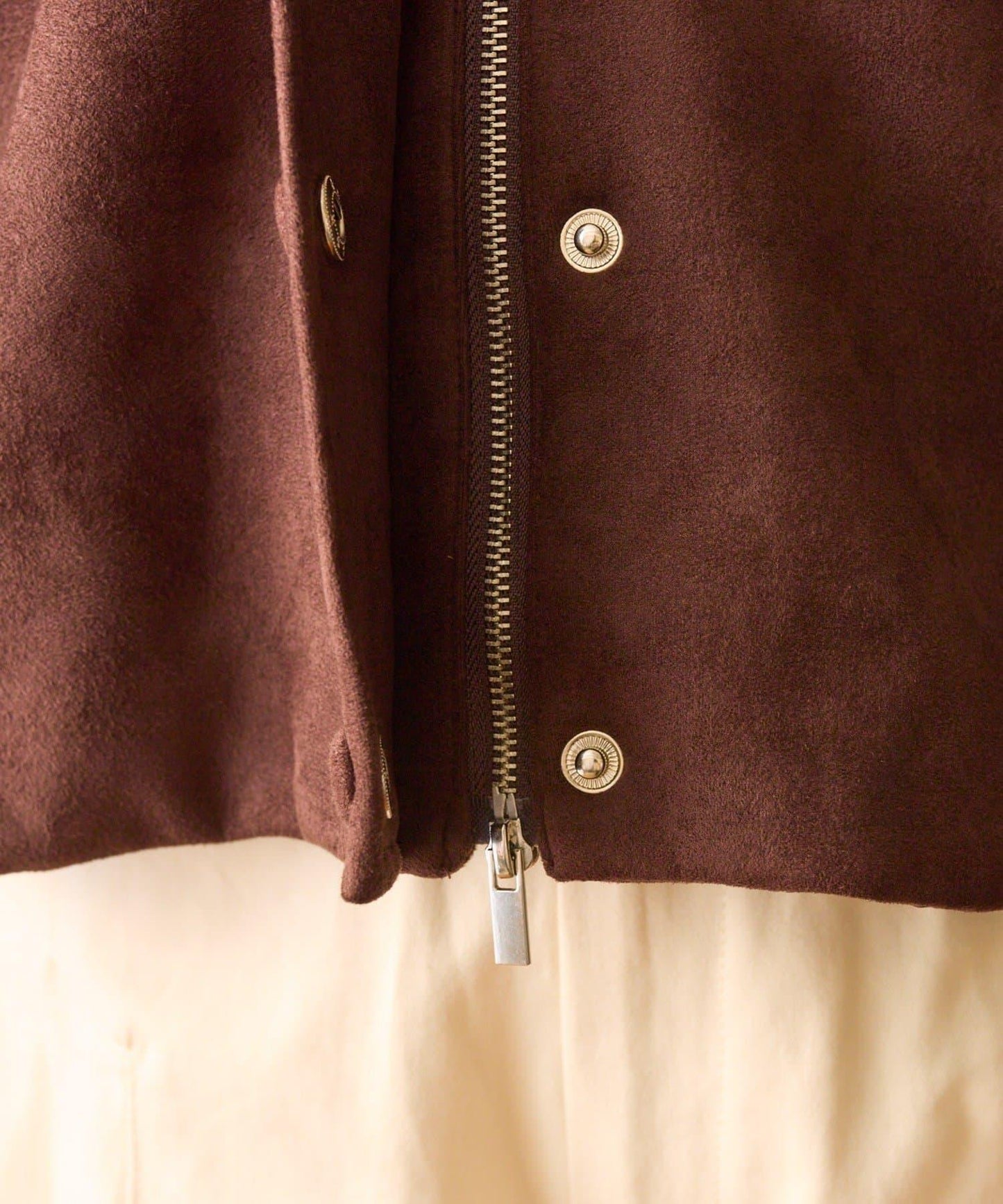 採用仿麂皮絨面料,是一款大氣的短外套。袖子寬大,可寬鬆穿著。