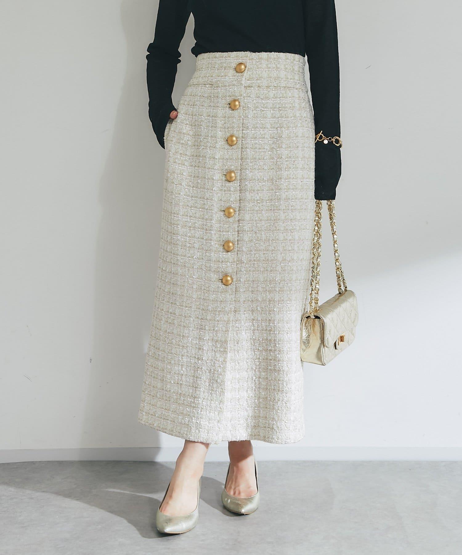 經典斜紋軟呢裙,配有醒目的金屬大紐扣。