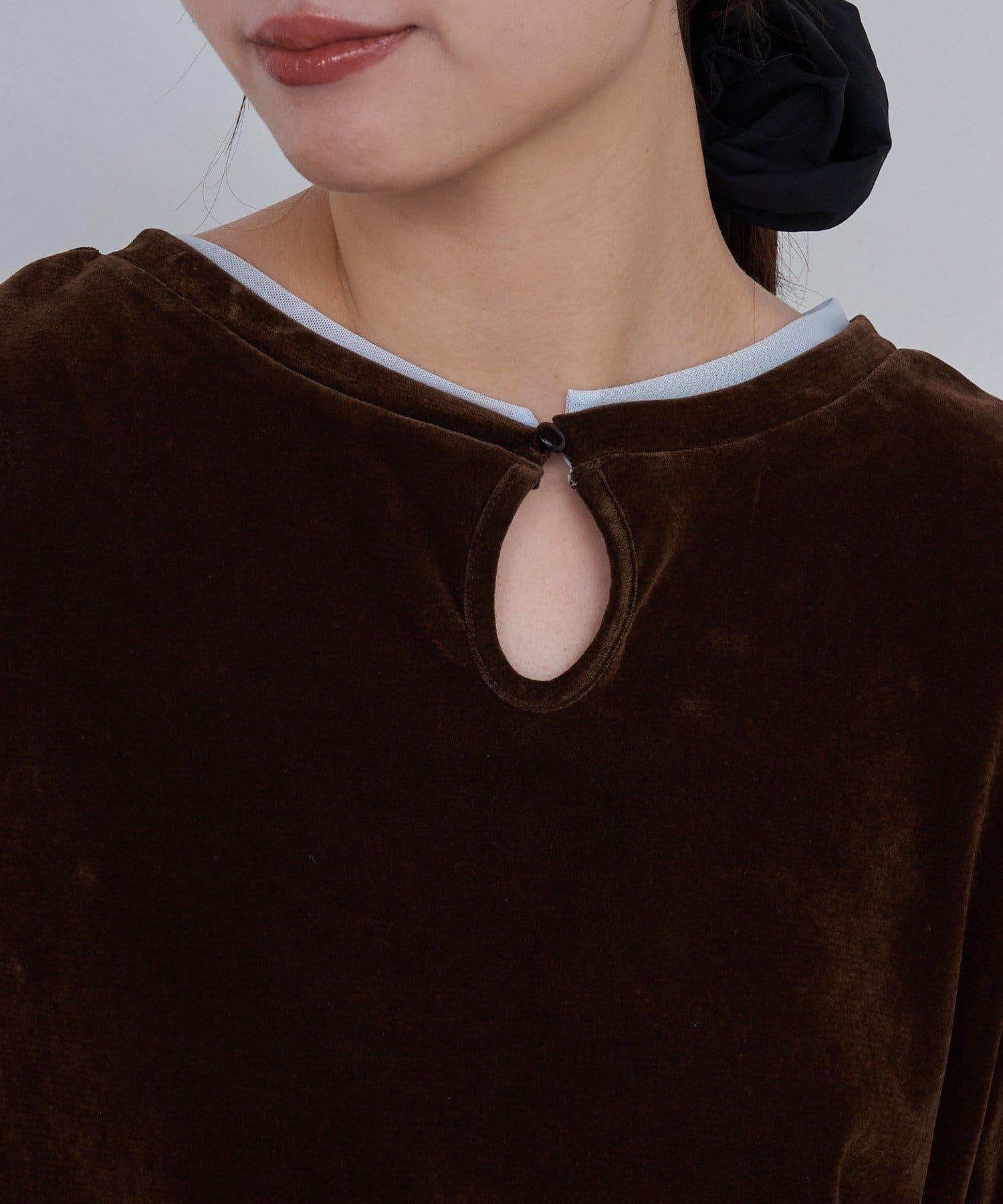 袖子和頸部採用半透明感的透視面料,以光亮平滑的絲絨面料為基礎。