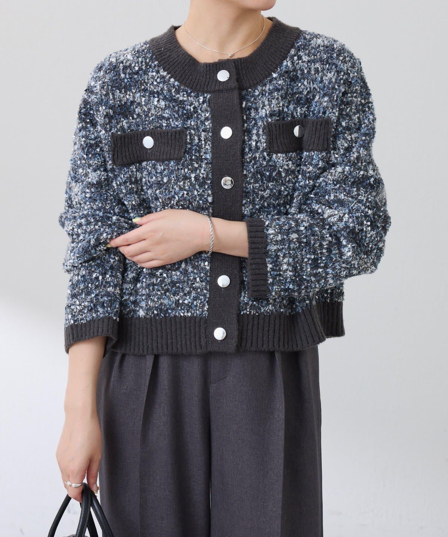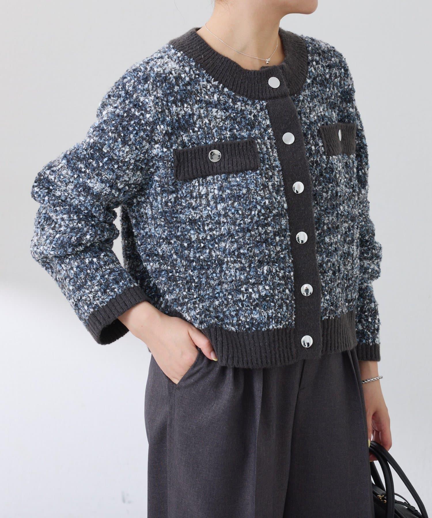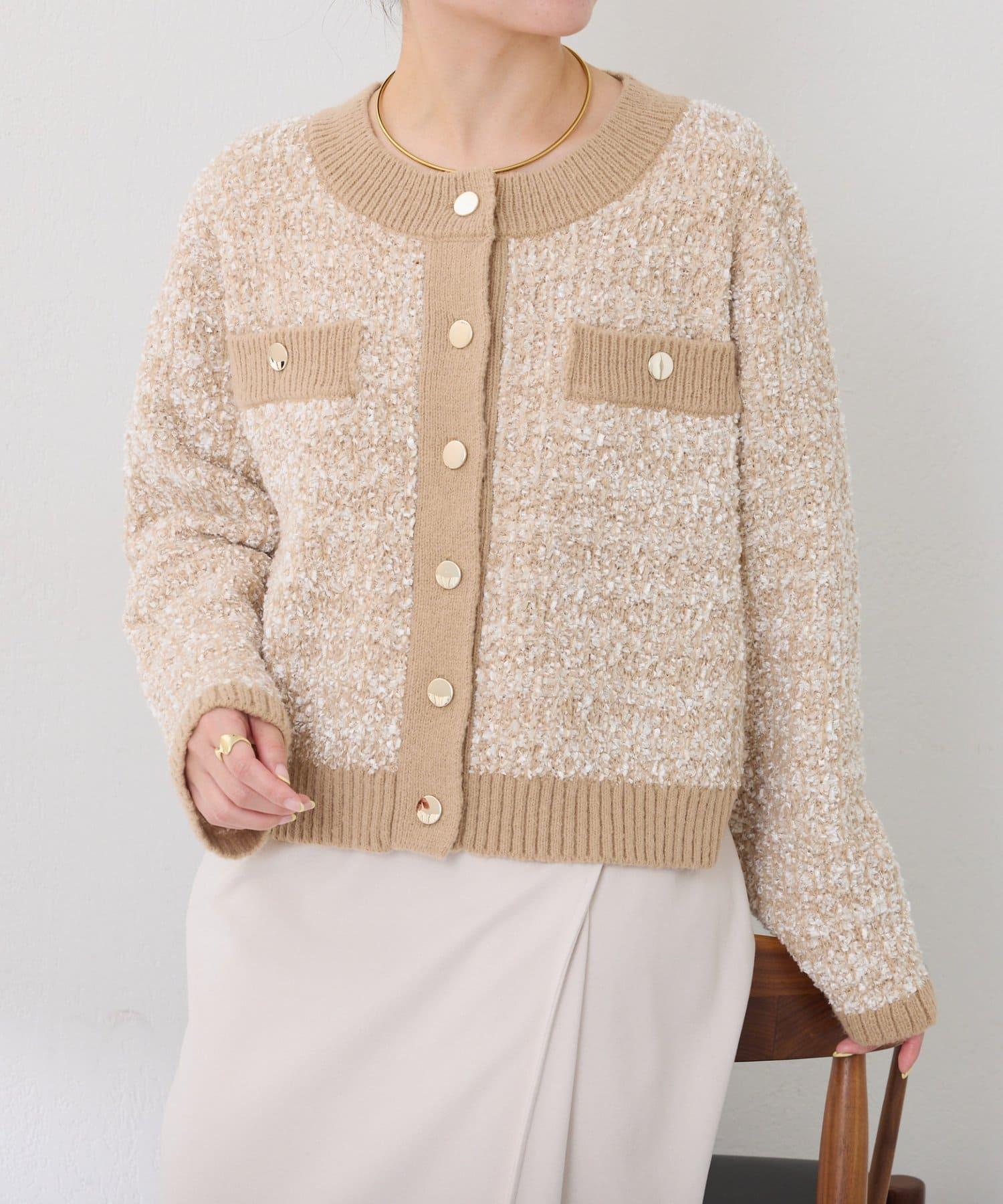 粗花呢設計的針織外套,採用絲帶般的紗線,散發出女性的柔美氣息。