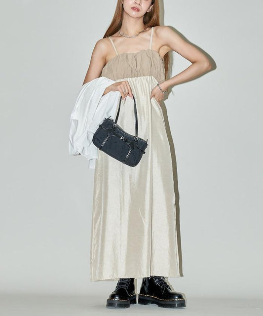 單點刺繡 下襬蕾絲 緞面吊帶連衣裙