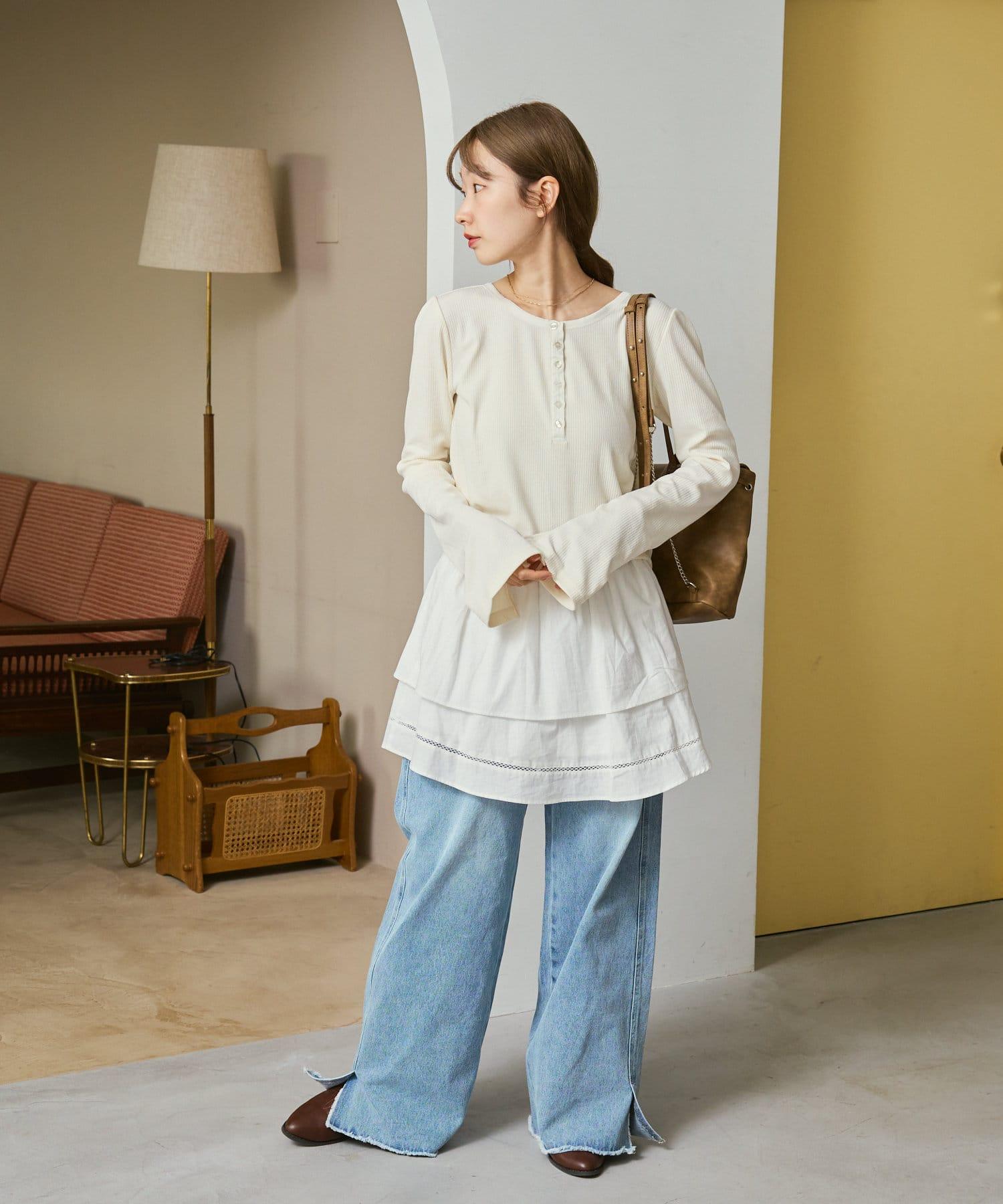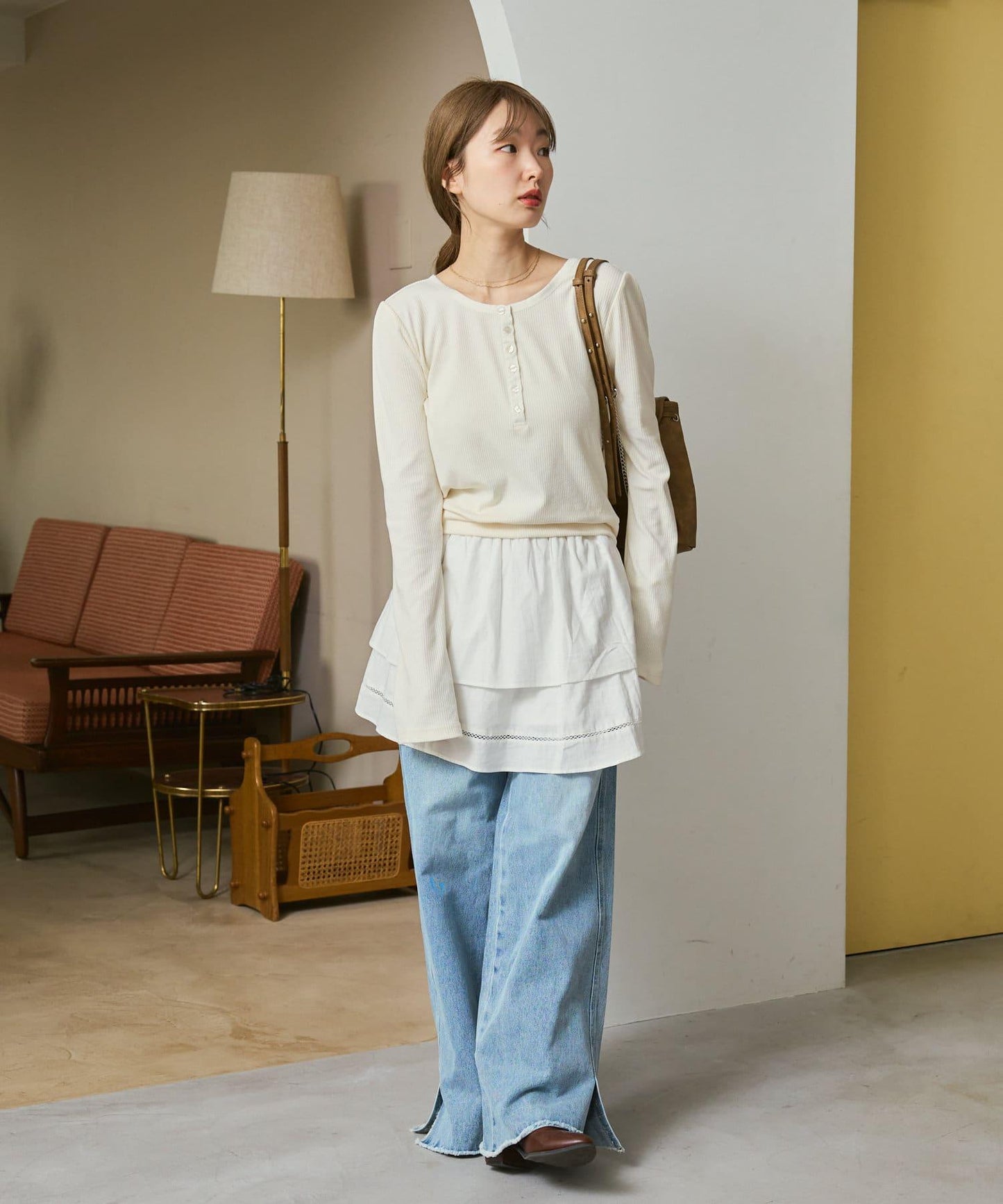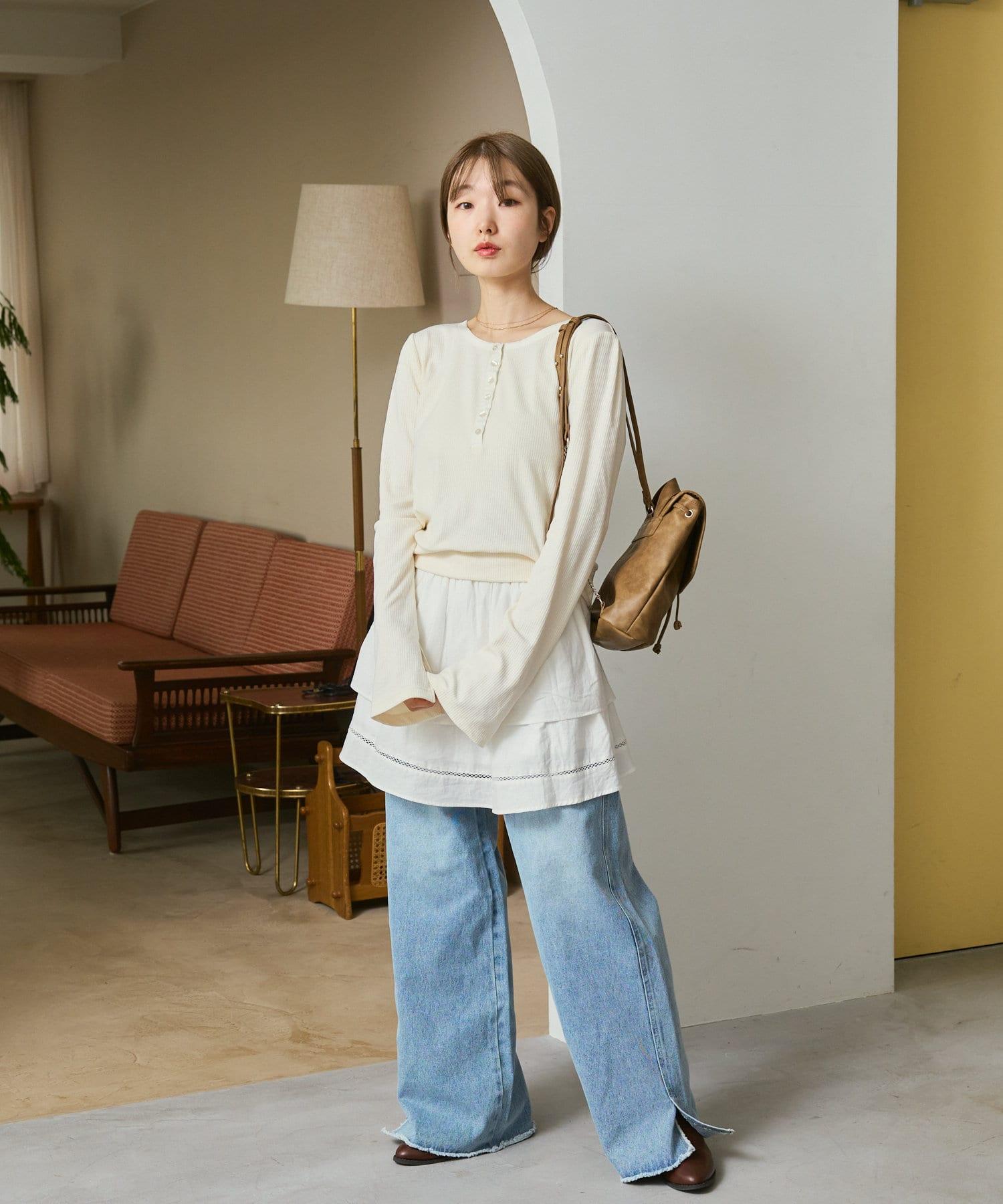 在牛仔褲或運動褲上疊加褶邊迷你裙,打造簡約而精緻的造型,盡顯女性的寬鬆感。