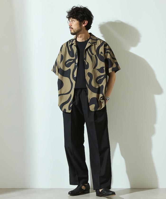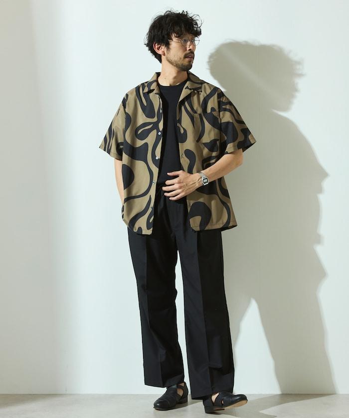 由於它是一款基本廓形的開領襯衫,因此是一款百搭性很強的單品,很容易與現有的下裝搭配。由於採用全圖案設計,只需搭配牛仔褲或寬鬆長褲即可完成造型。當然,這款單品也可以收口穿著,但作為梭織服裝也很實用,很容易搭配出協調的造型。此外,還建議搭配相同花紋的短褲,營造出套裝風格。