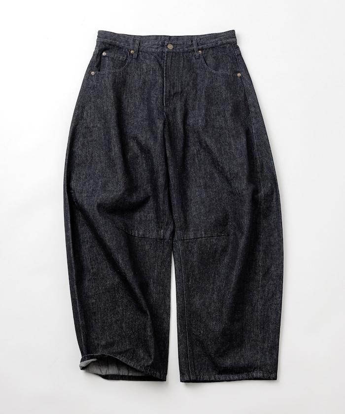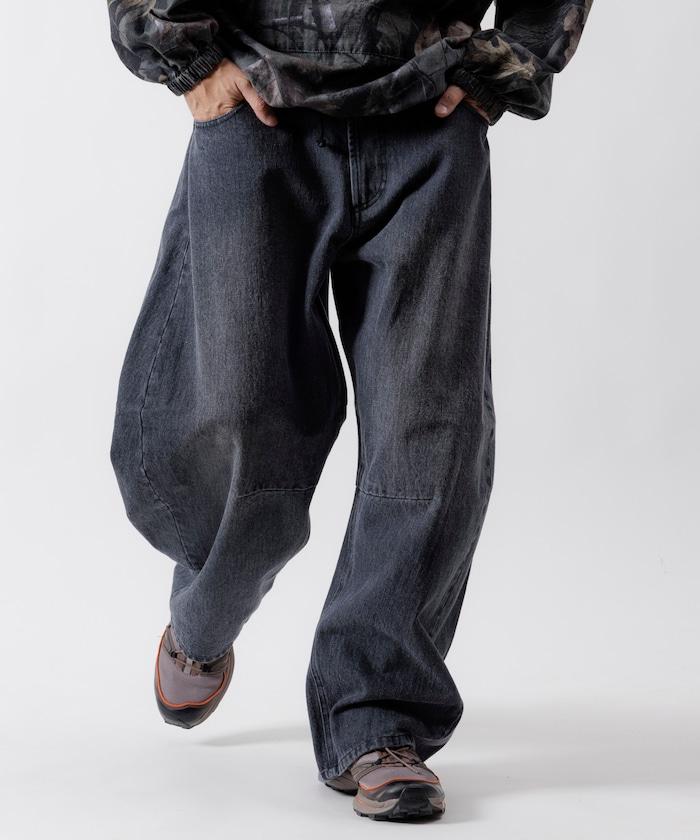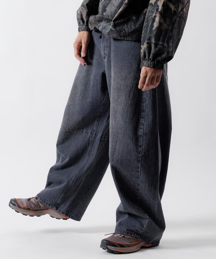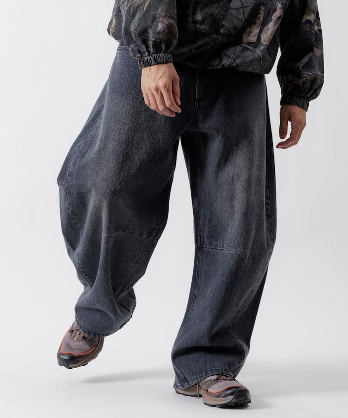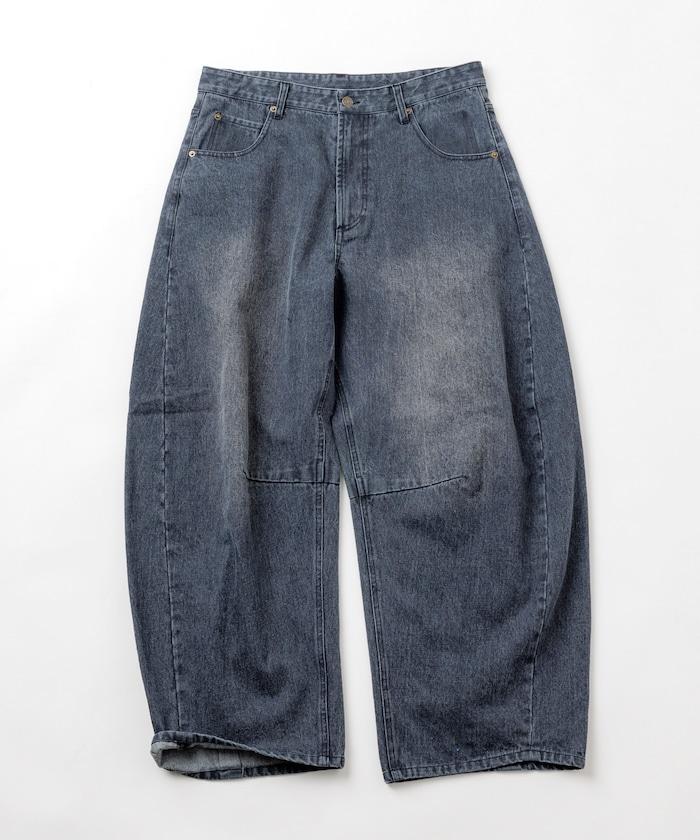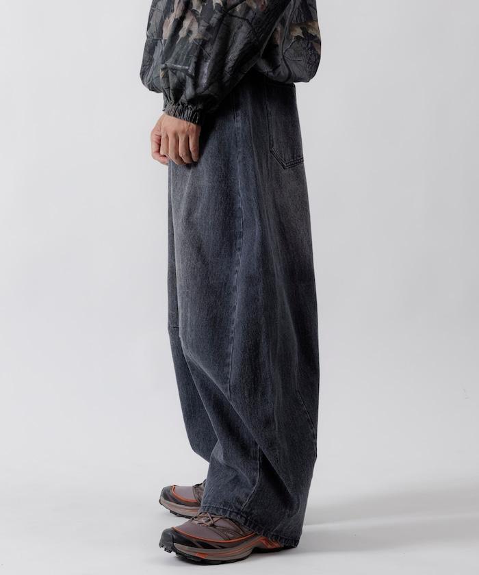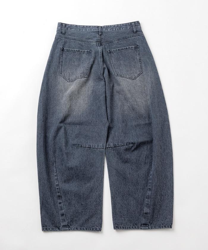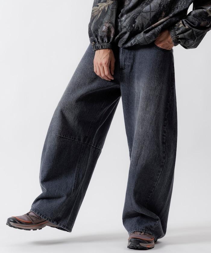 弧形牛仔長褲,採用特殊處理和立體剪裁。