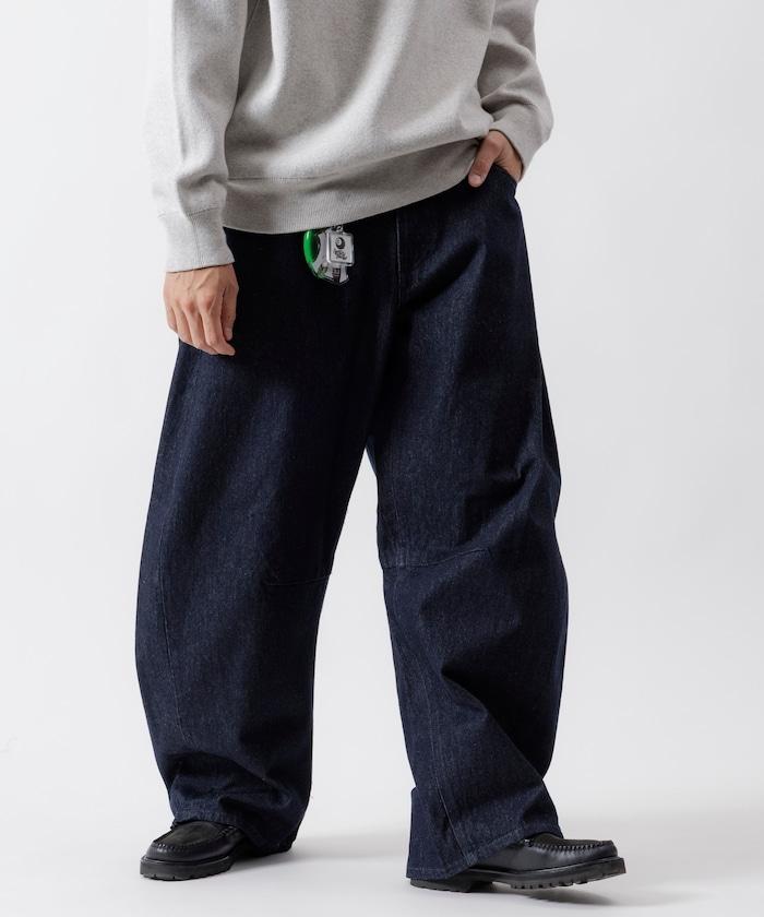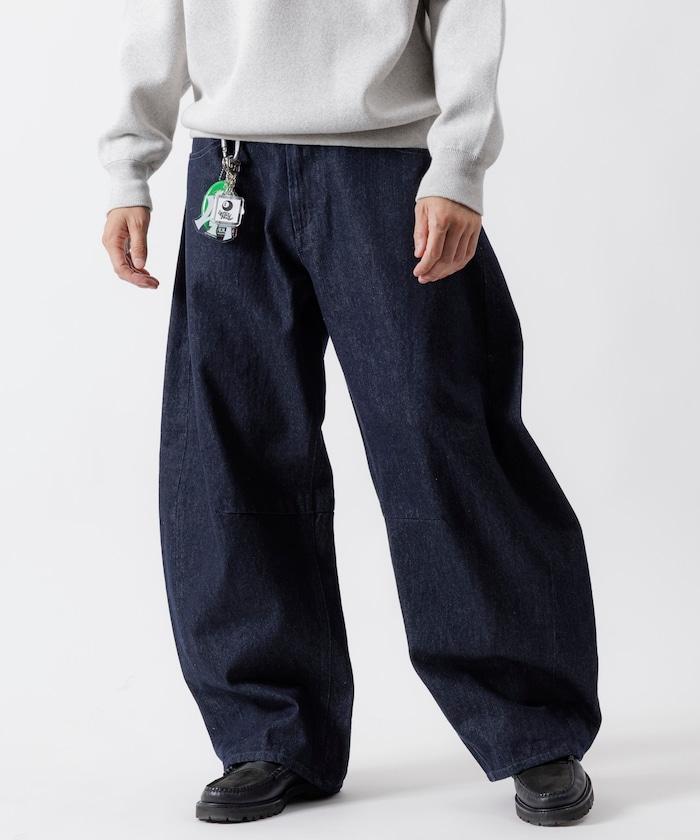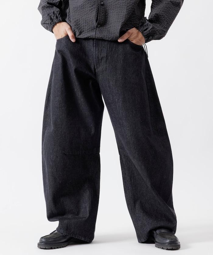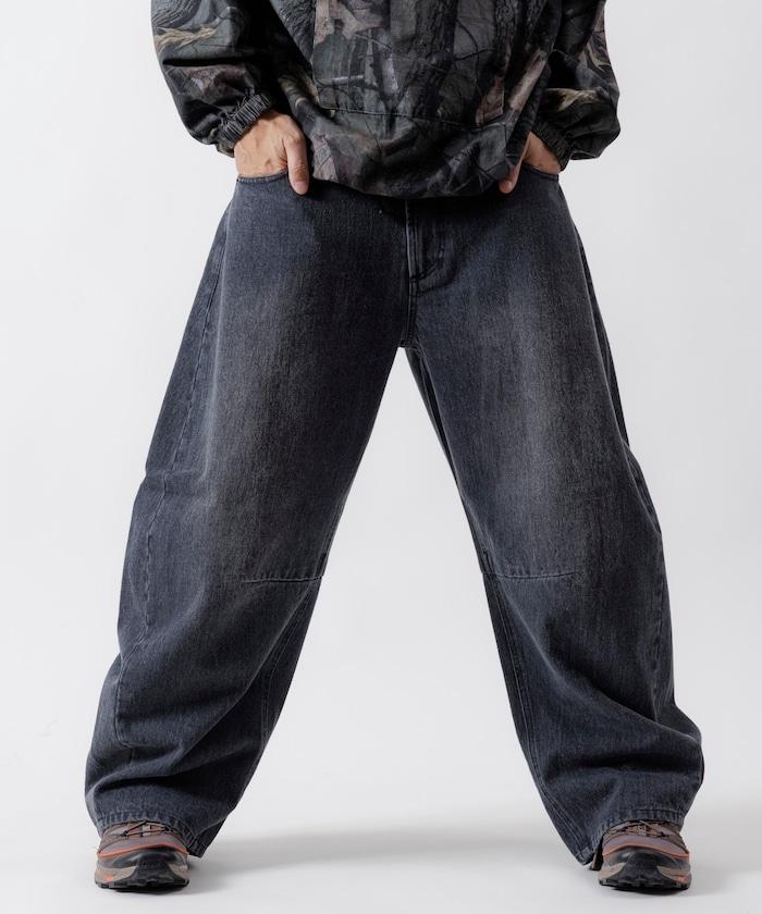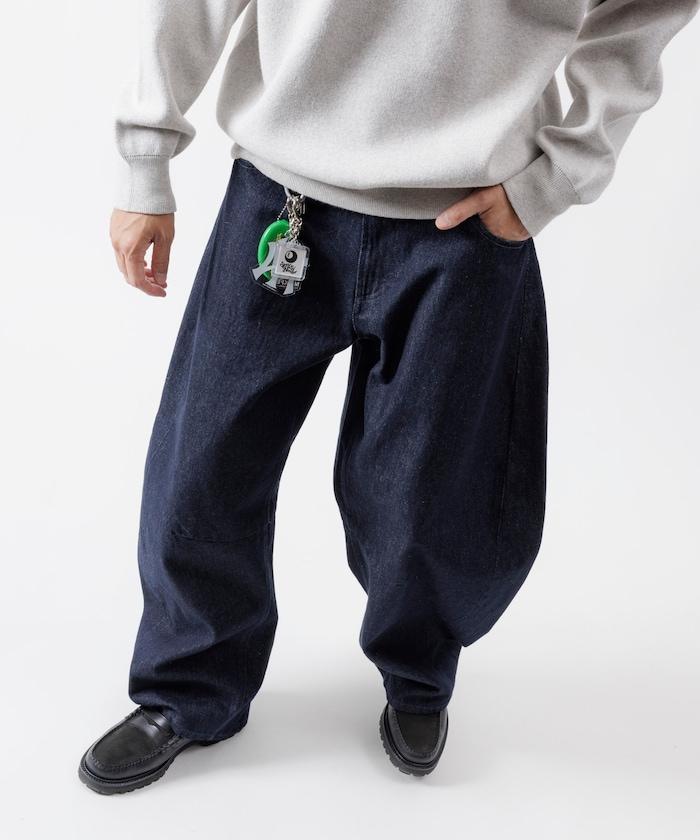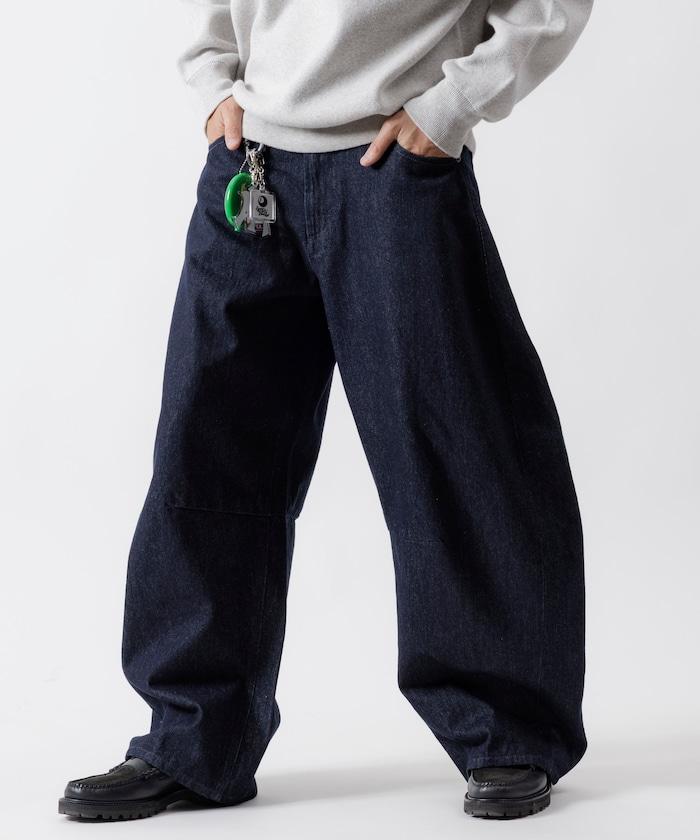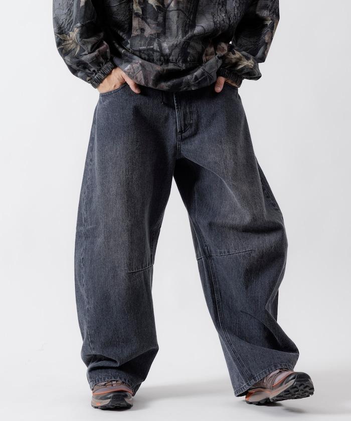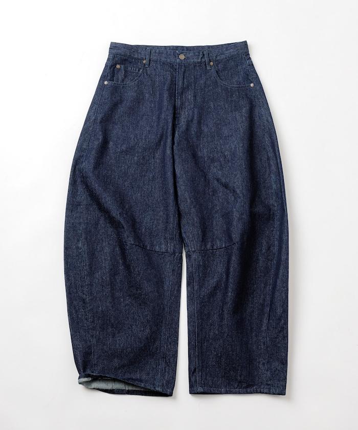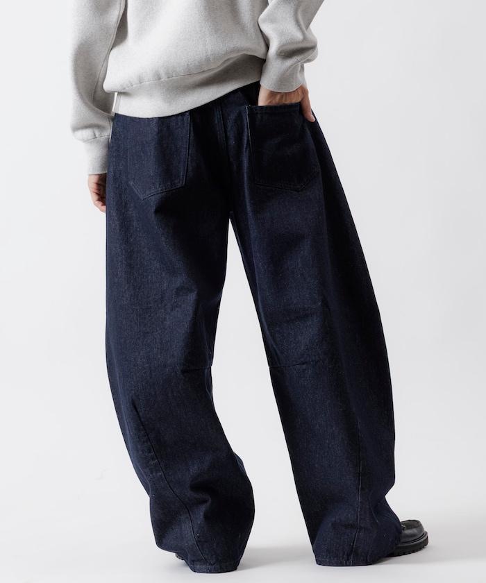 弧形牛仔長褲,採用特殊處理和立體剪裁。