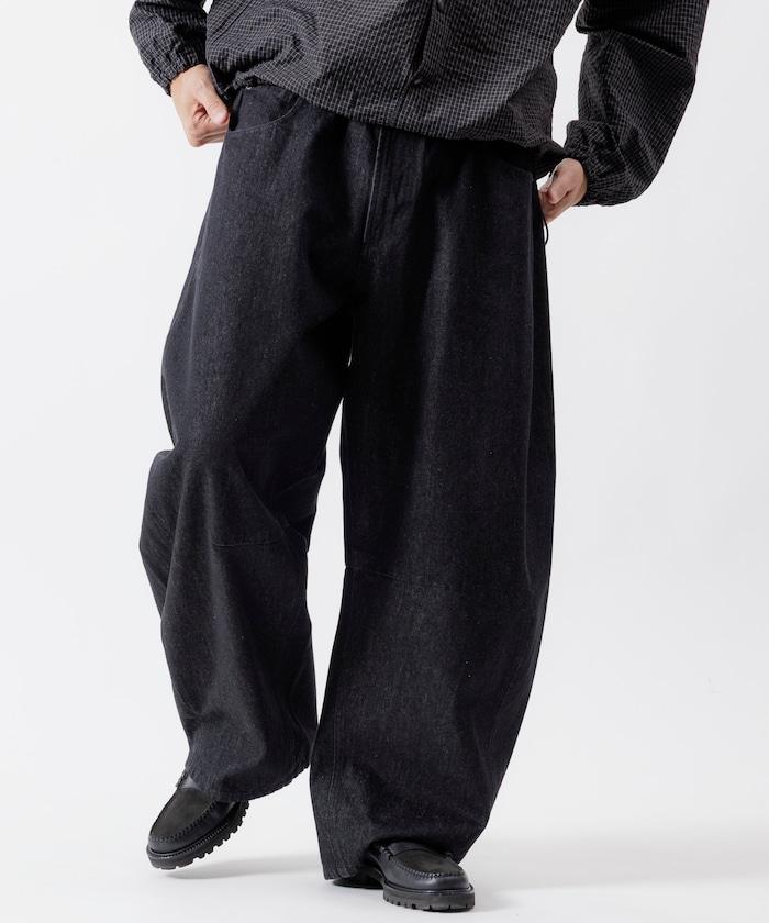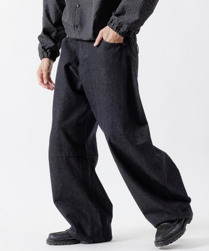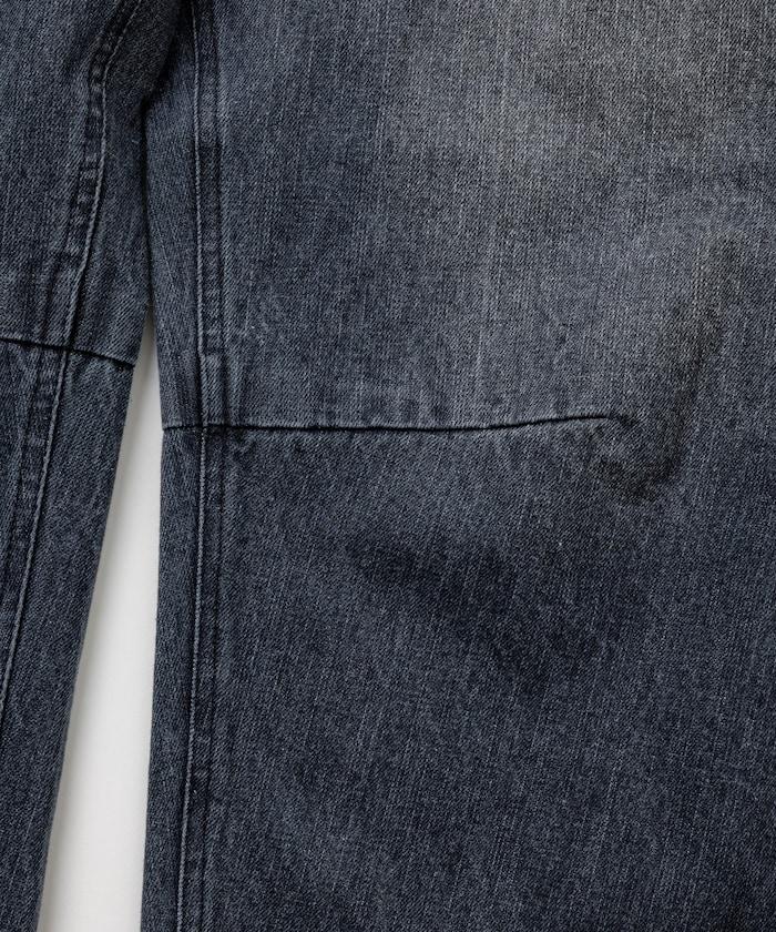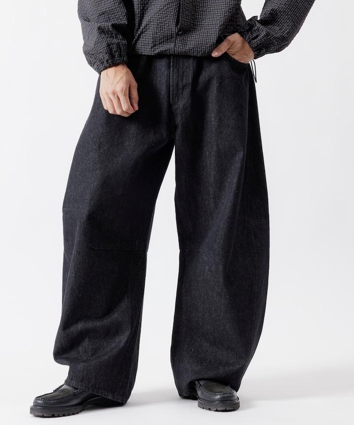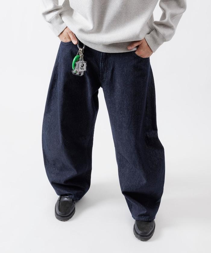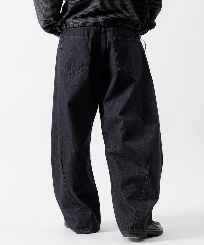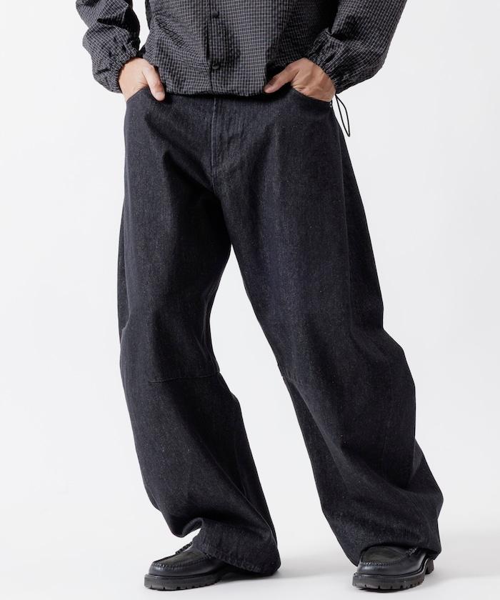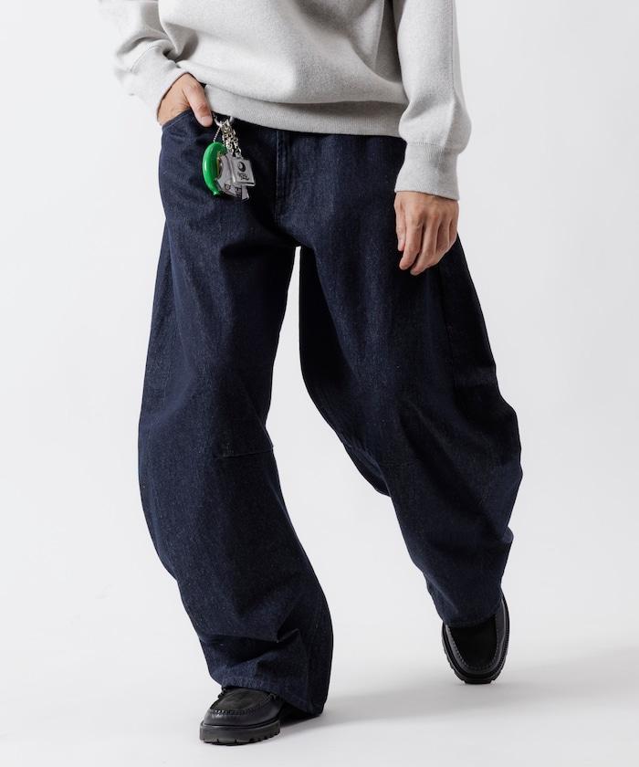 弧形牛仔長褲,採用特殊處理和立體剪裁。