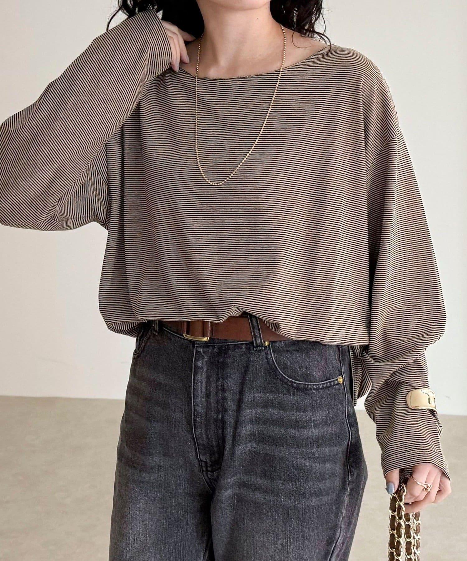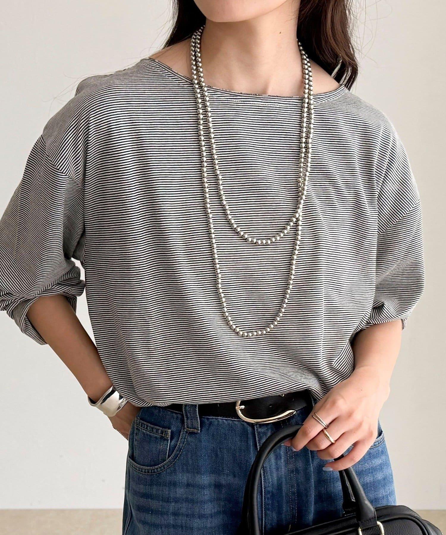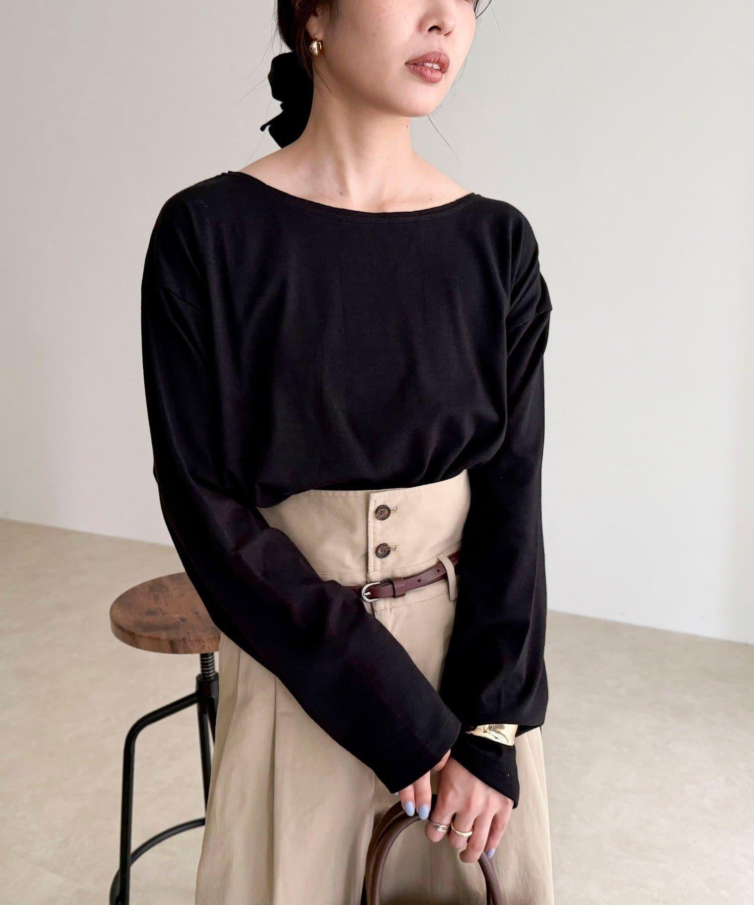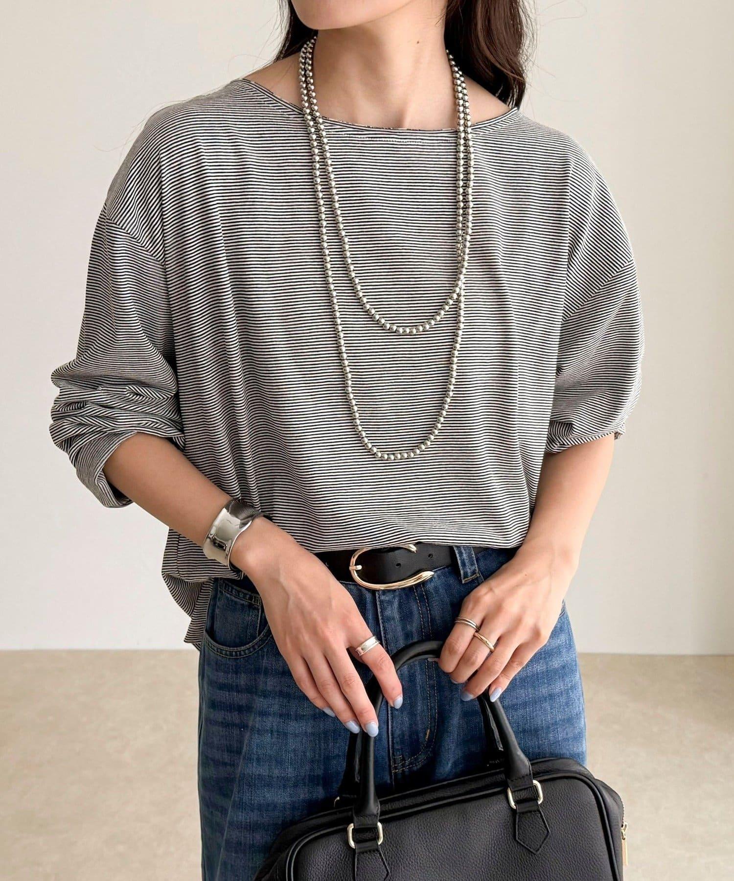 身高 156 厘米的工作人員:長度輕盈地掛在臀部,即使外穿也很整潔!船領設計讓頸部看起來乾淨利落,穿起來輕盈柔軟。它是一件百搭的上衣,還能遮蓋身形。