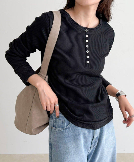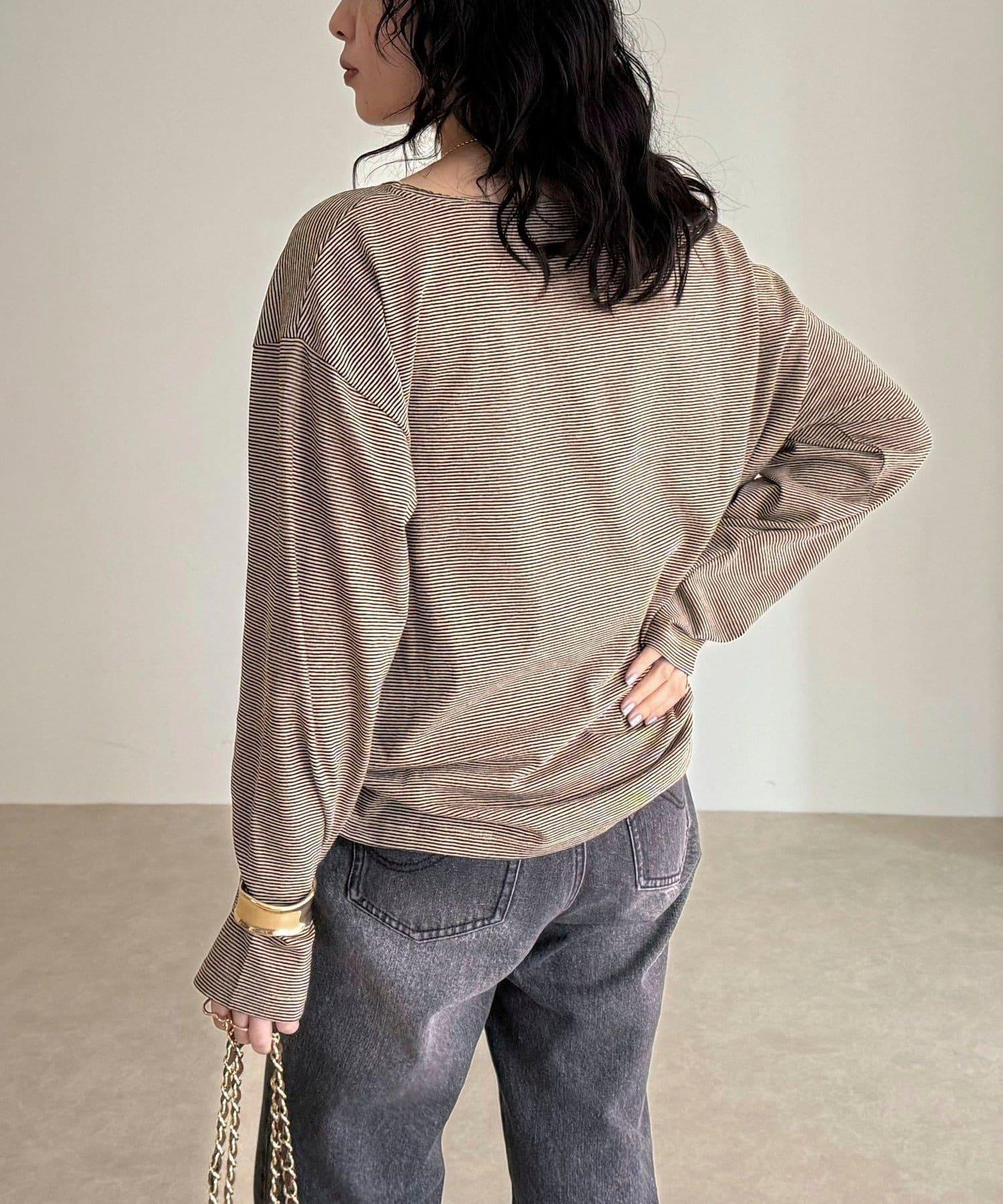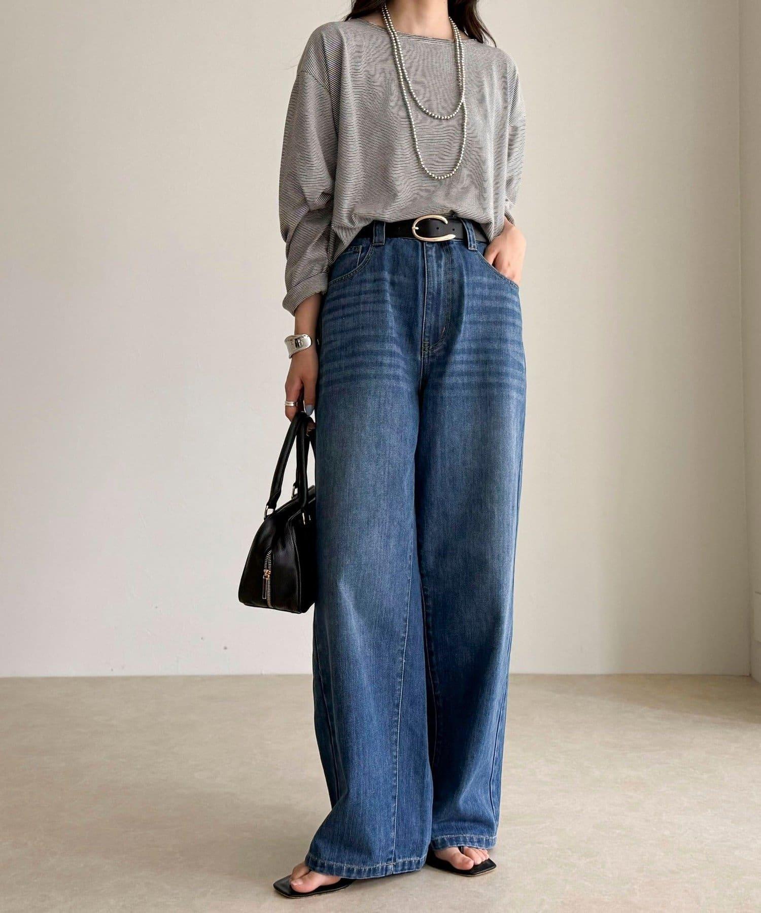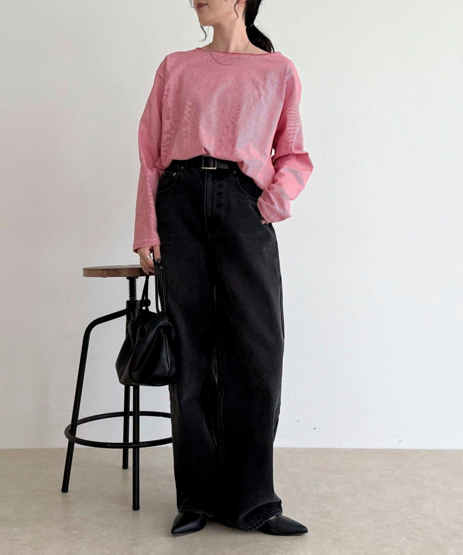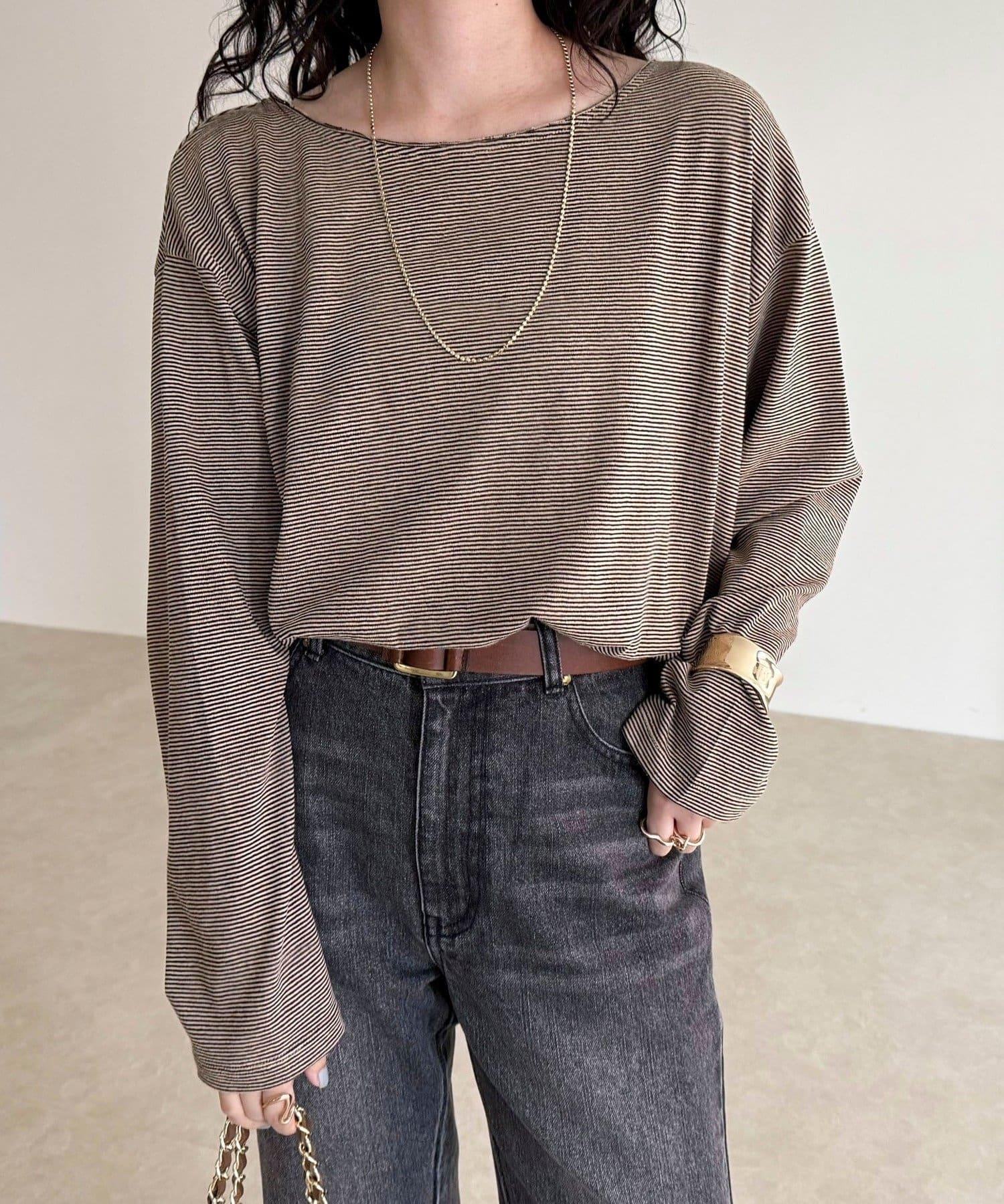 身高 156 厘米的工作人員:長度輕盈地掛在臀部,即使外穿也很整潔!船領設計讓頸部看起來乾淨利落,穿起來輕盈柔軟。它是一件百搭的上衣,還能遮蓋身形。