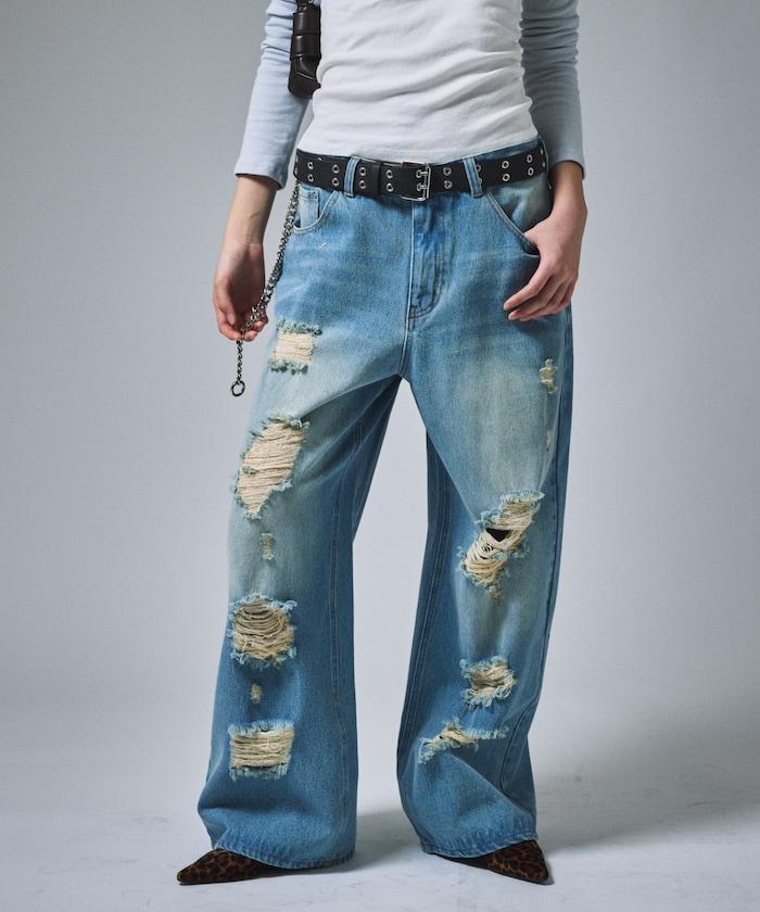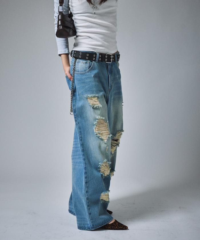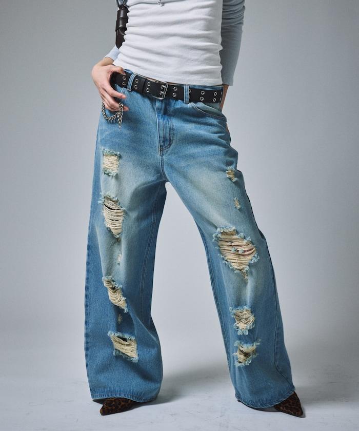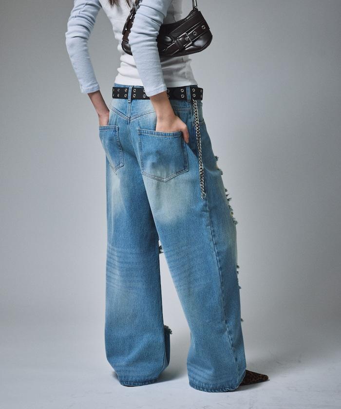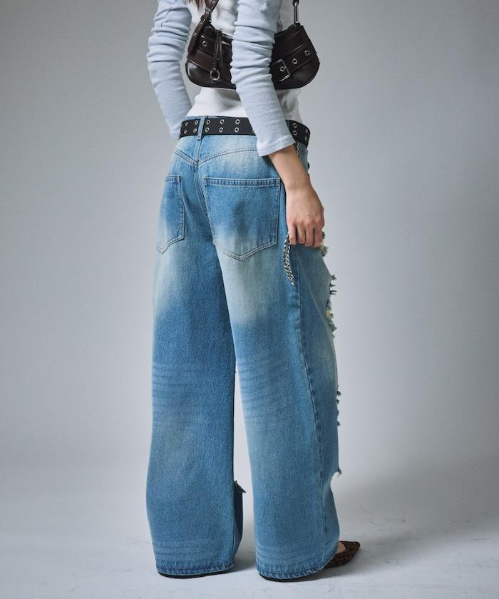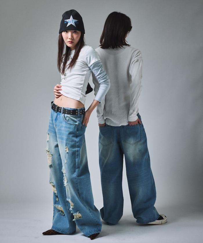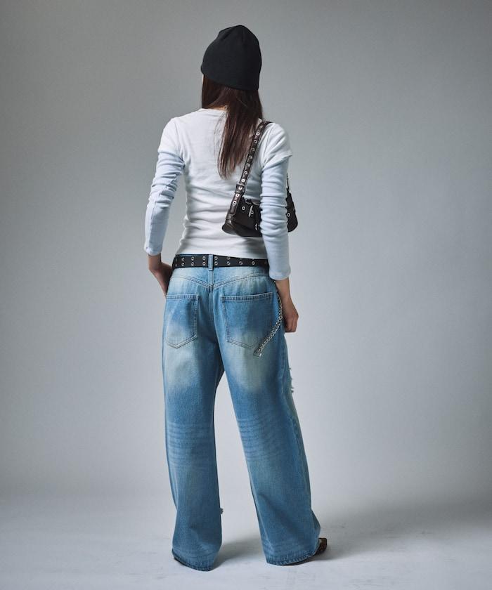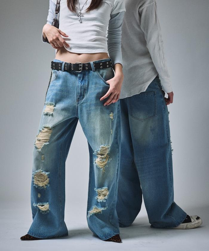復古水洗破損寬鬆牛仔褲