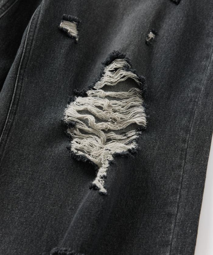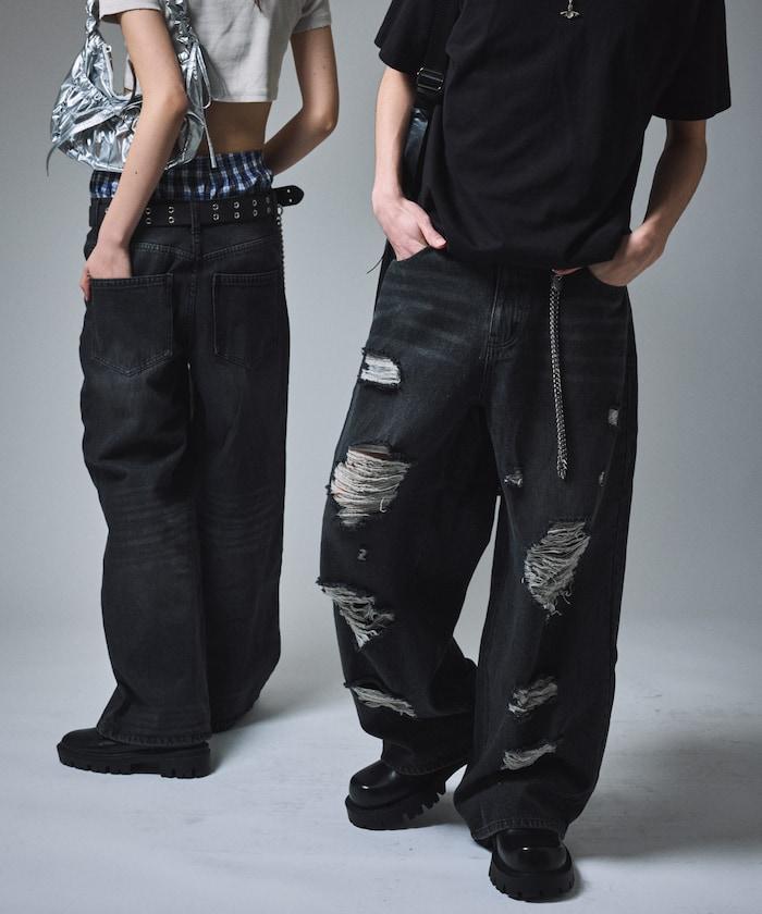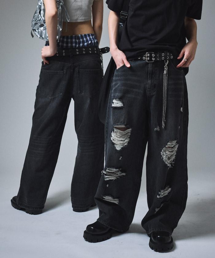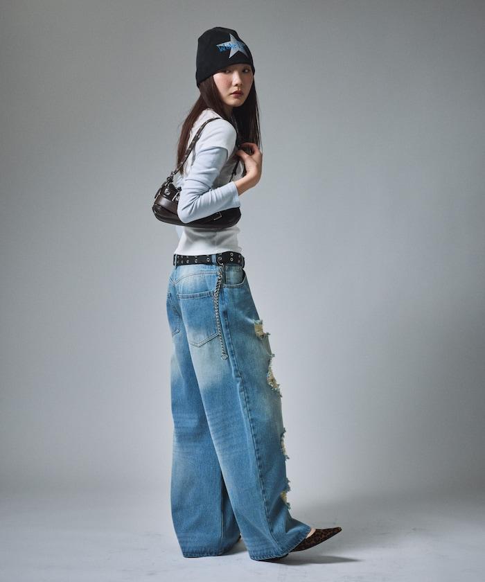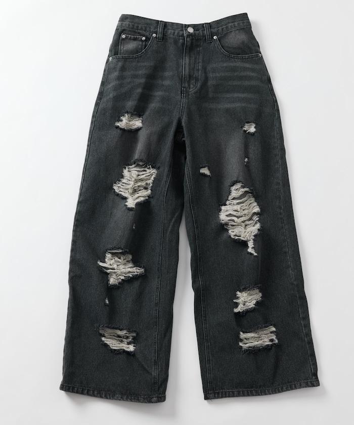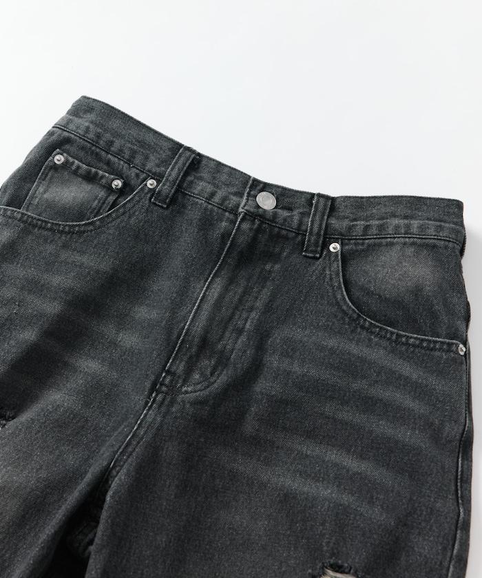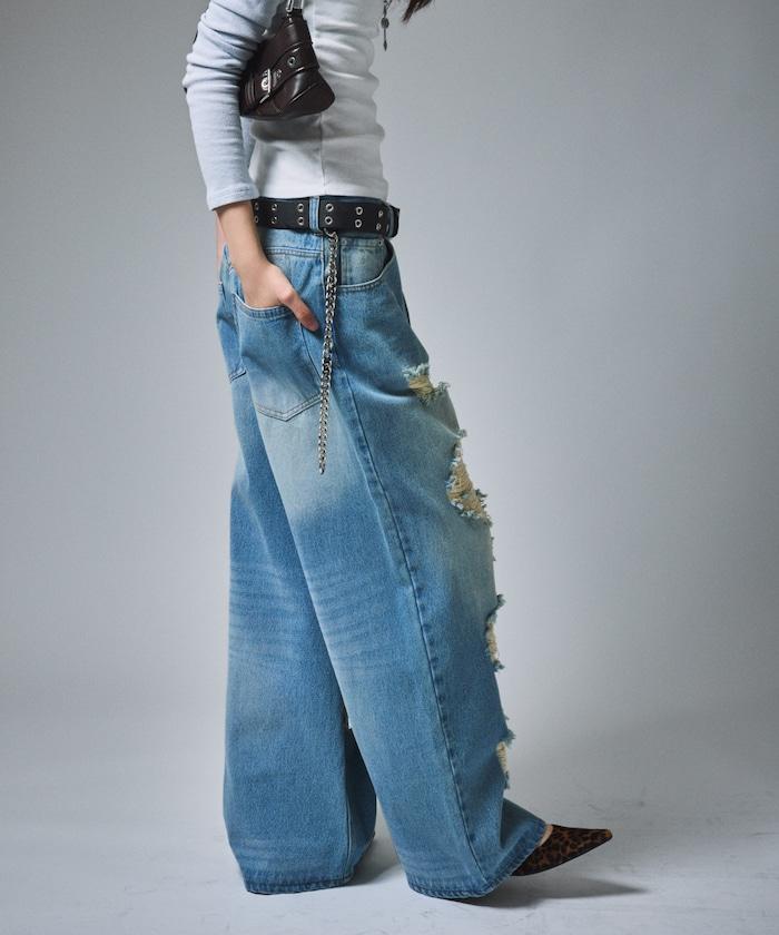復古水洗破損寬鬆牛仔褲