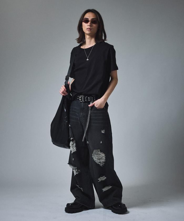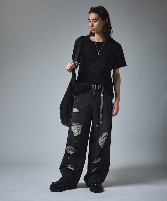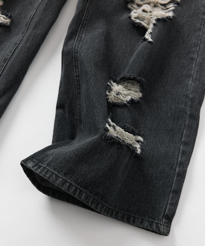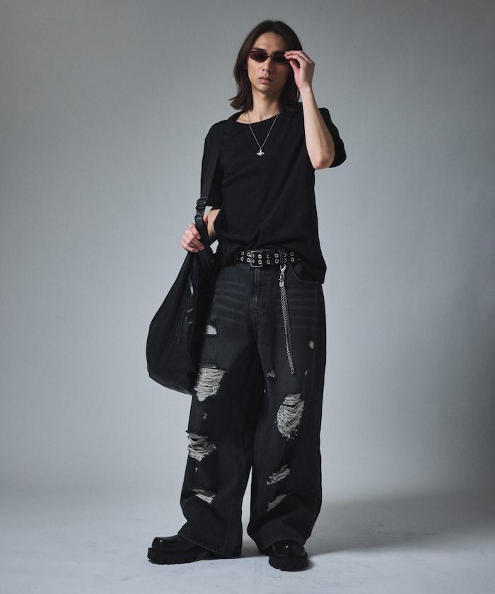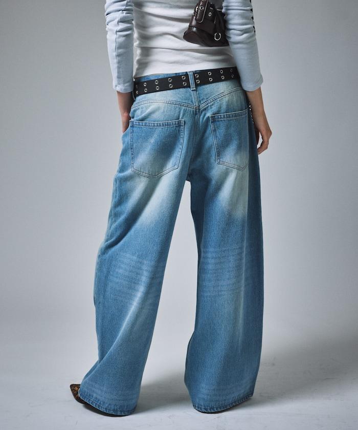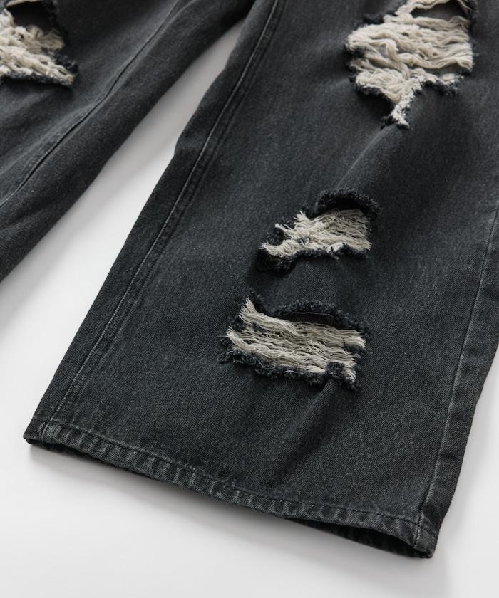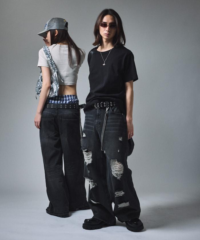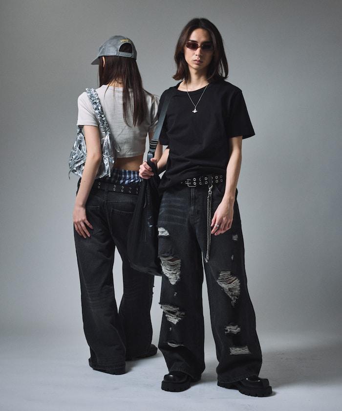 復古水洗破損寬鬆牛仔褲