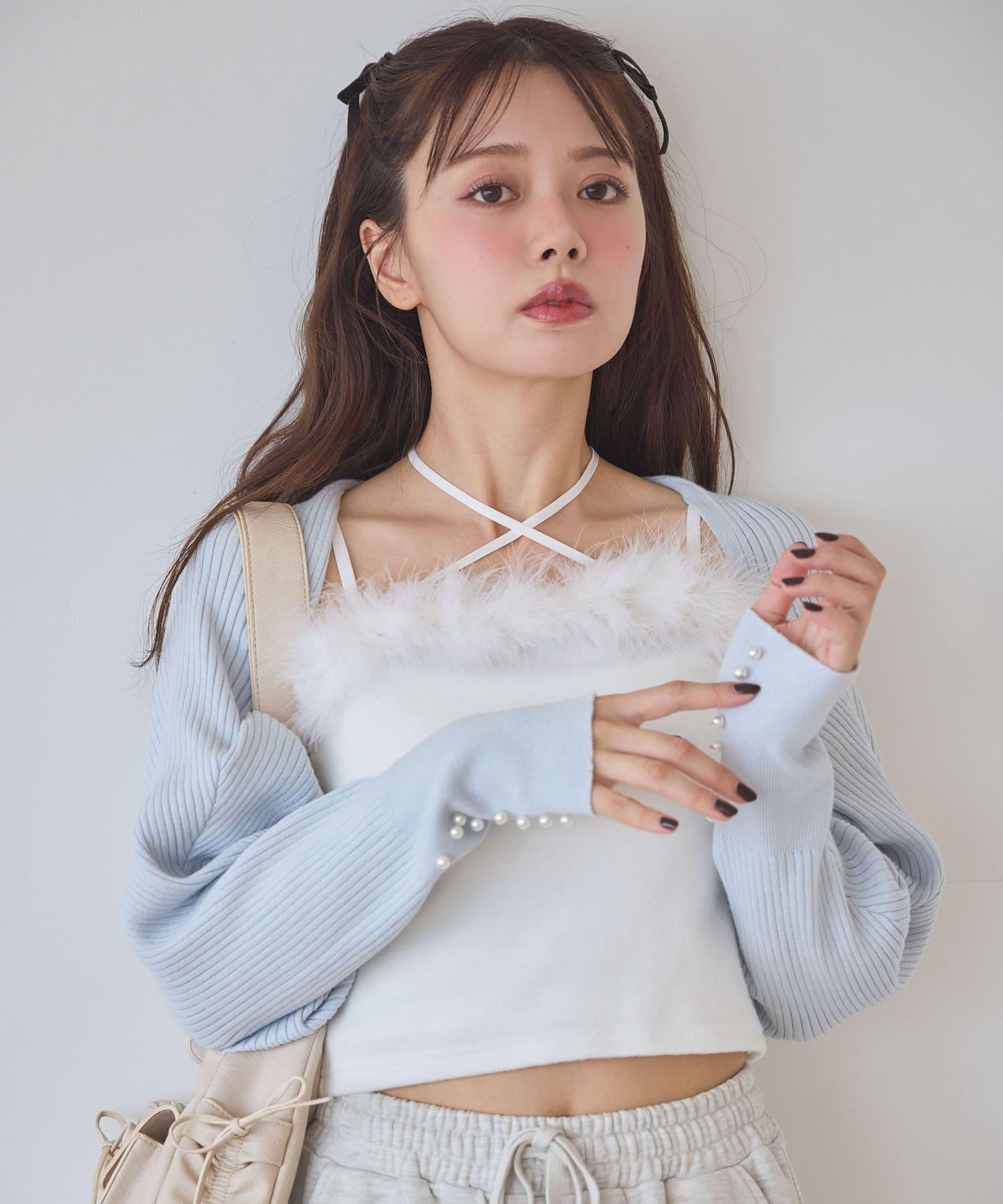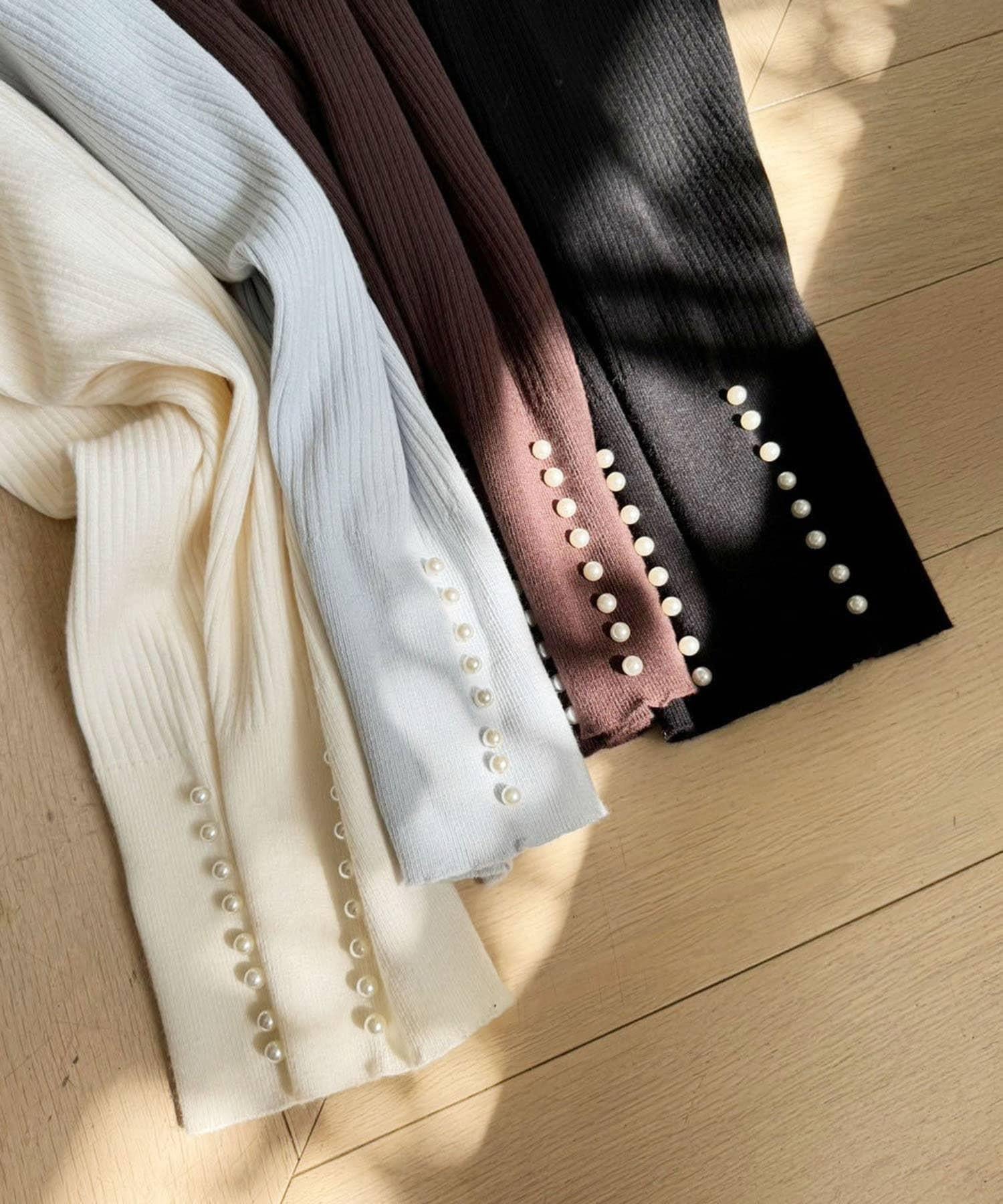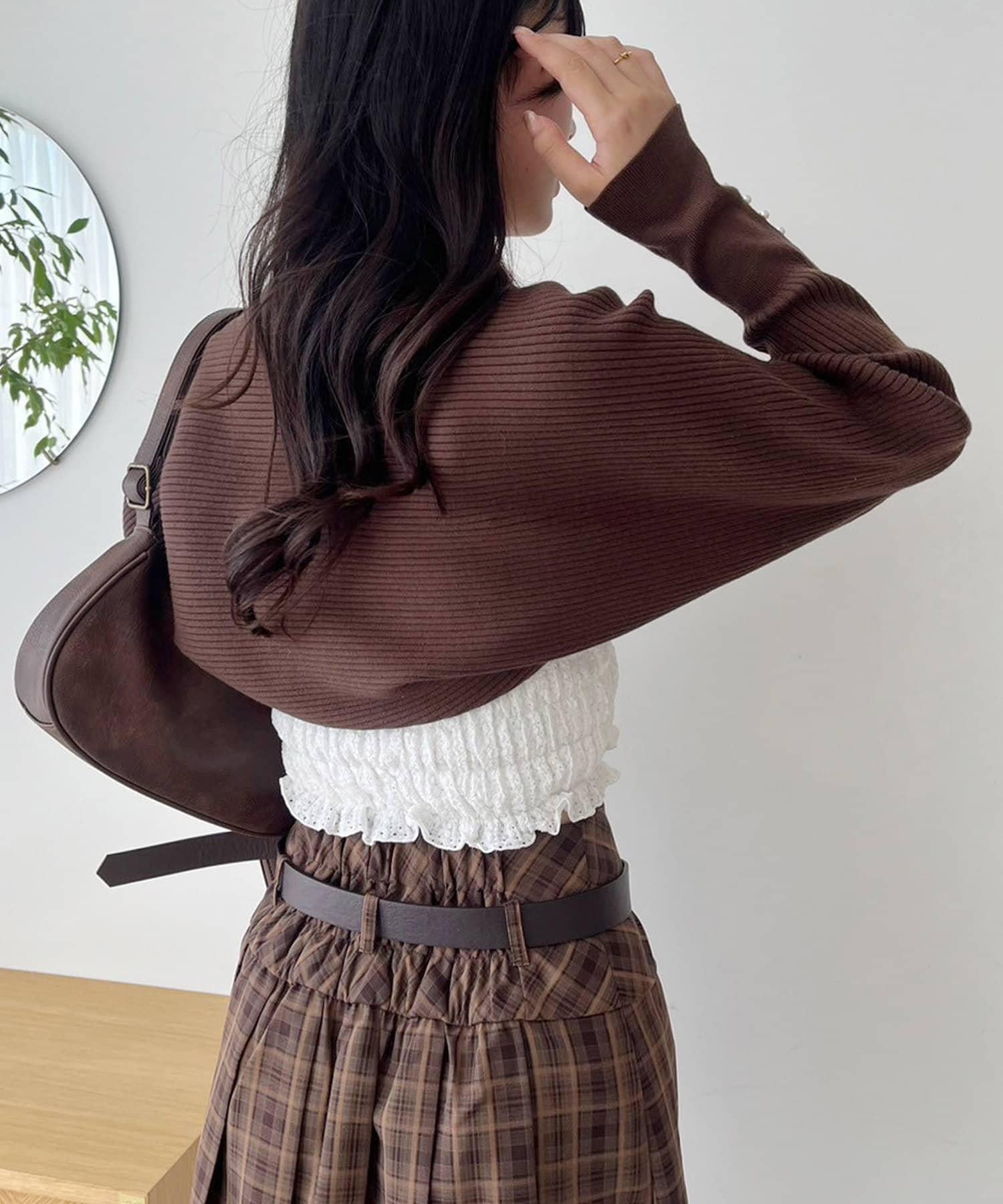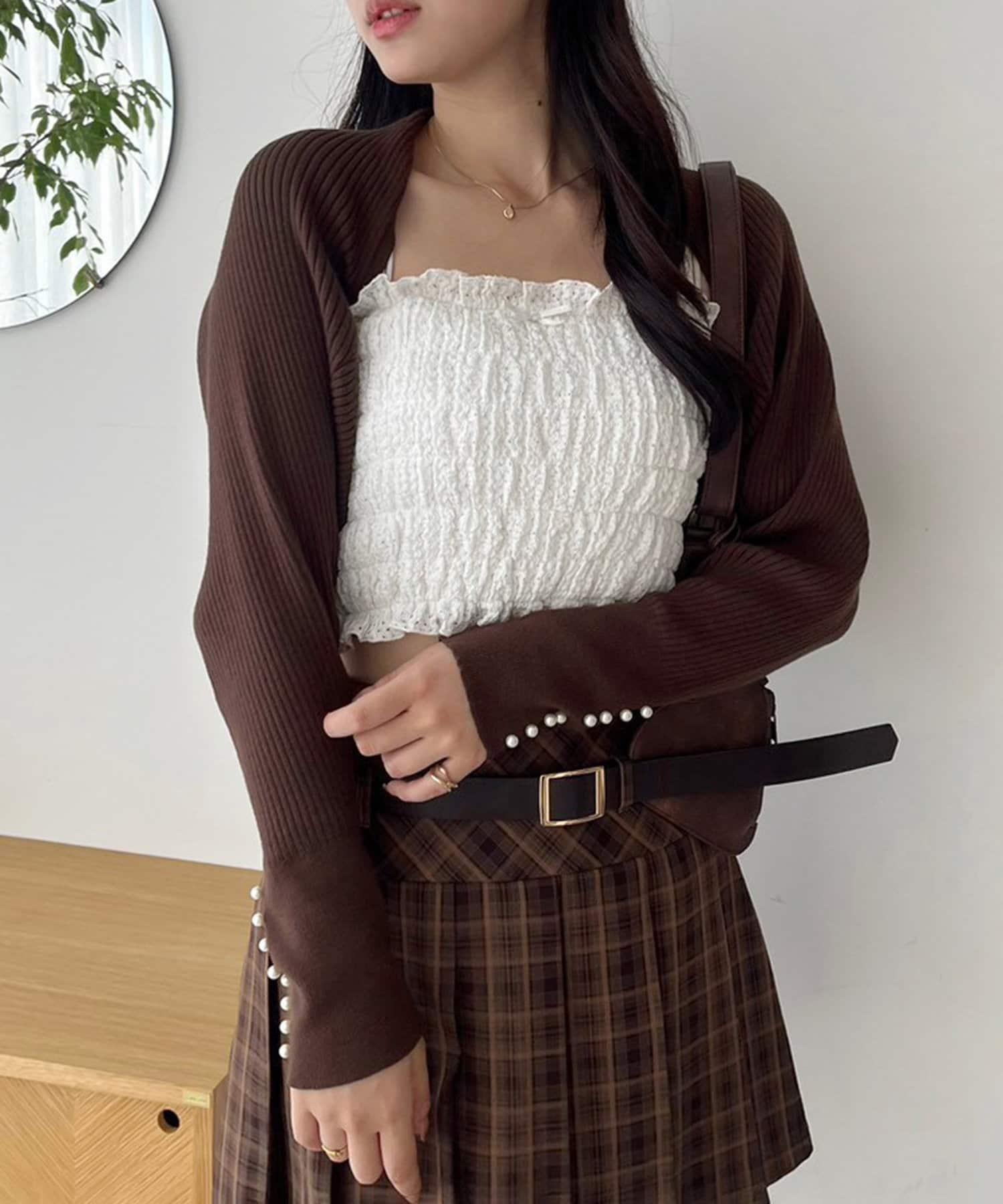 短款長袖開衫外觀舒適,袖子上的珍珠鈕釦增添了一絲優雅。
