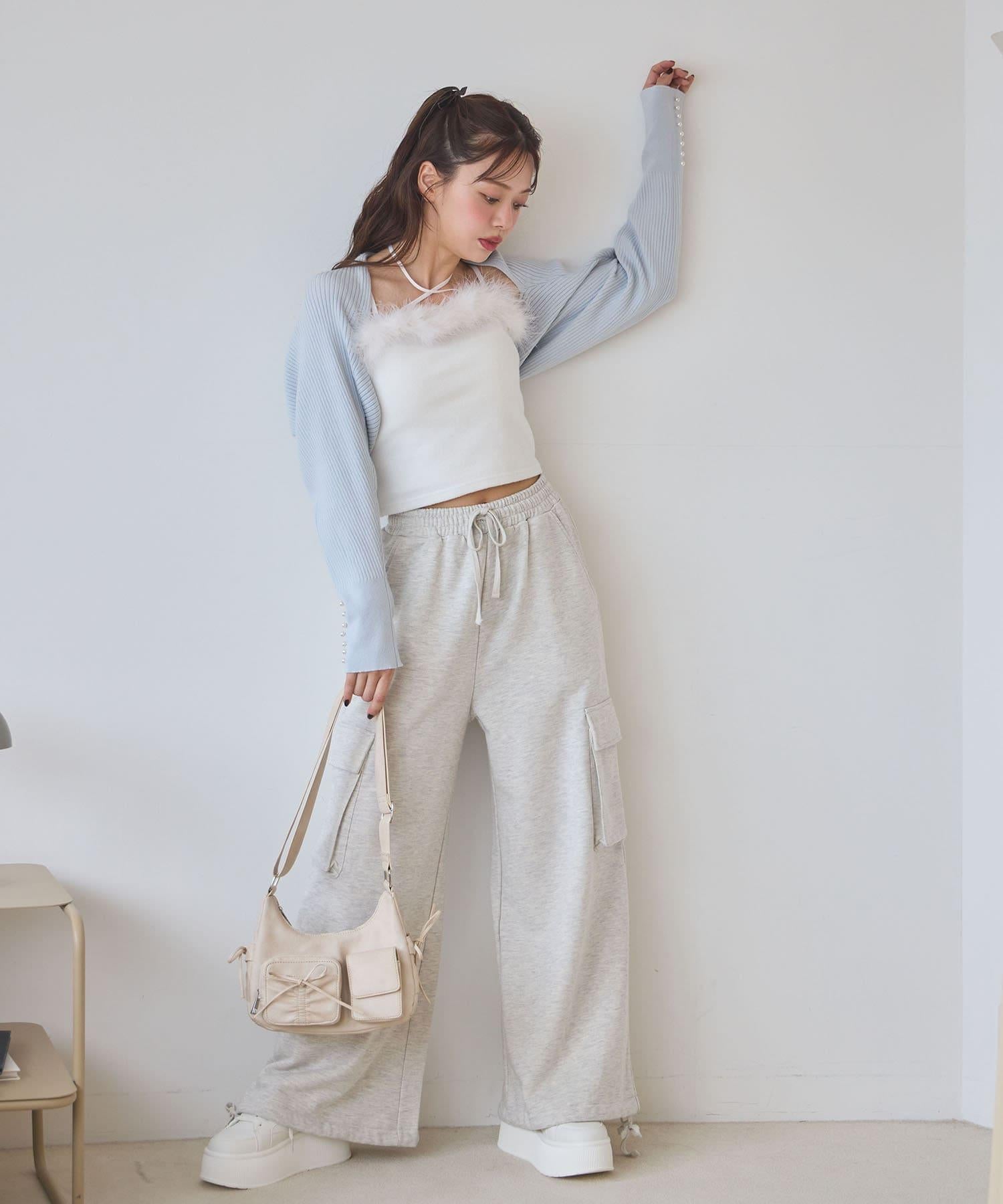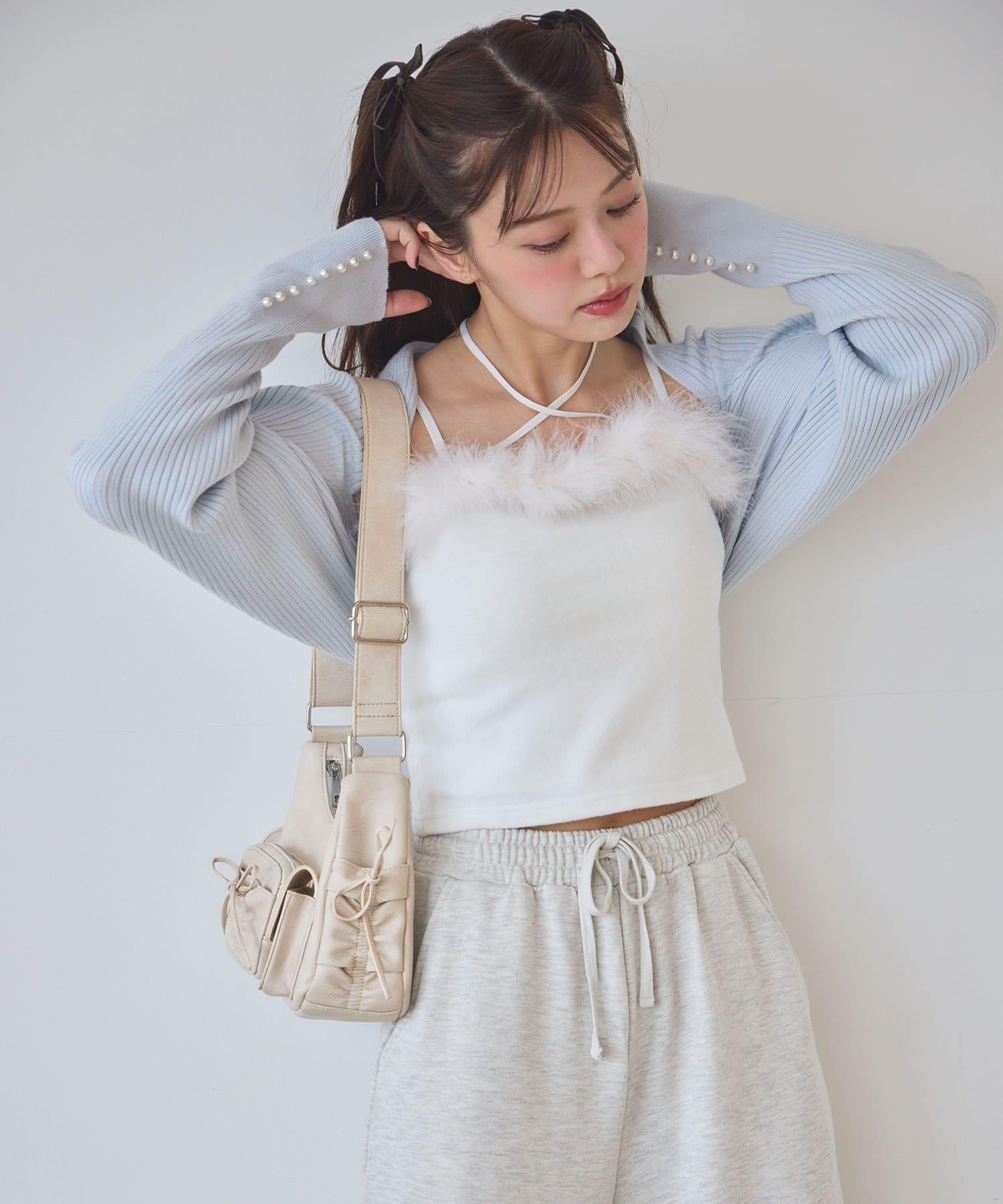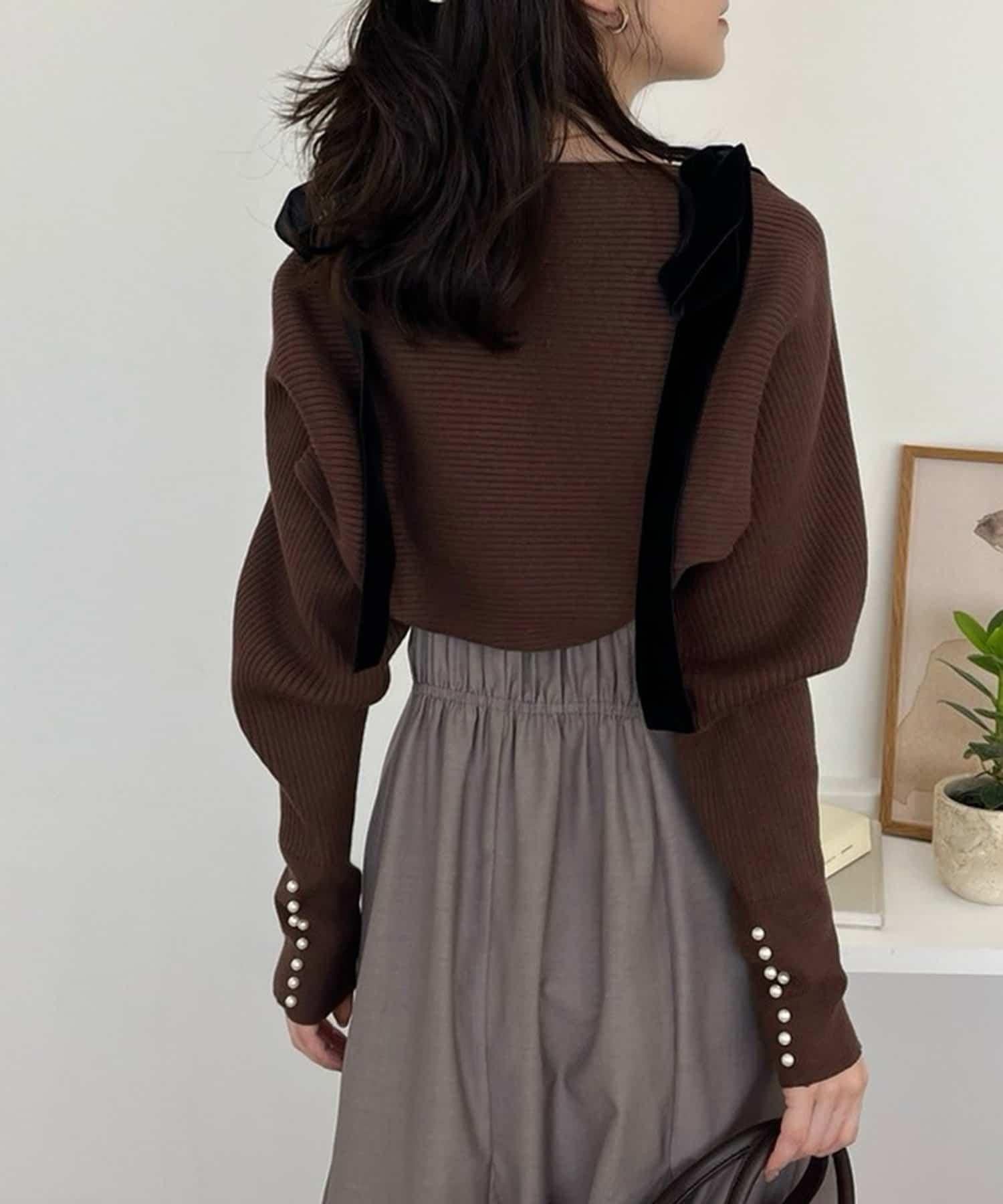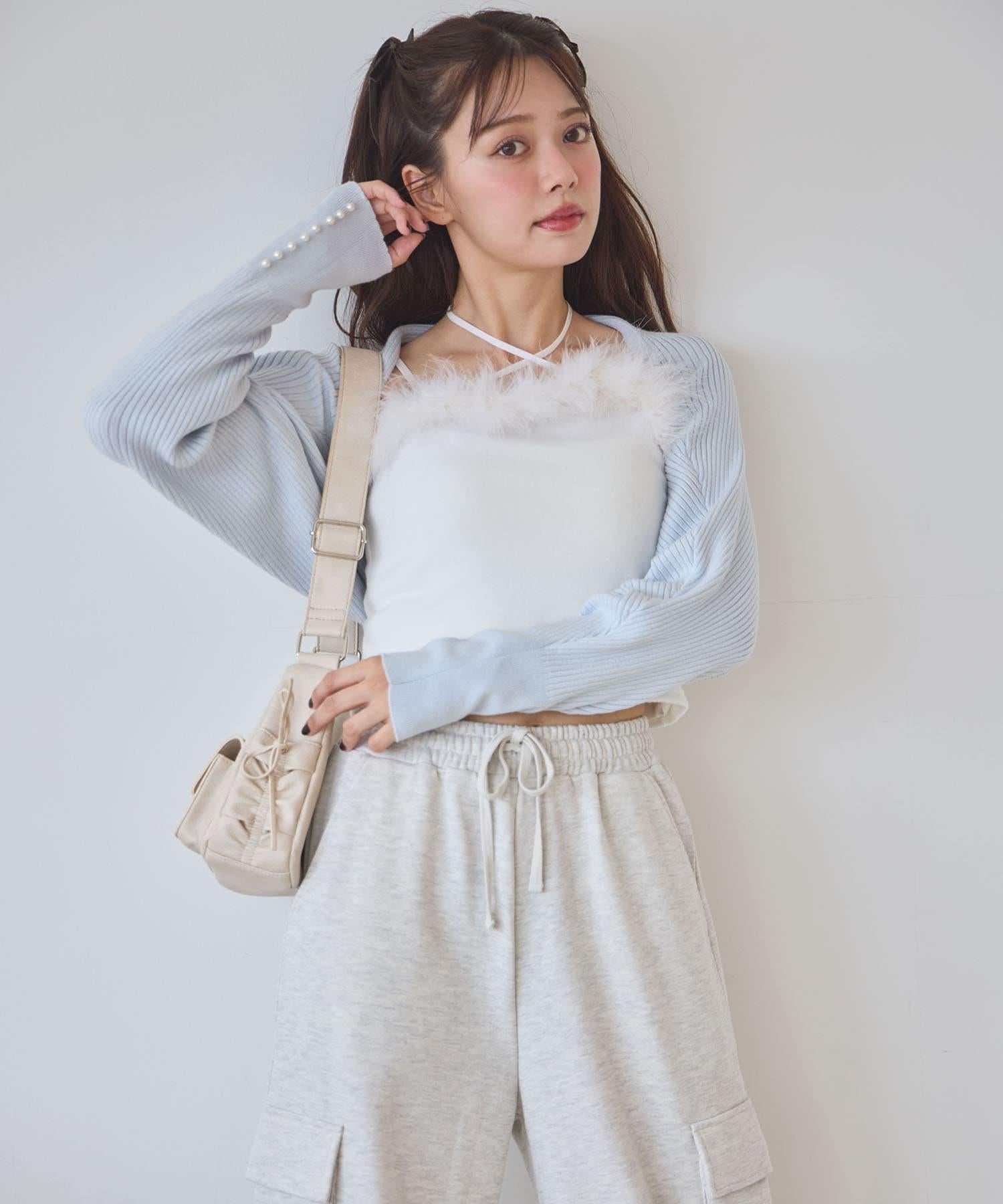 短款長袖開衫外觀舒適,袖子上的珍珠鈕釦增添了一絲優雅。