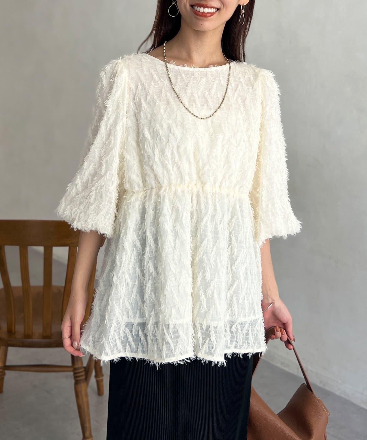立體感適中的蓬鬆袖子和從胸口以下接縫處向下延伸的喇叭形線條,給人以女性化的印象!