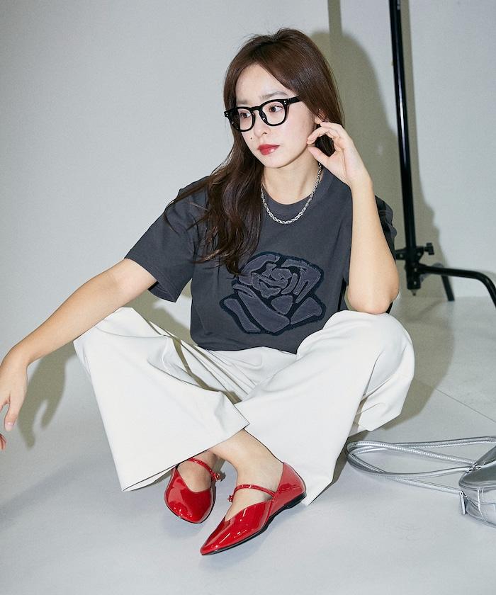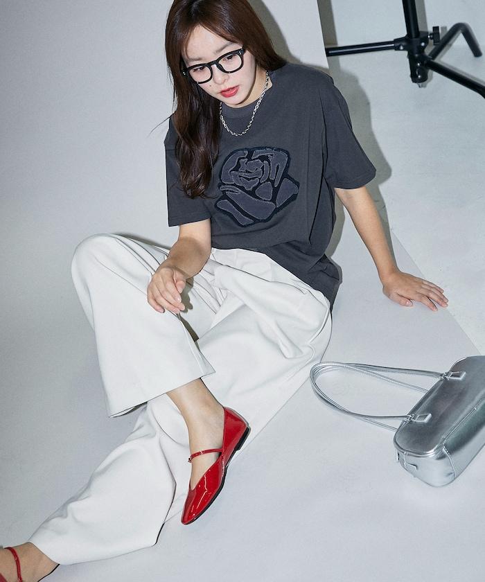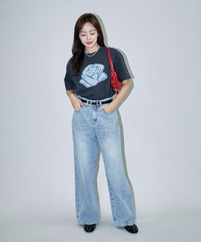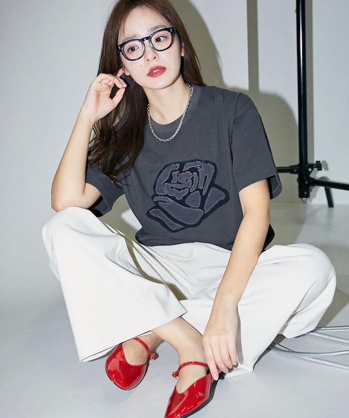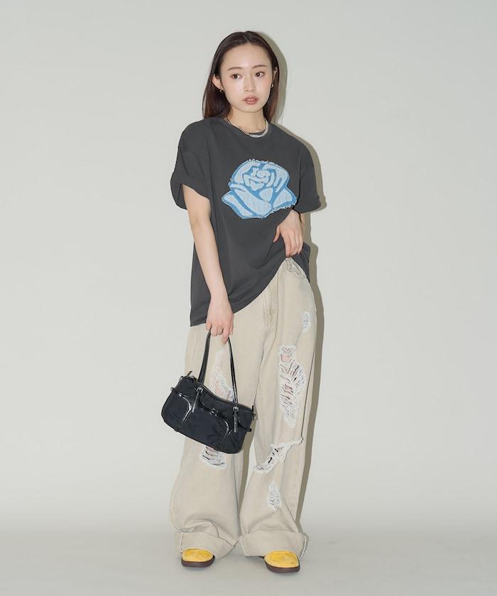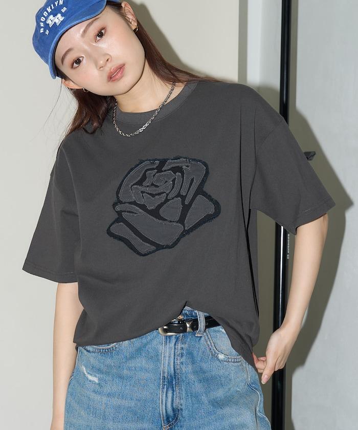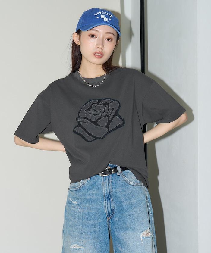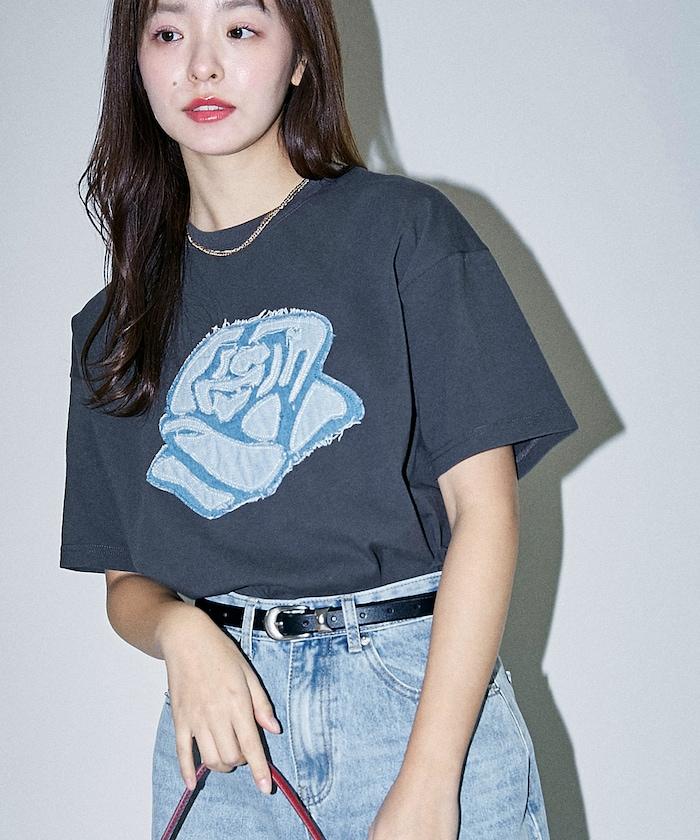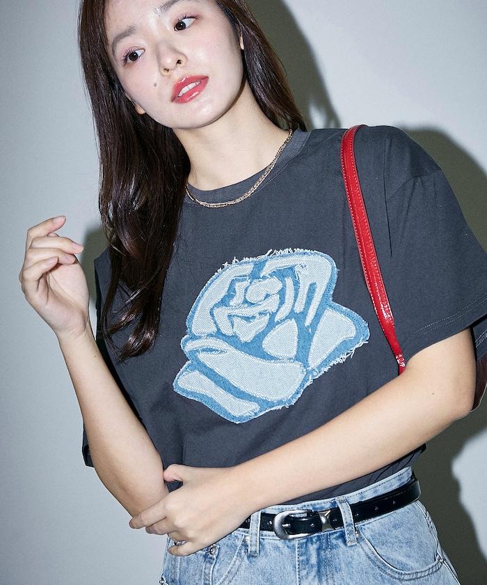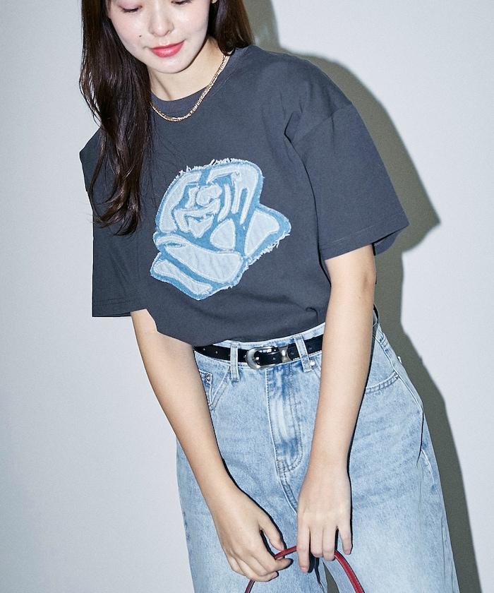 這款 T 恤通過層疊的牛仔面料表現出立體的玫瑰圖案。