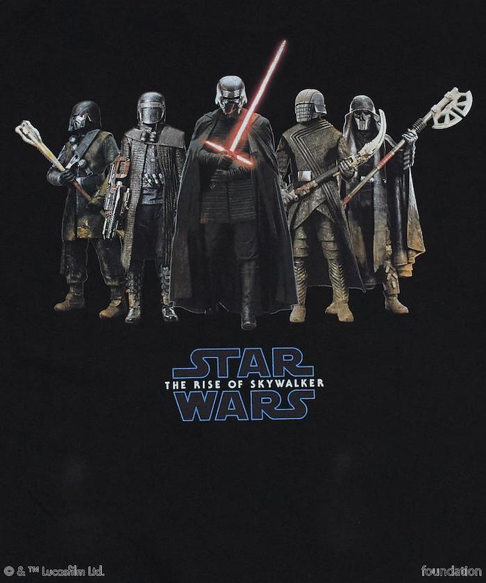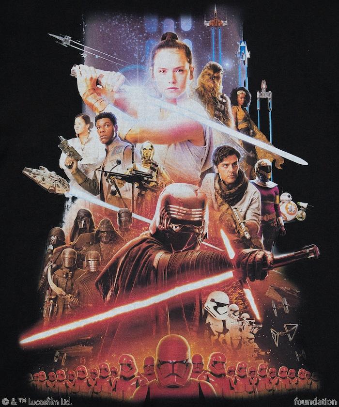 來自《星球大戰:天行者的黎明(第 9 集)》,正面是 "蕾伊 "和 "凱洛-倫 "手持光劍的全體演員海報圖,背面是以 "凱洛-倫 "為中心的 "倫之夜 "印花。