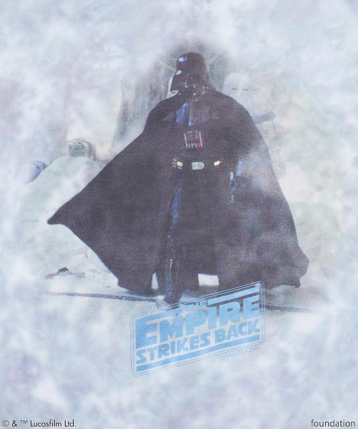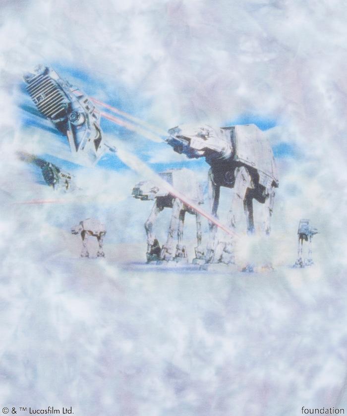 這款單品出自《星球大戰:帝國反擊戰(第 5 集)》,主體採用扎染工藝,印有叛軍聯盟在冰雪星球霍斯建造回聲基地的畫面。正面印有帝國四足戰車 "AT-AT Walker "與反叛聯盟 "雪地飛車 "之間的戰鬥,背面印有 "達斯-維達 "和專門從事寒冷天氣行動的 "雪地部隊 "入侵回聲基地的場景。