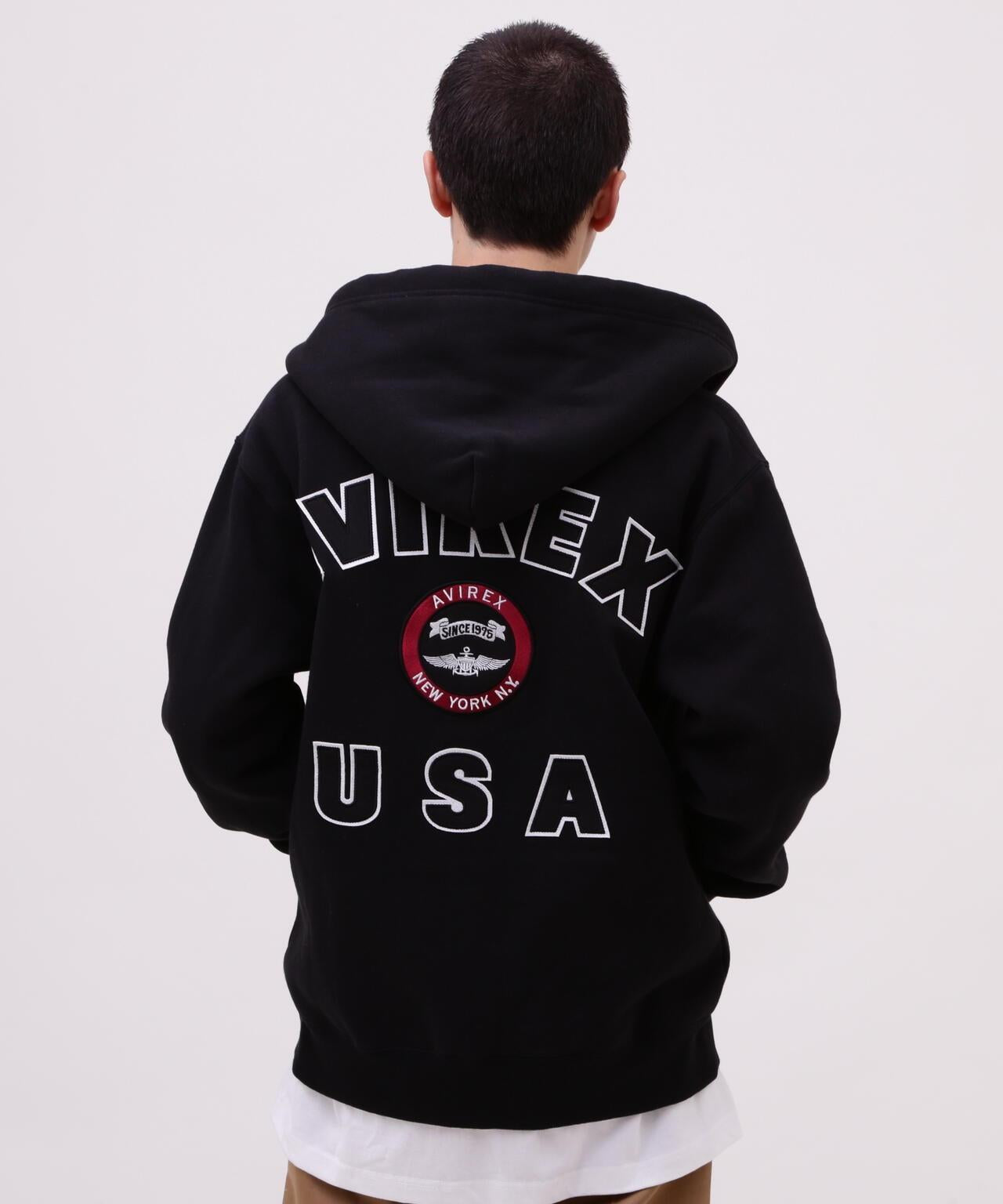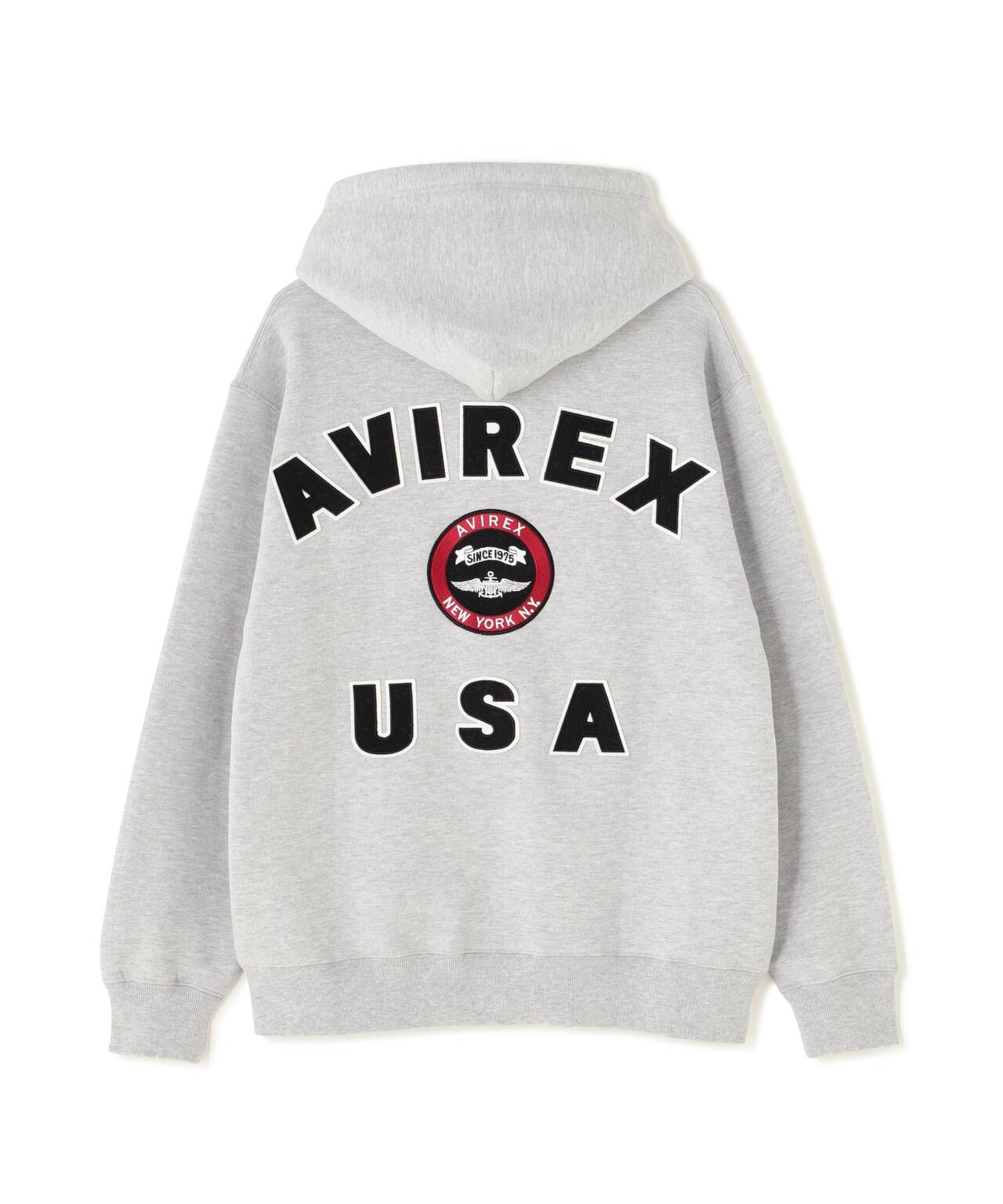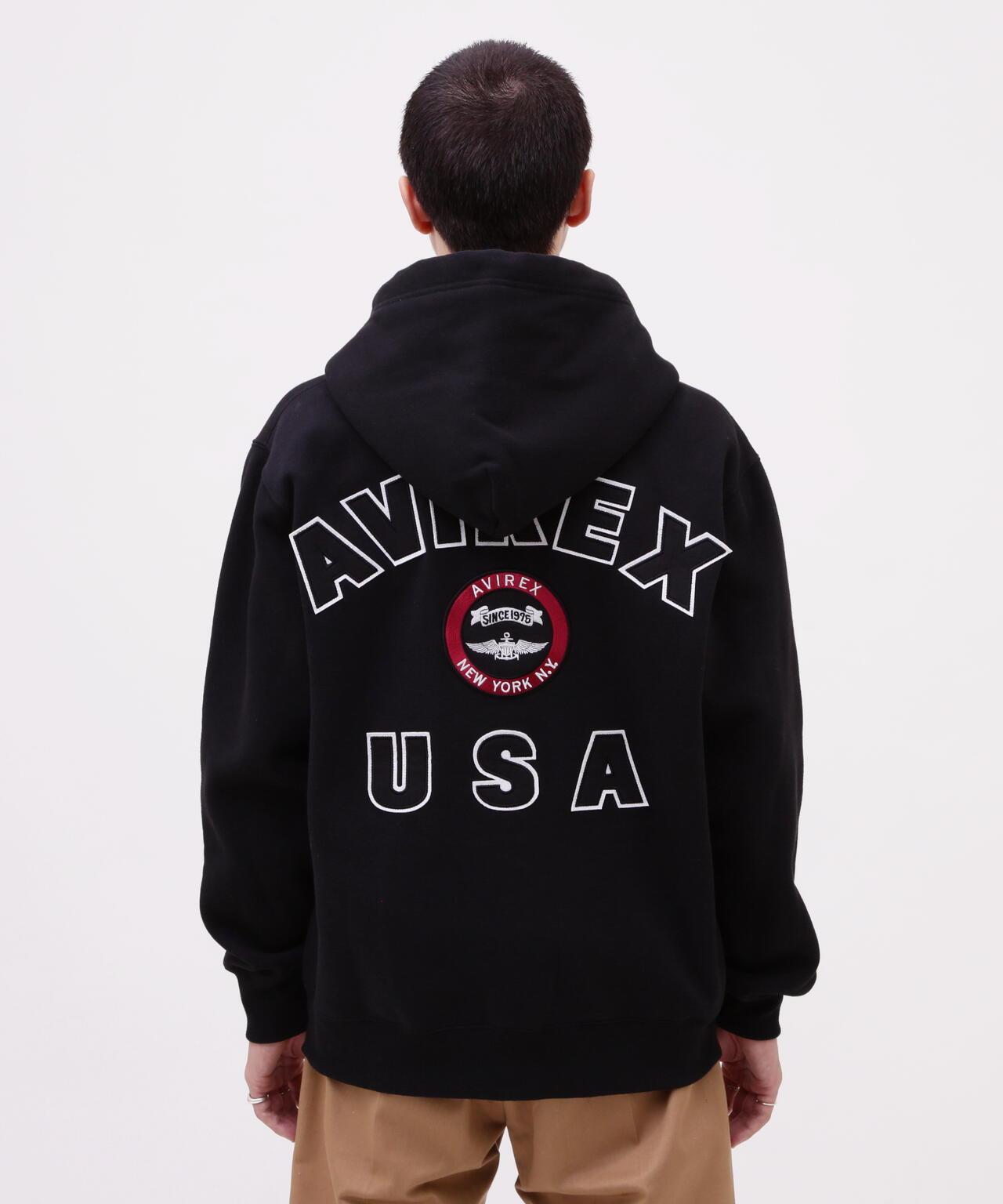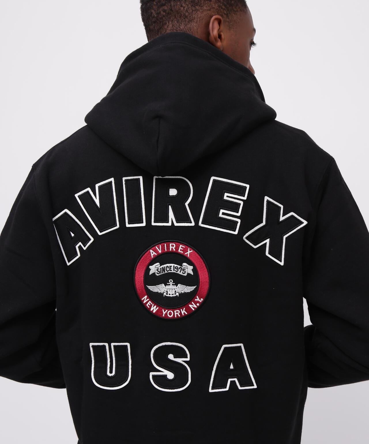 AVIREX VARSITY] 這是一個以美好的美國為主題的運動系列,Avirex 獨特的色彩和富有創意的圖案設計受到以 HIPHOP 圈為主的當紅藝術家和運動員的青睞,並已擴展成為美國年輕人的身份品牌。該品牌已發展成為美國年輕人的身份象徵品牌。經典而永恆的 AVIREX VARSITY 服裝繼續受到所有崇尚美國英雄精神的人們的支持,無論性別或國籍。<產品細節> - 65% 棉,35% 滌綸,後背拉鍊連帽衫,背後有品牌標誌圖案,3D 立體刺繡貼花。