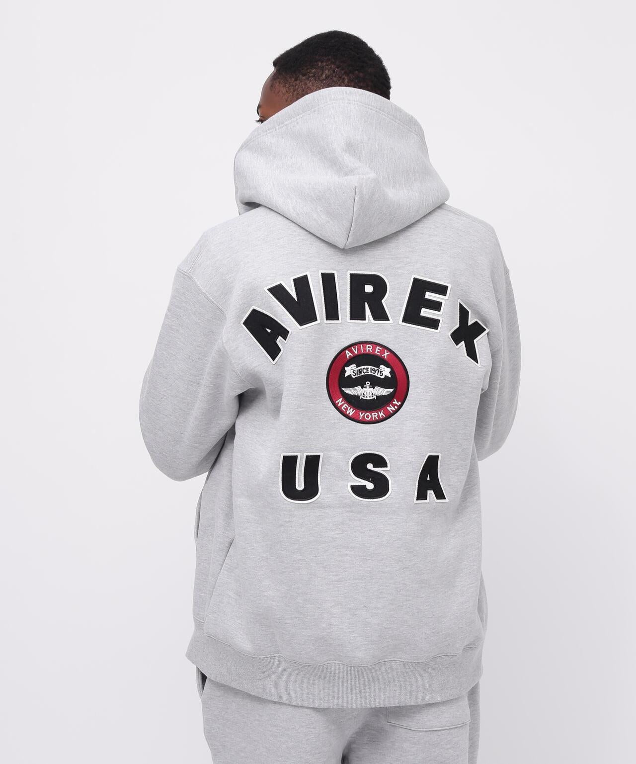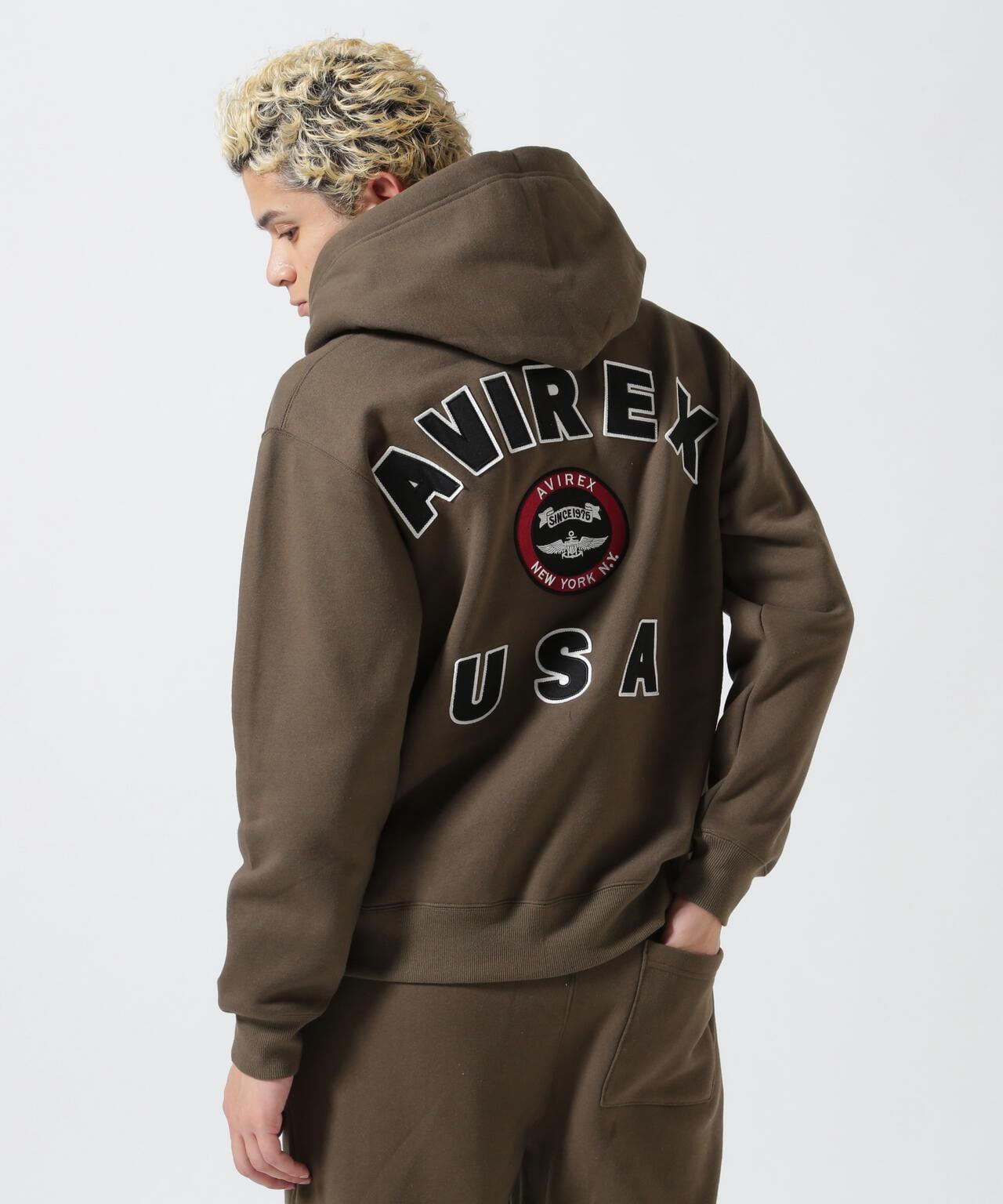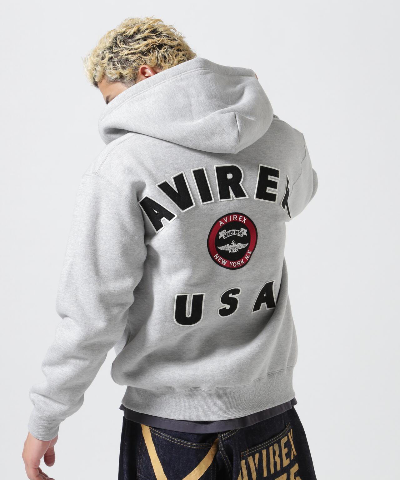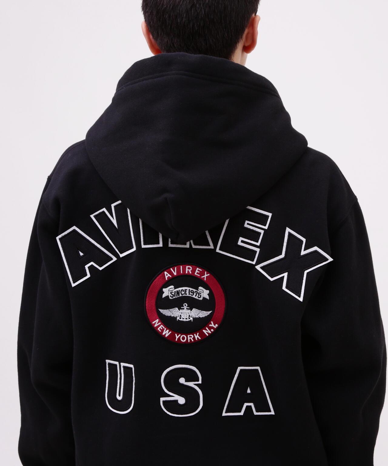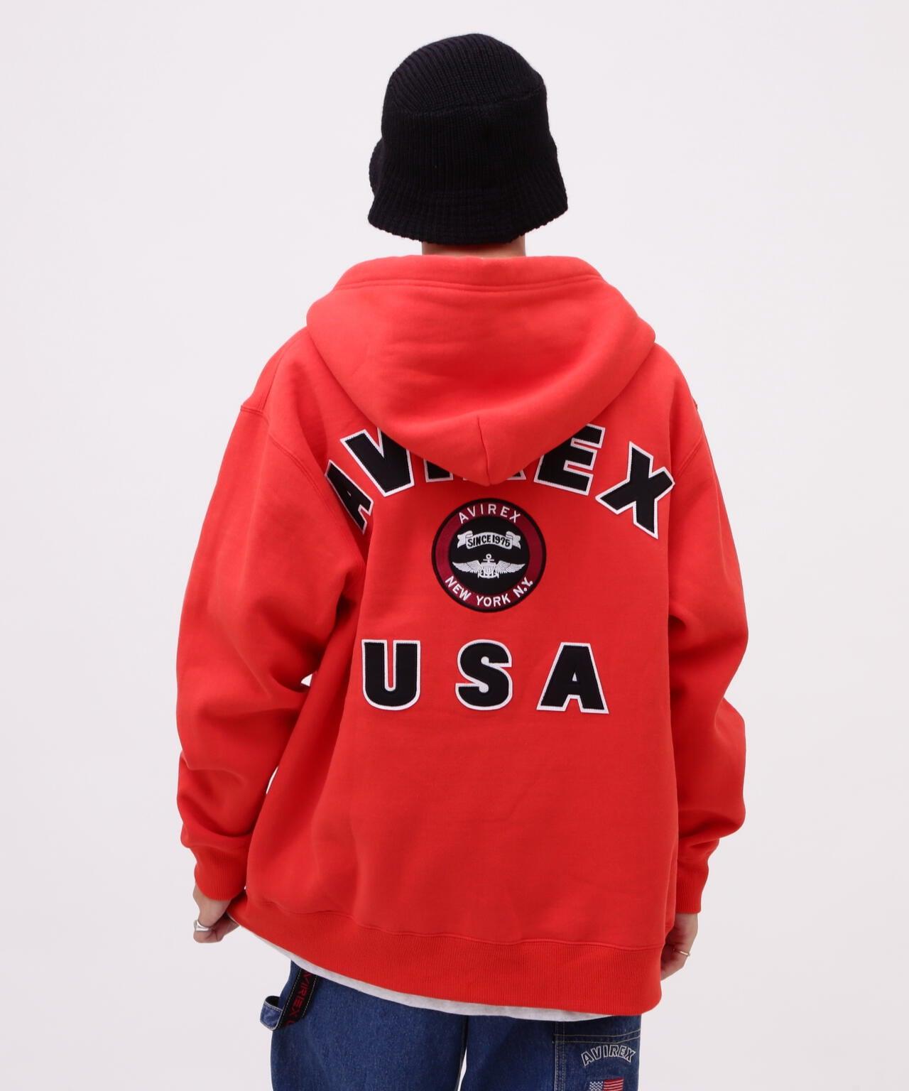 AVIREX VARSITY] 這是一個以美好的美國為主題的運動系列,Avirex 獨特的色彩和富有創意的圖案設計受到以 HIPHOP 圈為主的當紅藝術家和運動員的青睞,並已擴展成為美國年輕人的身份品牌。該品牌已發展成為美國年輕人的身份象徵品牌。經典而永恆的 AVIREX VARSITY 服裝繼續受到所有崇尚美國英雄精神的人們的支持,無論性別或國籍。<產品細節> - 65% 棉,35% 滌綸,後背拉鍊連帽衫,背後有品牌標誌圖案,3D 立體刺繡貼花。