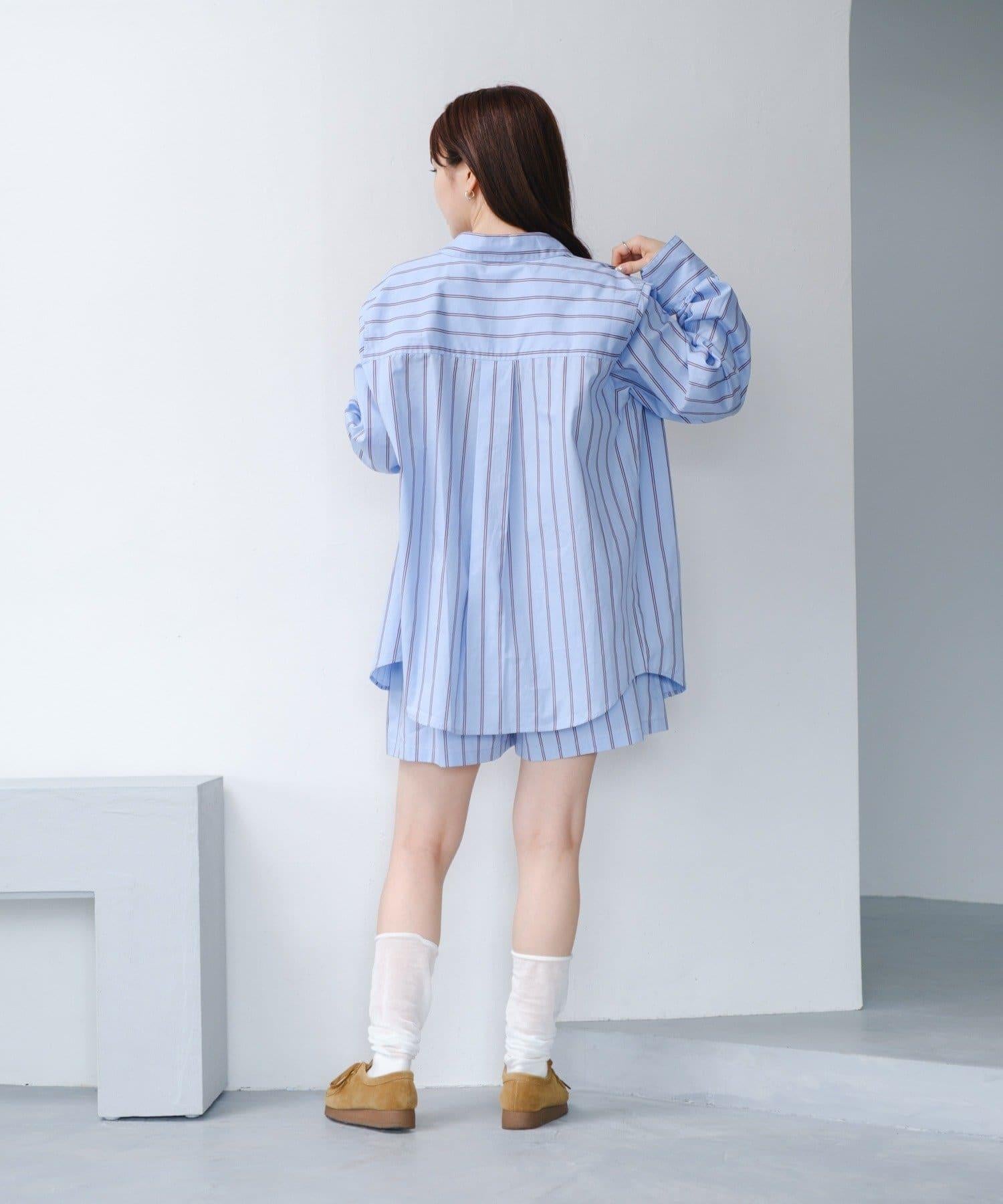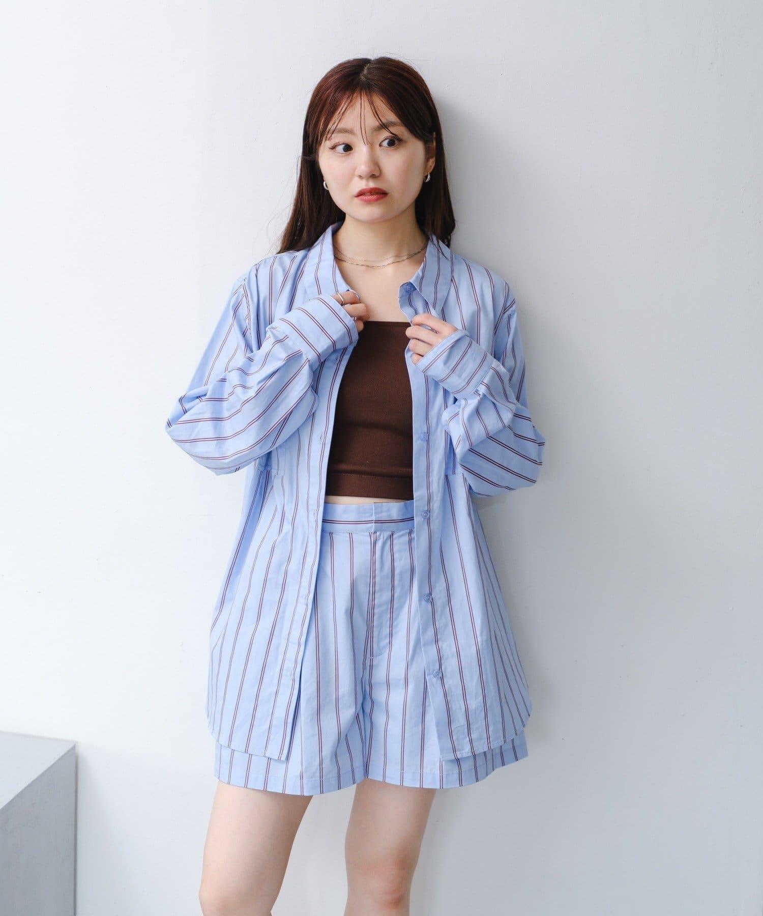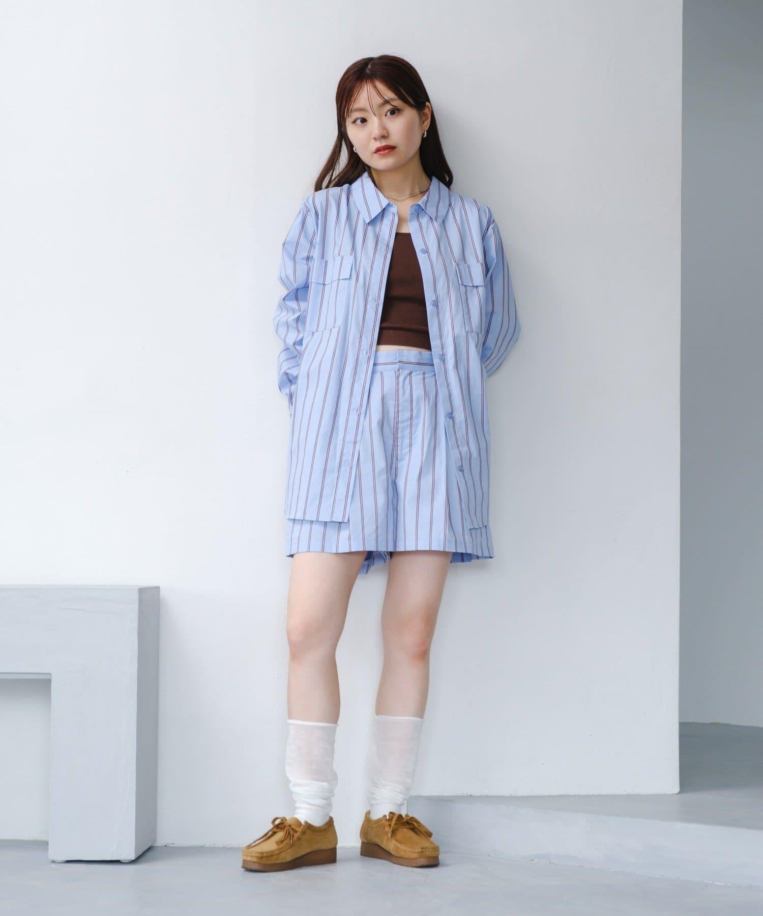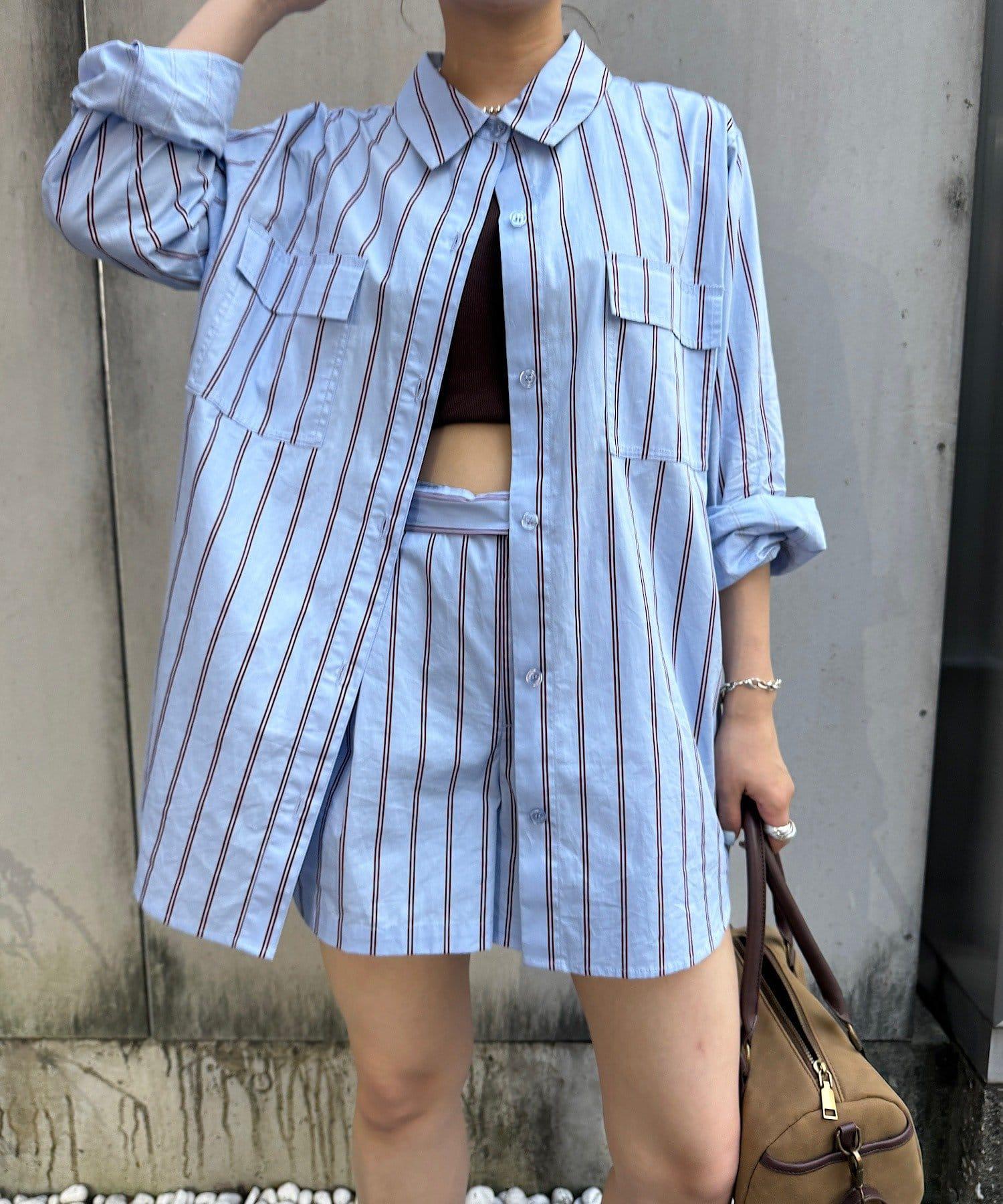 將相同圖案的條紋襯衫與梭織上衣搭配,打造輕鬆的套裝風格。